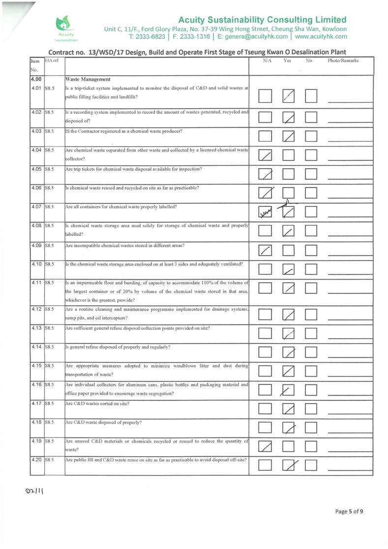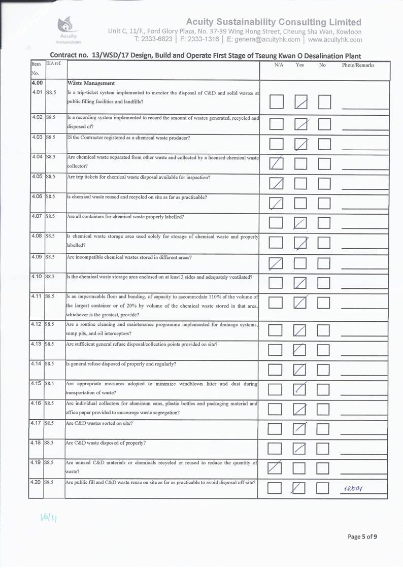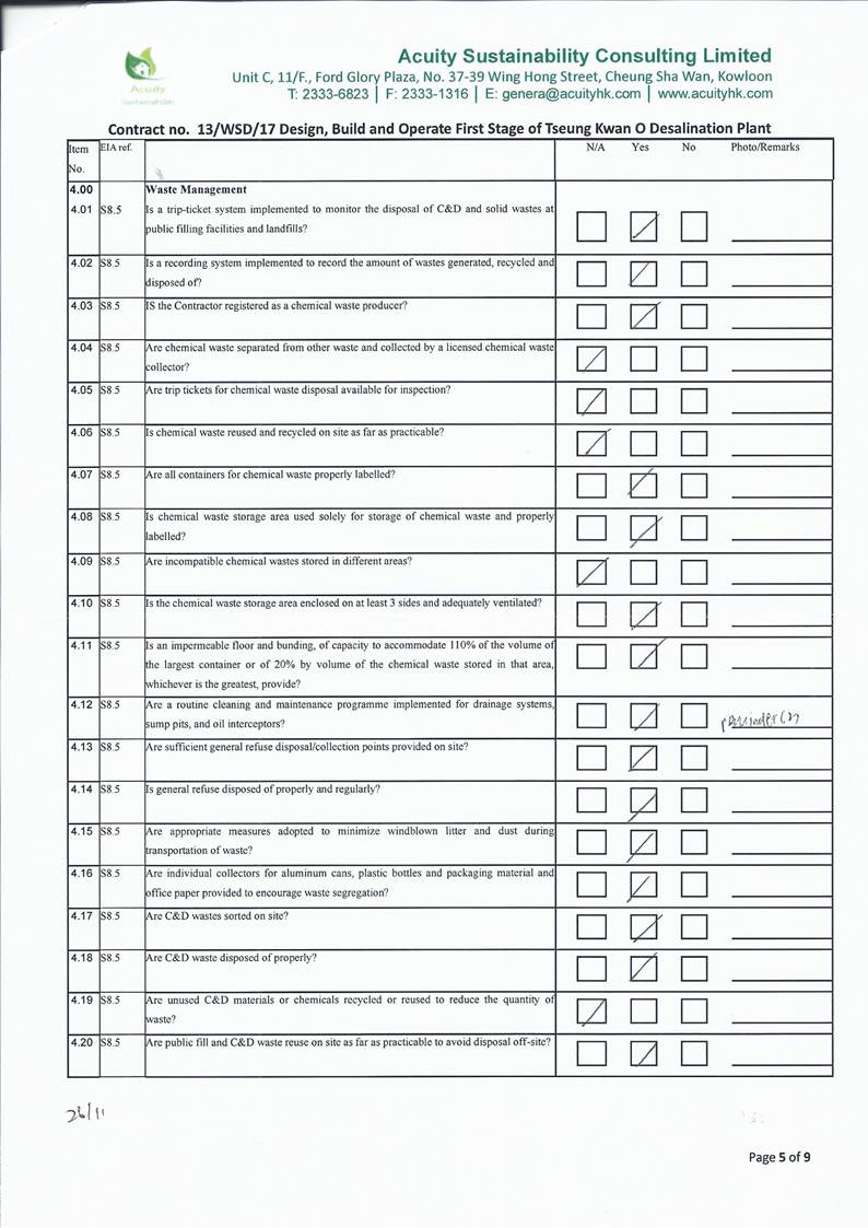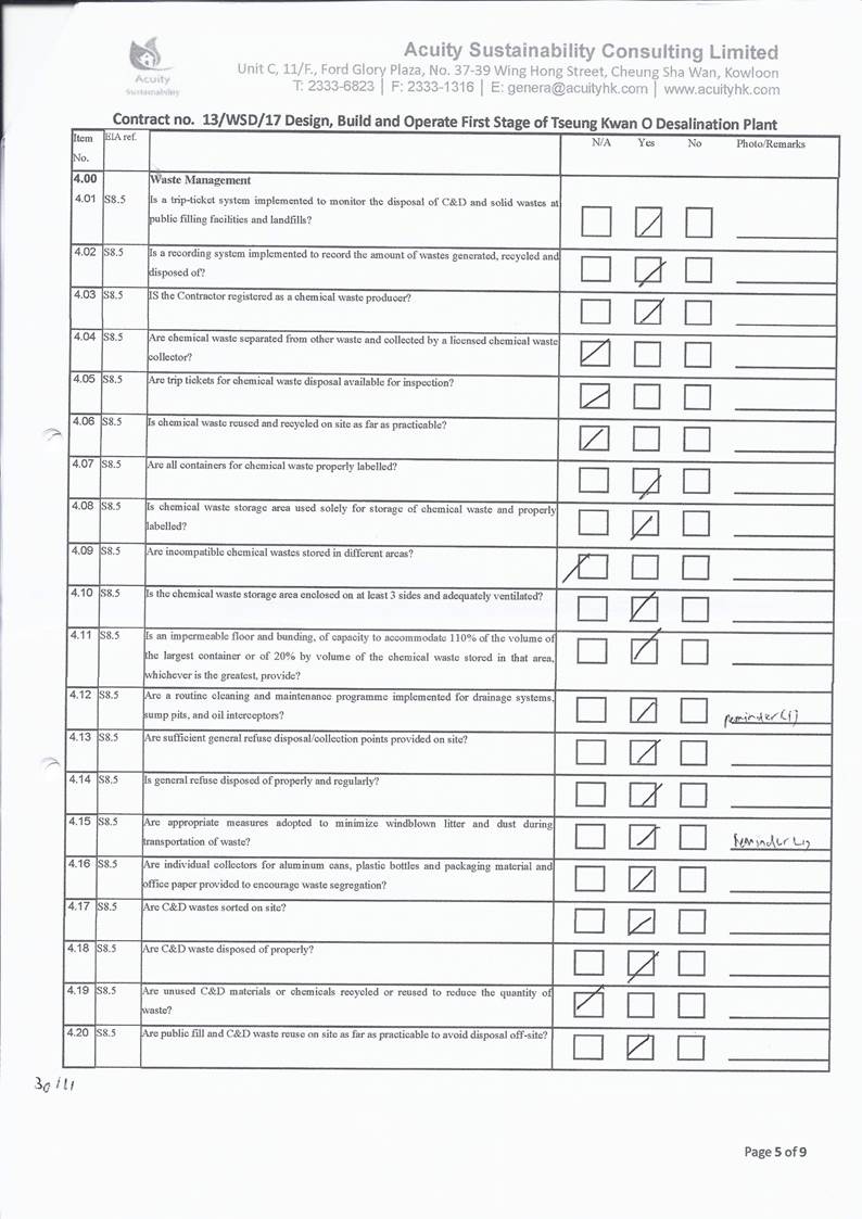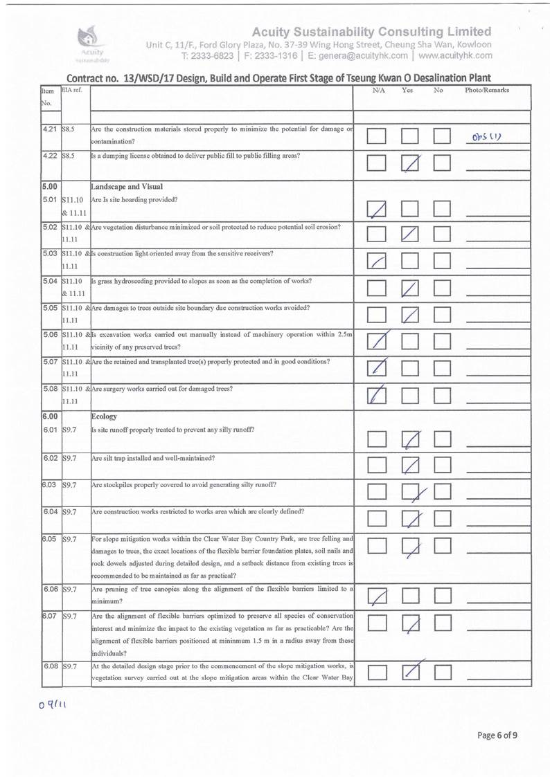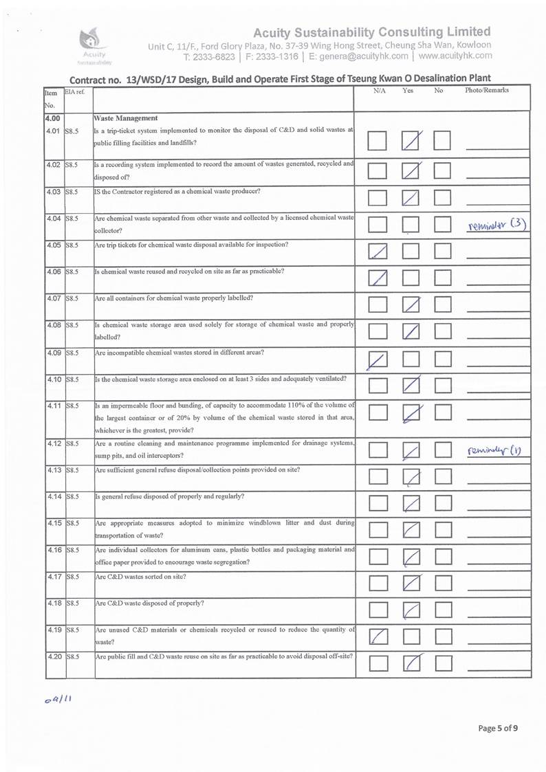 A15.Joint site inspections of the construction work by ET and IEC were carried out on 2, 9, 16, 26 and 30 November 2021 to audit the mitigation measures implementation status. Observations were recorded in the site inspection checklists and provided to the contractors together with the appropriate follow-up actions where necessary.