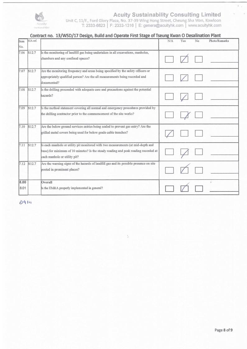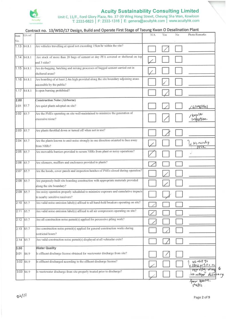 A2. In accordance with the Environmental Monitoring and Audit (EM&A) Manual for the Project, EM&A works for marine water quality, noise, waste management and ecology should be carried out by Environmental Team (ET), Acuity Sustainability Consulting Limited (ASCL), during the construction phase of the Project.