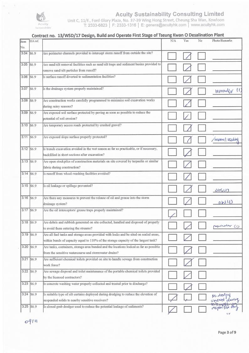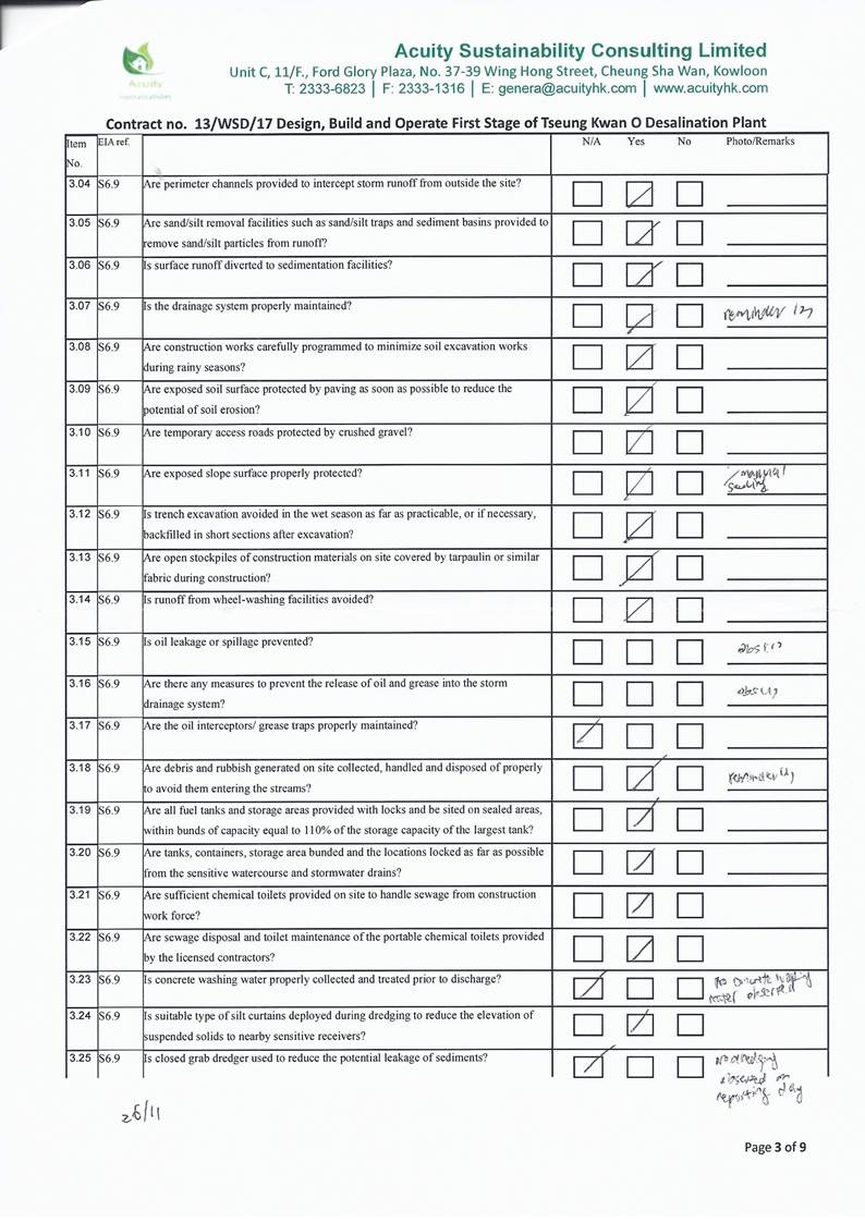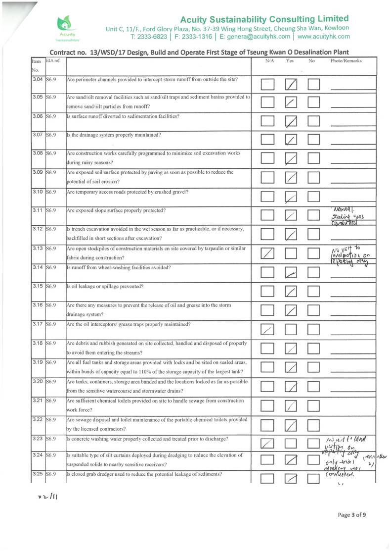 - Deployment of temporary silt curtain in the area where marine construction works were conducted and deployment of water sedimentation tanks for treatment of wastewater at inland areas before discharge