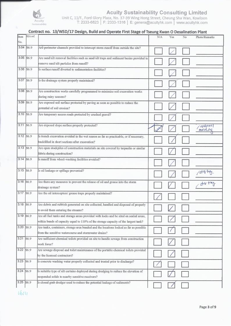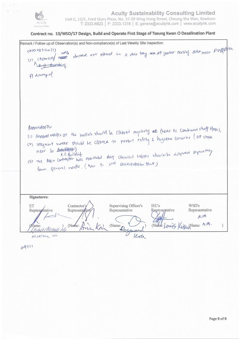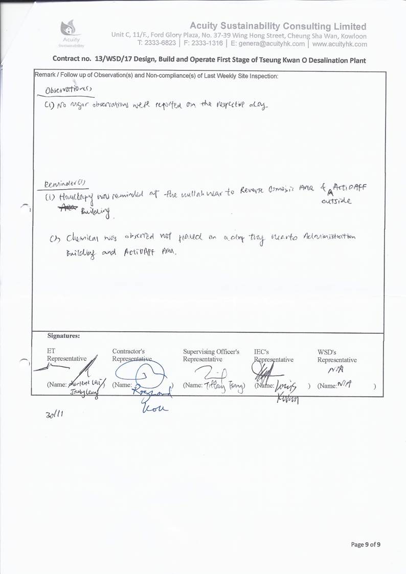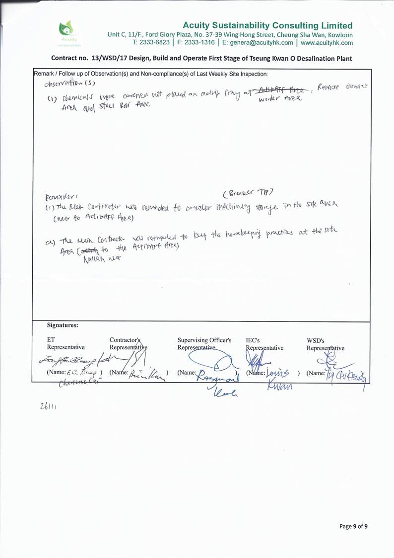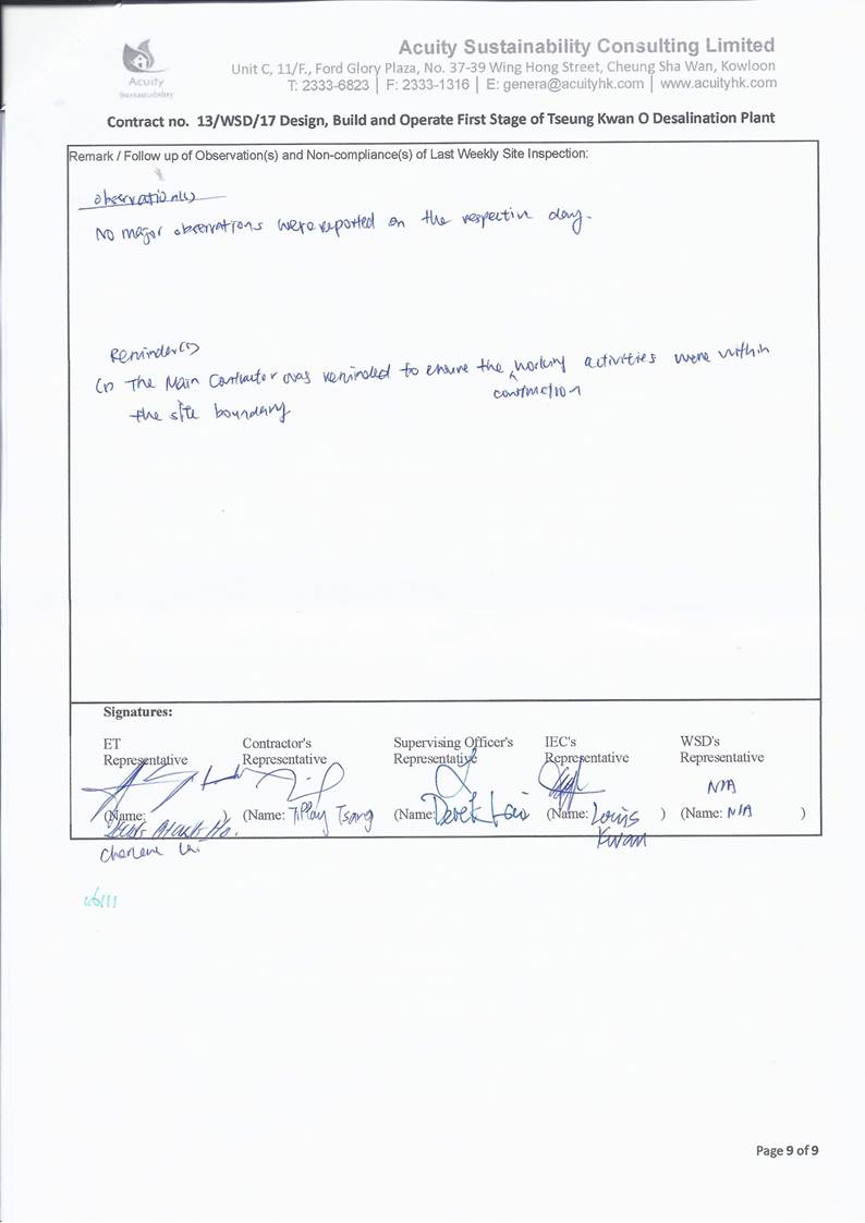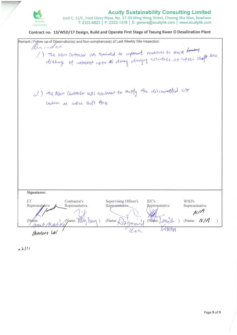 A9. The EM&A works for water quality were conducted during the reporting period in accordance with the EM&A Manual.