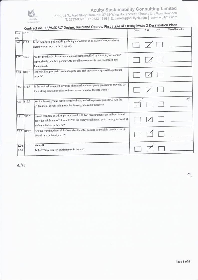A14.In this reporting period, no landfill gas monitoring was recorded. As confirmed with the Main Contractor, the trench at Wan Po Road was all backfilled and was just waiting for asphalt paving. In any case no trench was deeper than 300mm, thus no LFG monitoring would be required for Wan Po Road.