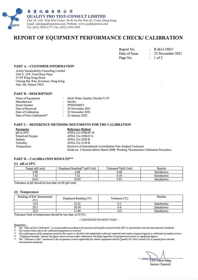 Appendix N Water Quality Equipment Calibration Certificate