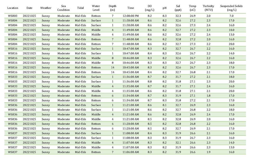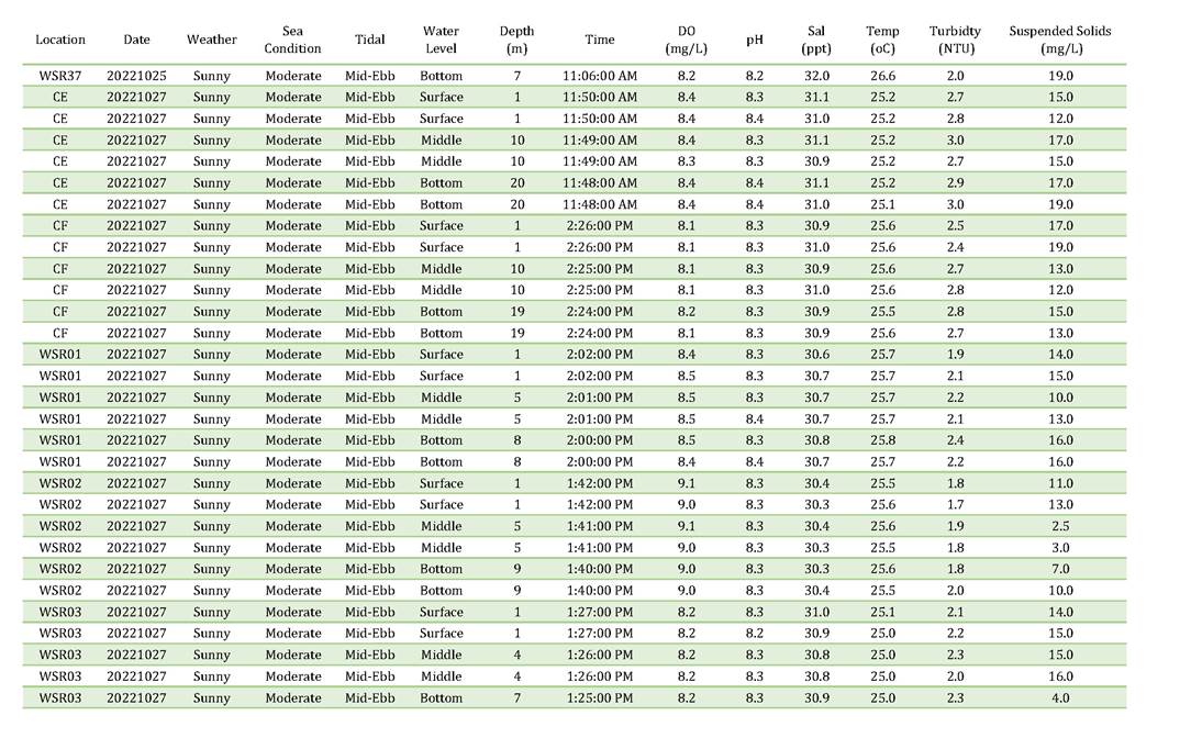 A2. In accordance with the Environmental Monitoring and Audit (EM&A) Manual for the Contract, EM&A works for marine water quality, noise, waste management and ecology should be carried out by Environmental Team (ET), Acuity Sustainability Consulting Limited (ASCL), during the construction phase of the Contract.