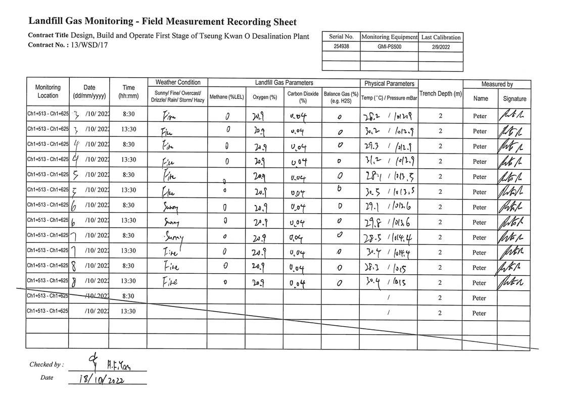 A12. In this reporting period, 16 times of landfill gas monitoring were conducted at Wan Po Road (Ch1+513 - Ch1+625). No action and limit level exceedance was recorded.