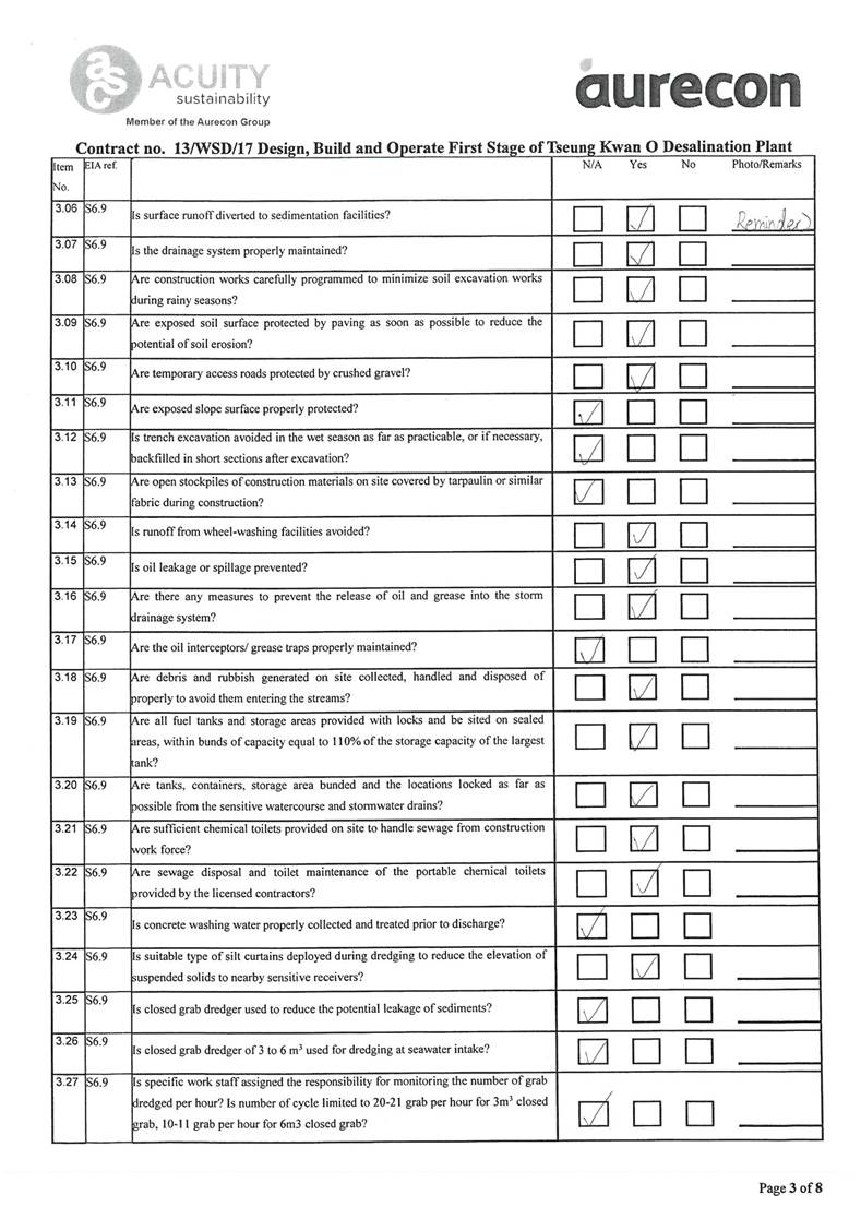 - Impact on water quality from marine construction works and inland construction works.
