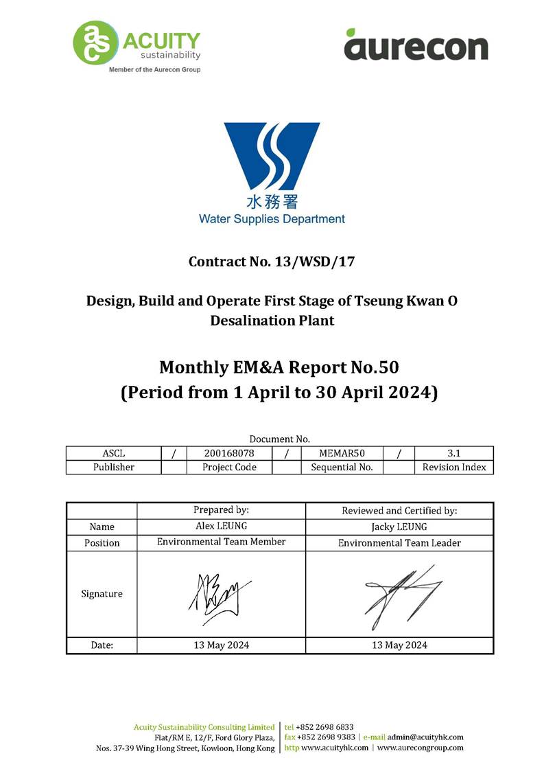 A3. This is the 50th Monthly EM&A Report, prepared by ASCL, for the Contract summarizing the monitoring results and audit findings of the EM&A programme at and around Tseung Kwan O Area 137 (TKO 137) during the reporting period from 1 April to 30 April 2024.