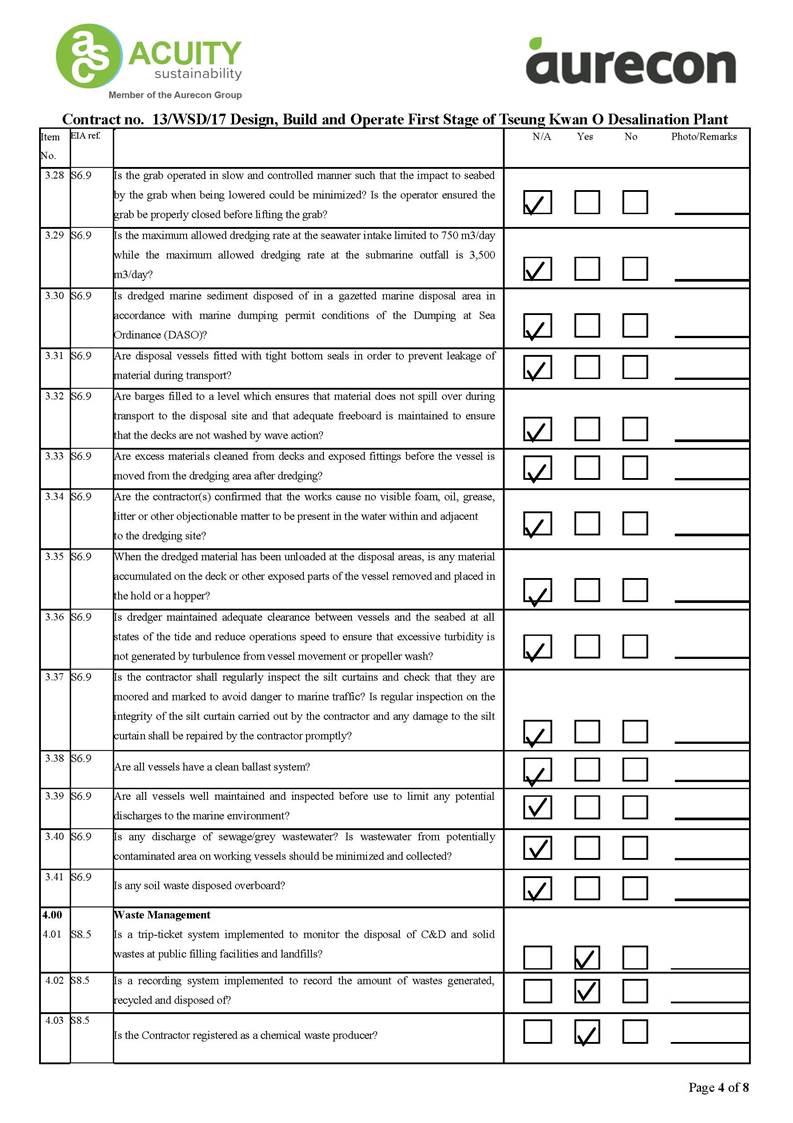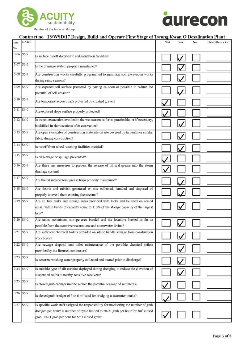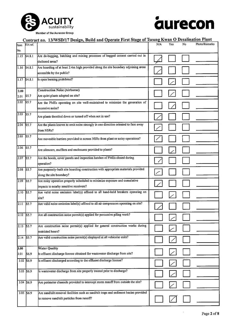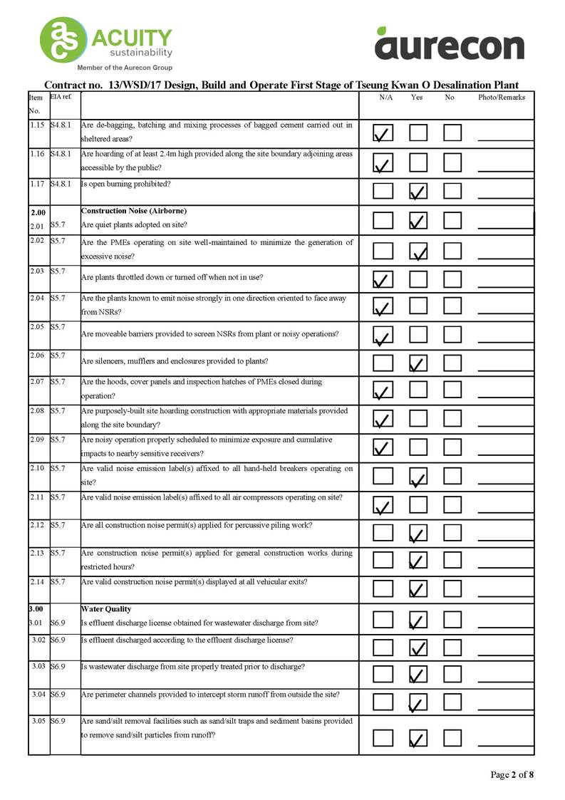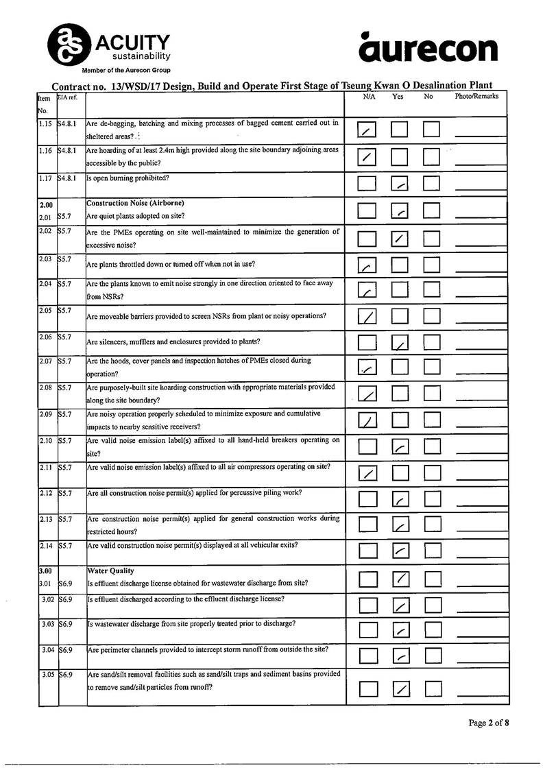 A2. In accordance with the Environmental Monitoring and Audit (EM&A) Manual for the Contract, EM&A works for marine water quality, noise, waste management and ecology should be carried out by Environmental Team (ET), Acuity Sustainability Consulting Limited (ASCL), during the construction phase of the Contract.