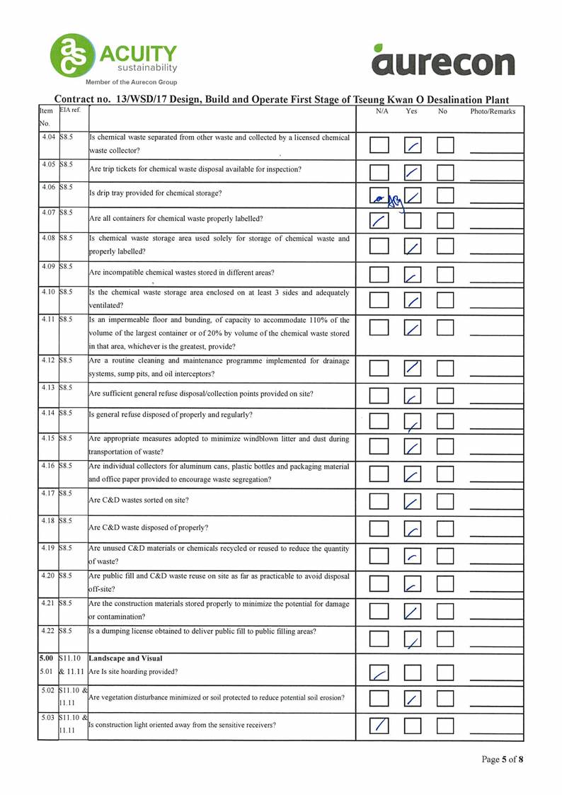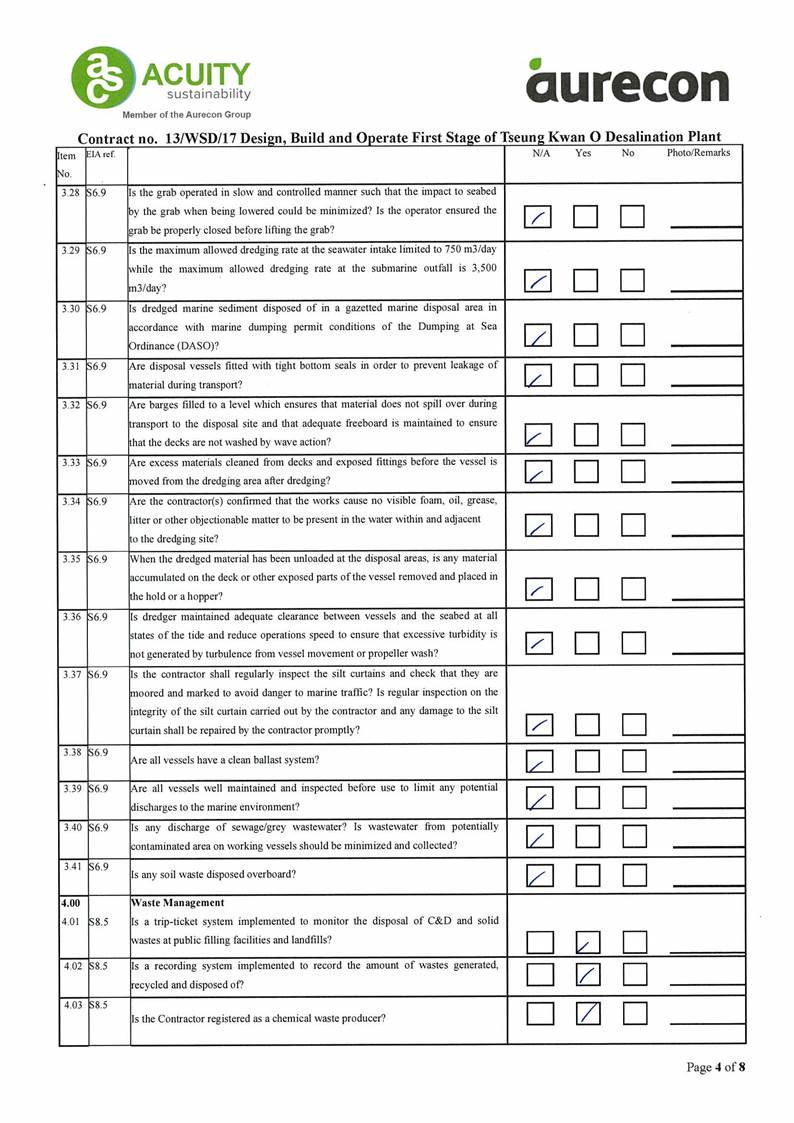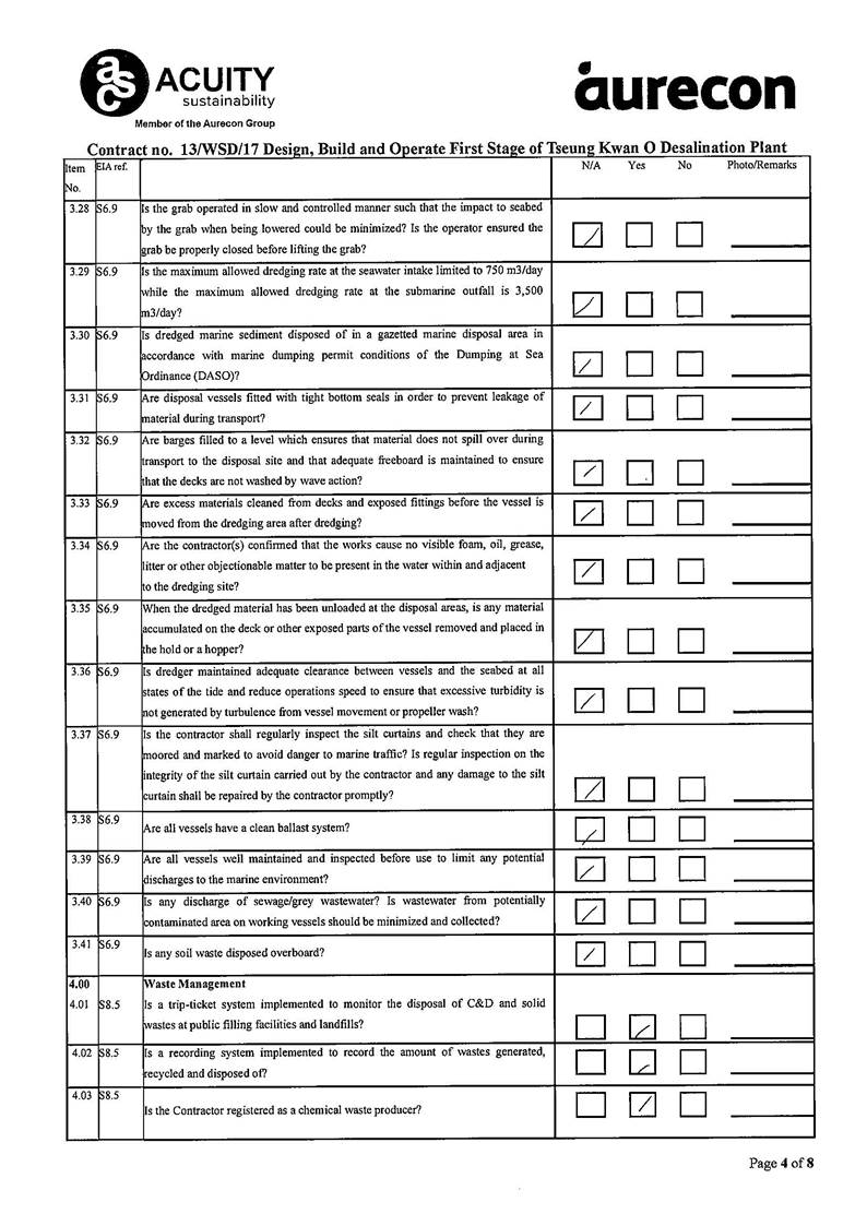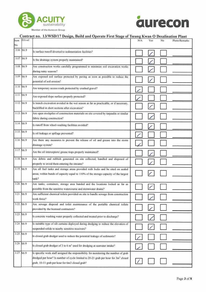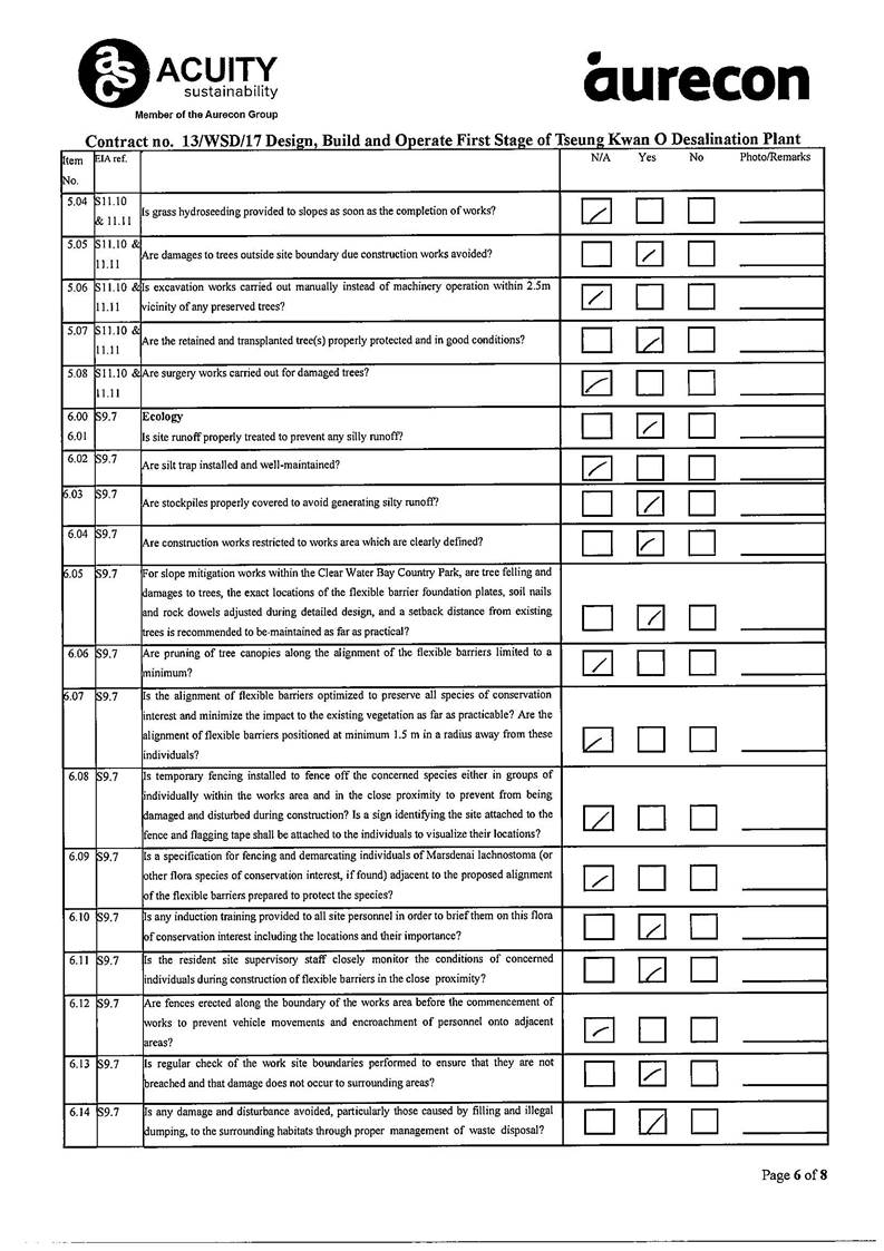 A2. In accordance with the Environmental Monitoring and Audit (EM&A) Manual for the Contract, EM&A works for marine water quality, noise, waste management and ecology should be carried out by Environmental Team (ET), Acuity Sustainability Consulting Limited (ASCL), during the construction phase of the Contract.