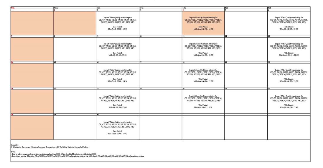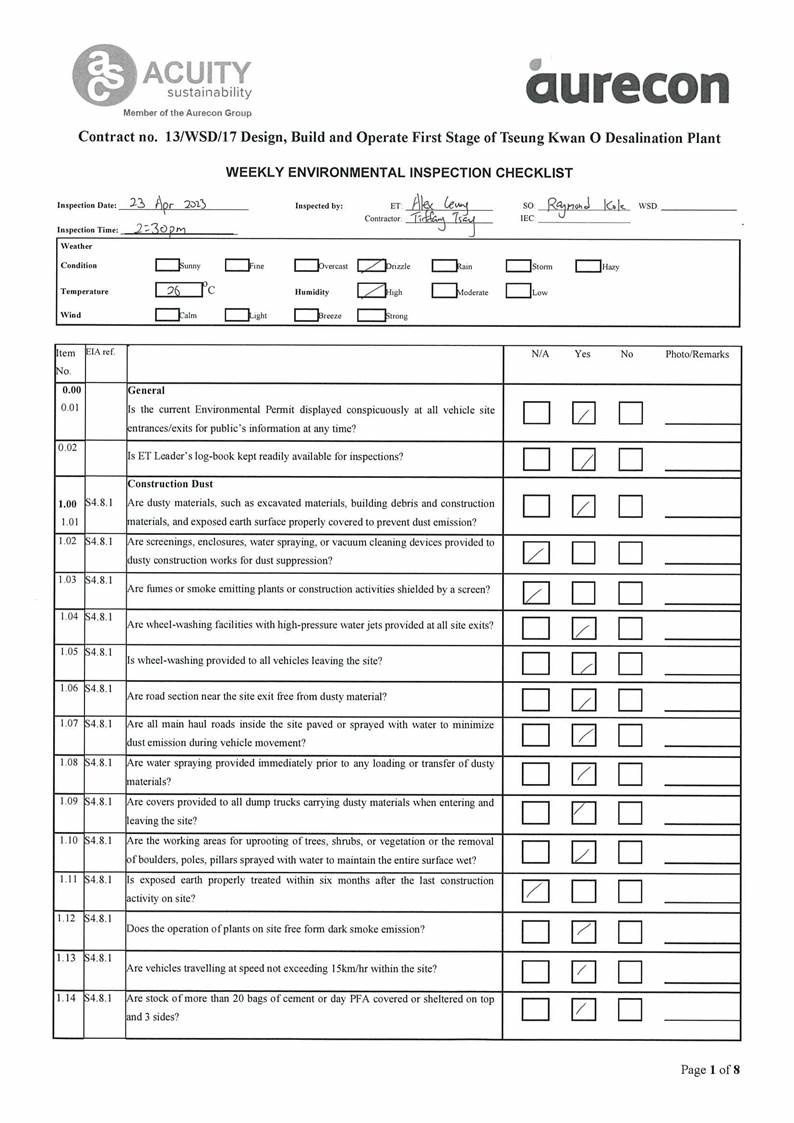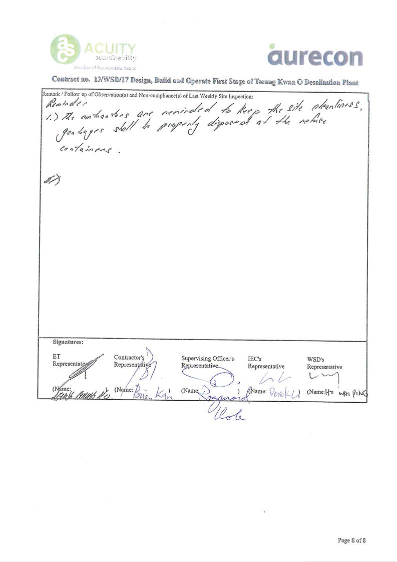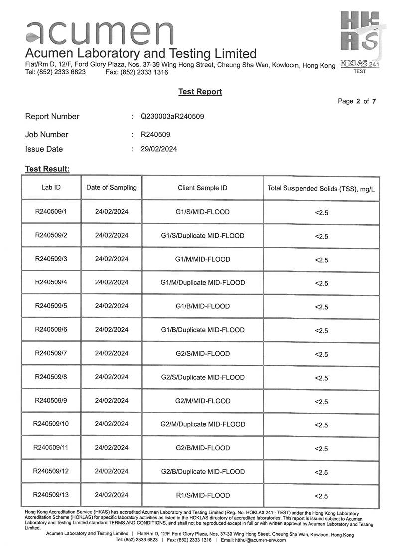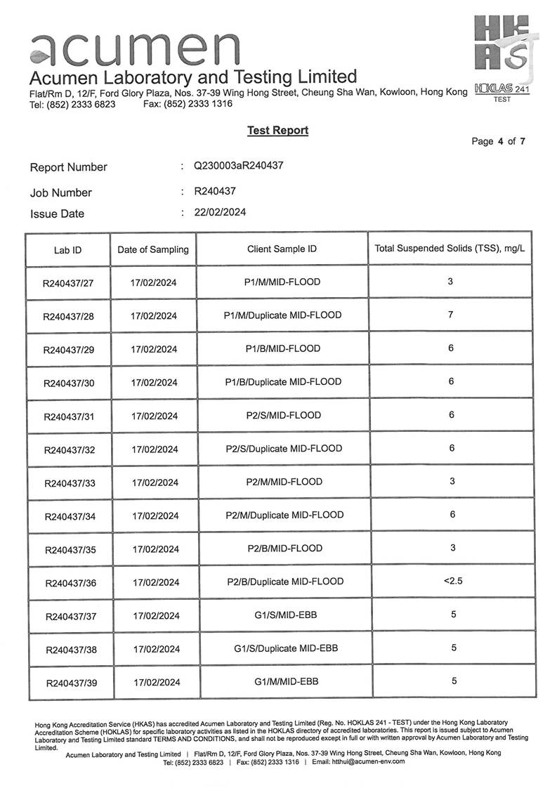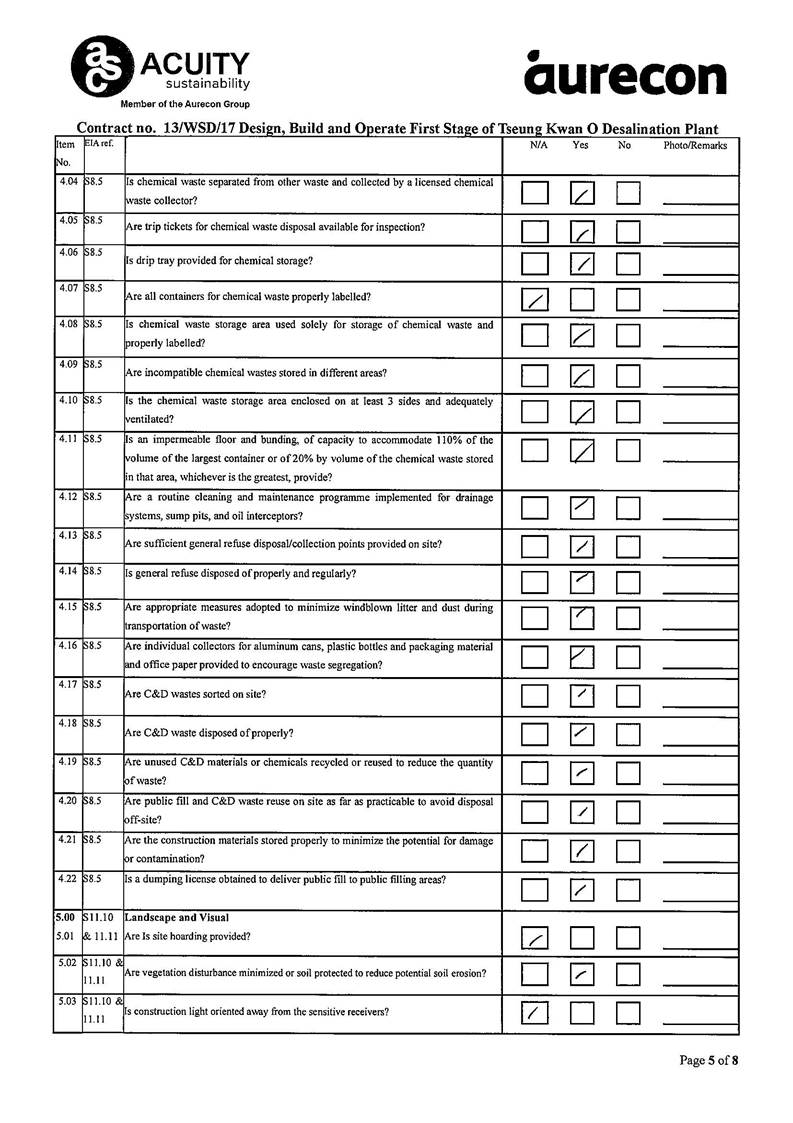 A2. In accordance with the Environmental Monitoring and Audit (EM&A) Manual for the Contract, EM&A works for marine water quality, noise, waste management and ecology should be carried out by Environmental Team (ET), Acuity Sustainability Consulting Limited (ASCL), during the construction phase of the Contract.