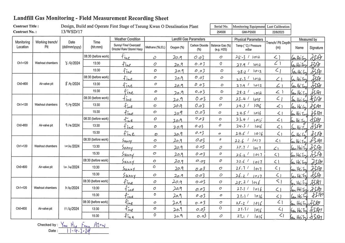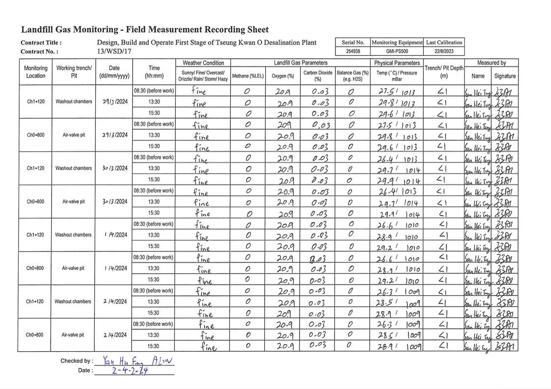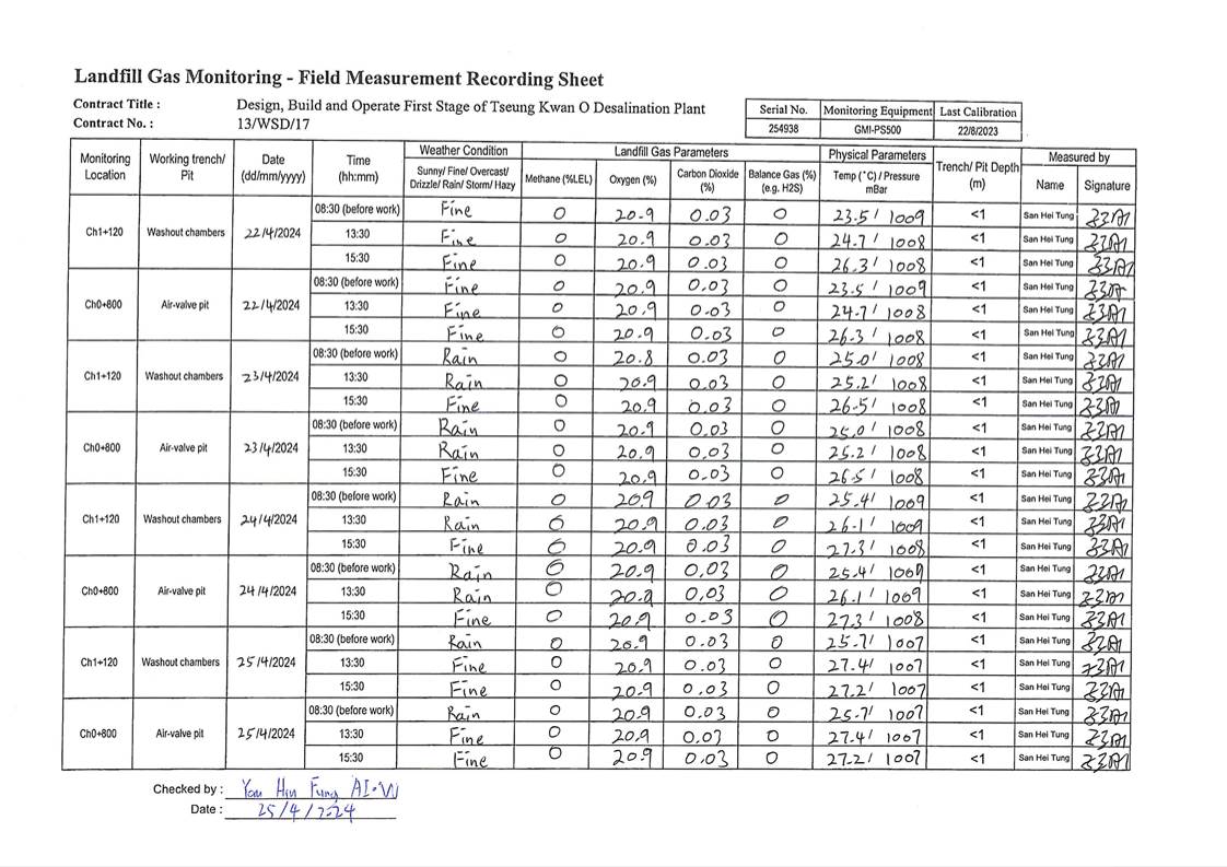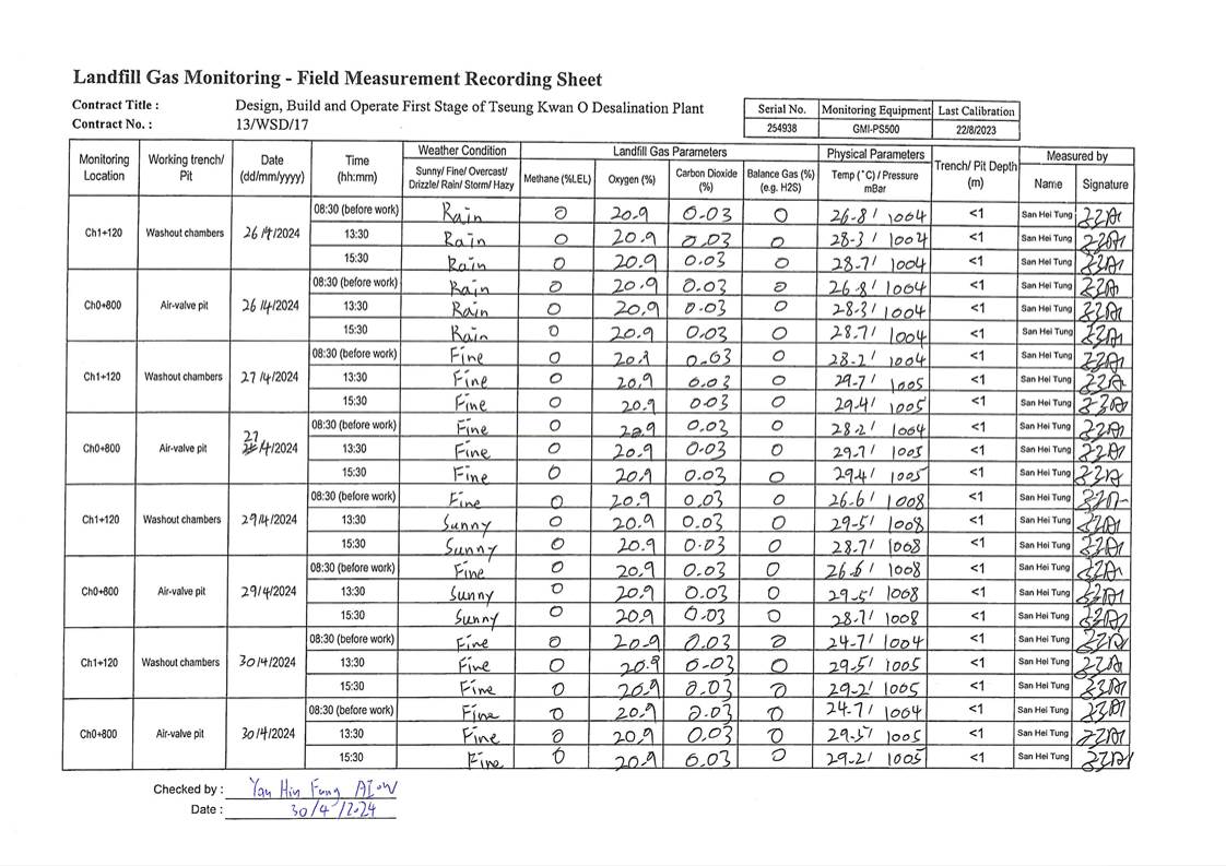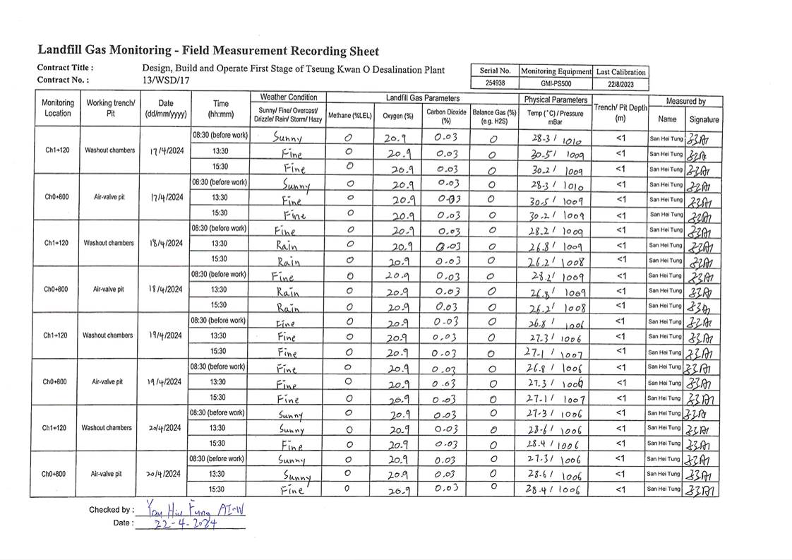 A14. In this reporting period, 156 times of landfill gas monitoring were periodically conducted at TKO Area 137 (Ch1+120 - Ch1+800) until 20 April 2024. No exceedances of action level and limit level was observed.