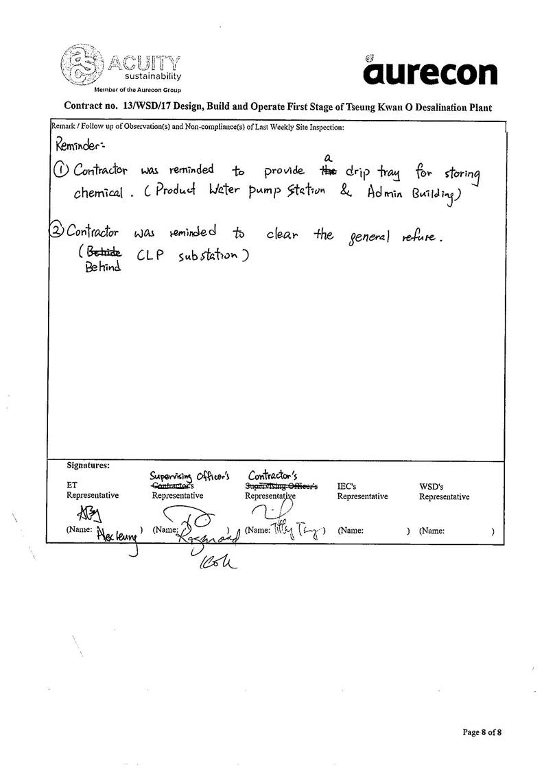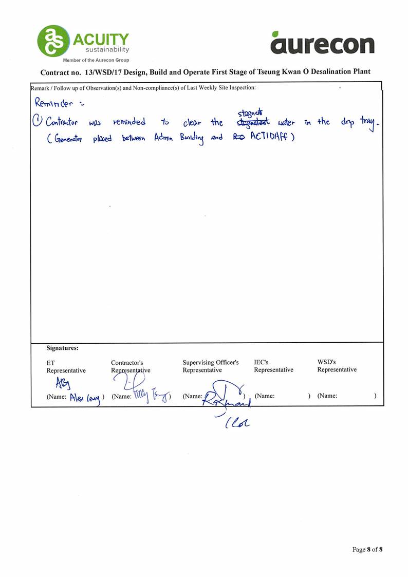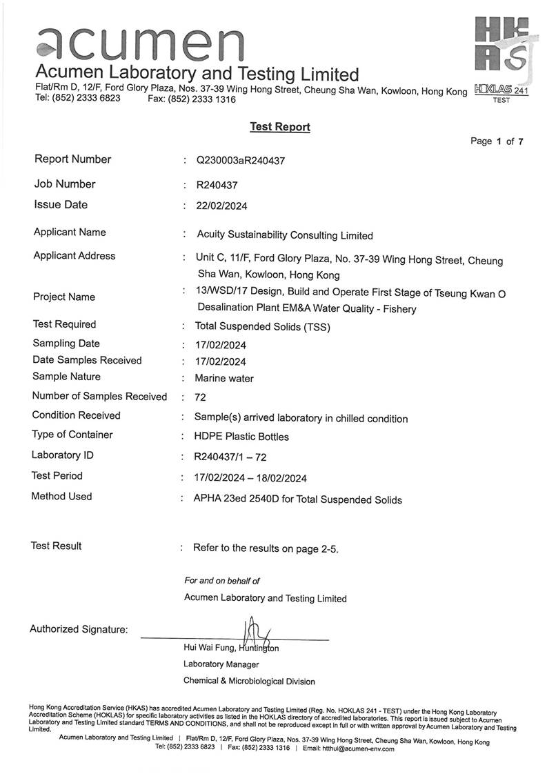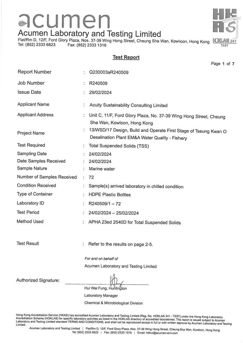 A1. The Project, Design, Build and Operate First Stage of Tseung Kwan O Desalination Plant (TKODP), is a Designated Project under the Environmental Impact Assessment Ordinance (Cap. 499) (EIAO) and is currently governed by a Further Environmental Permit (EP No. FEP - 01/503/2015/B) for the construction and operation of the Contract.