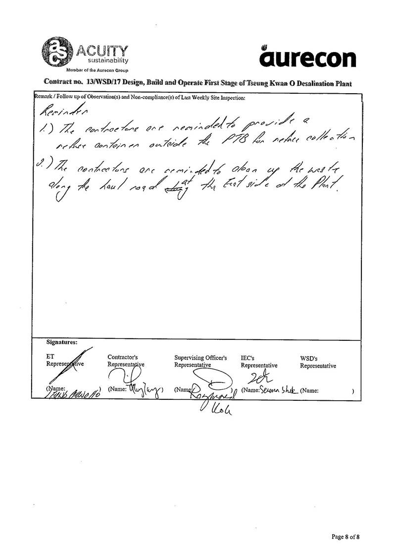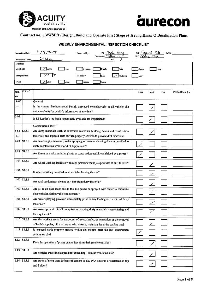 A15. Joint site inspections of the construction work by ET and IEC were carried out on 29 April 2024 to audit the mitigation measures implementation status. Reminders were recorded in the site inspection checklists and provided to the contractors together with the appropriate follow-up actions where necessary.