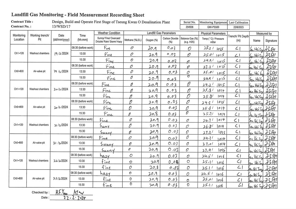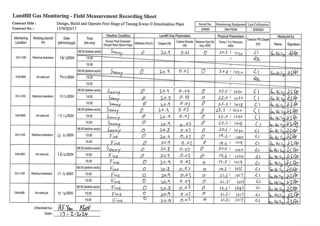 A14. In this reporting period, 126 times of landfill gas monitoring were periodically conducted at TKO Area 137 (Ch1+340 - Ch1+600). No exceedances of action level and limit level was observed.