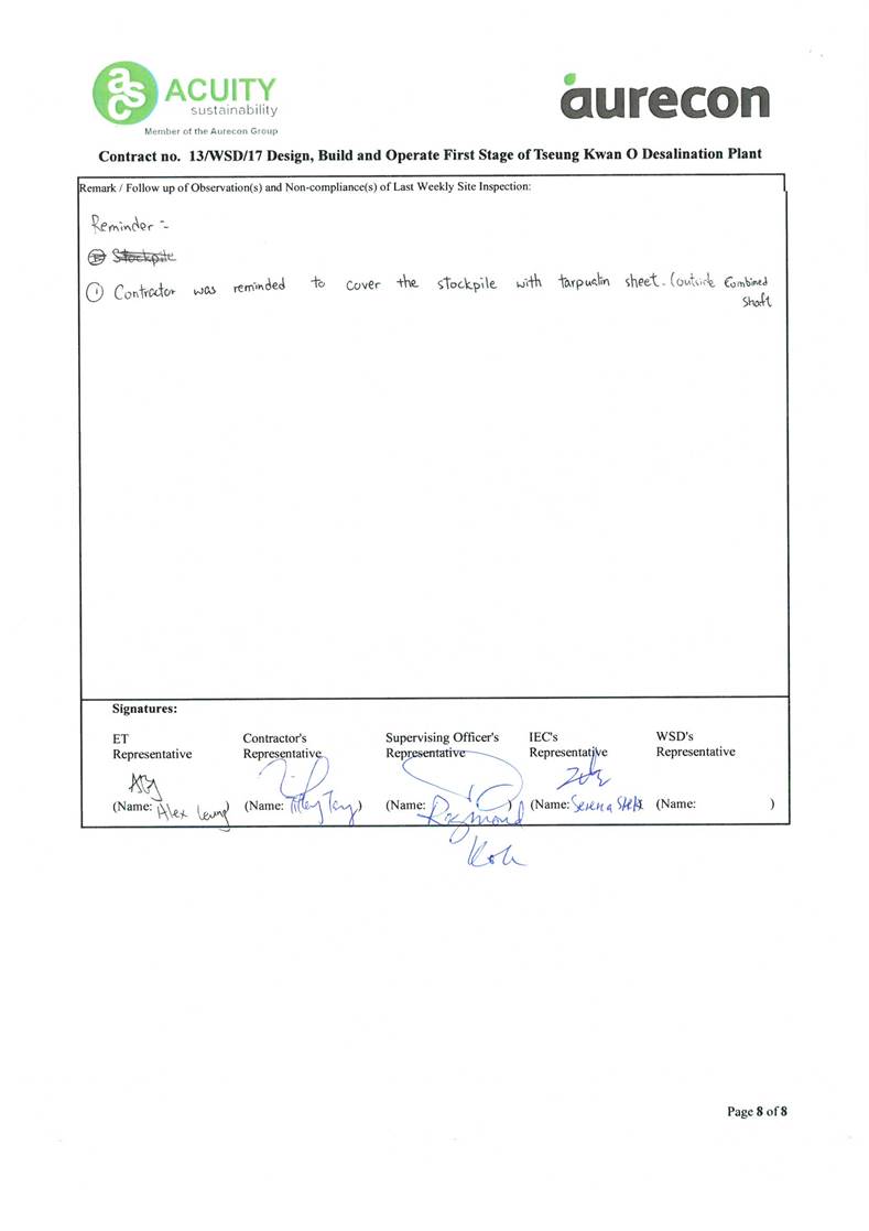 A15. Joint site inspections of the construction work by ET and IEC were carried out on 16 and 28 February 2024 to audit the mitigation measures implementation status. Reminders were recorded in the site inspection checklists and provided to the contractors together with the appropriate follow-up actions where necessary.
