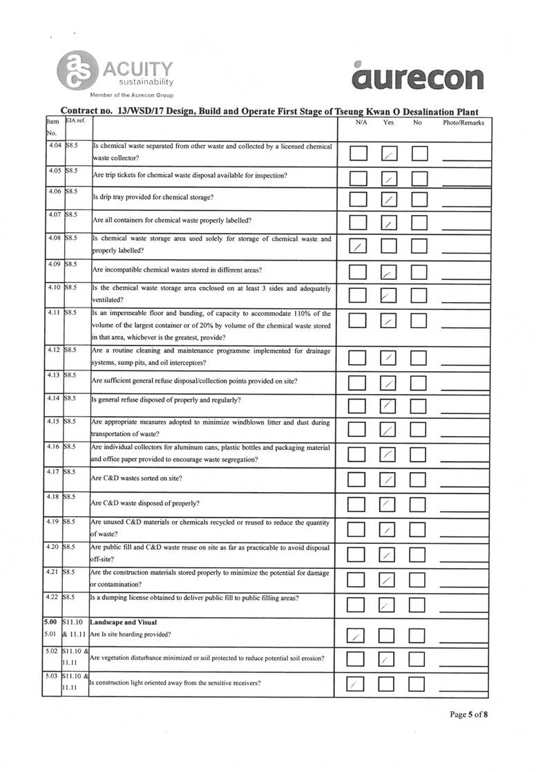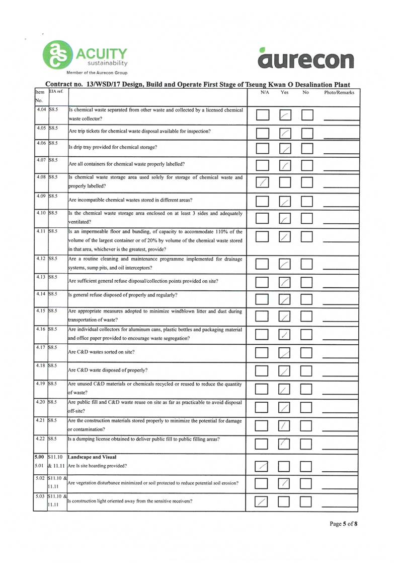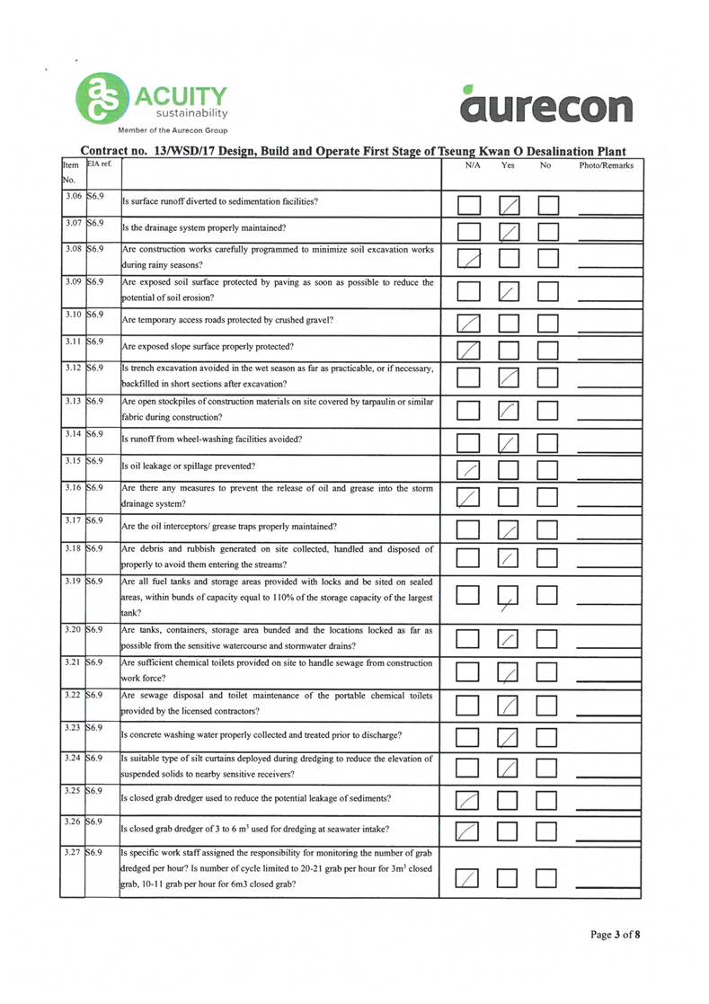A2. In accordance with the Environmental Monitoring and Audit (EM&A) Manual for the Contract, EM&A works for marine water quality, noise, waste management and ecology should be carried out by Environmental Team (ET), Acuity Sustainability Consulting Limited (ASCL), during the construction phase of the Contract.