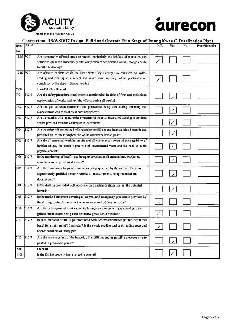 A2. In accordance with the Environmental Monitoring and Audit (EM&A) Manual for the Contract, EM&A works for marine water quality, noise, waste management and ecology should be carried out by Environmental Team (ET), Acuity Sustainability Consulting Limited (ASCL), during the construction phase of the Contract.