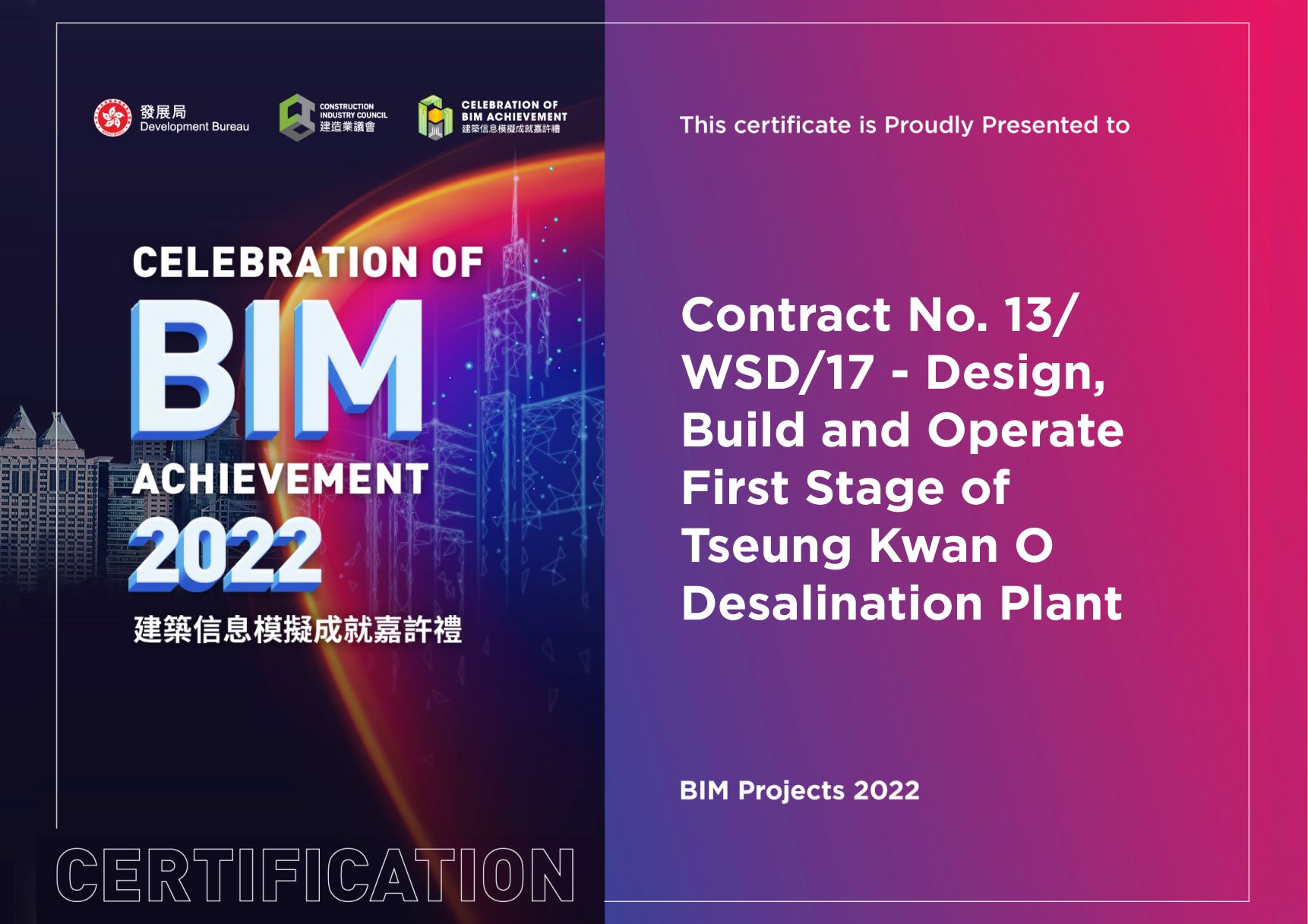 將軍澳海水淡化廠項目團隊很高興第二次獲得該獎項。儘管去年獲得該獎項,但現在仍然致力運用BIM在項目的每個階段中,例如 CMS 模擬、數字製造、成本評估和竣工信息模型,目的是可以進一步減少建造過程中需要作出的變更,讓各範疇團隊能更準確地估算各個階段的項目成本,這是有賴整個團隊的合作性。