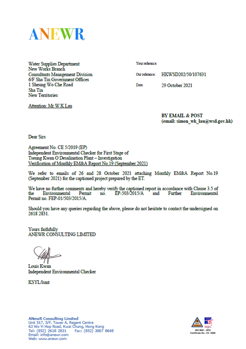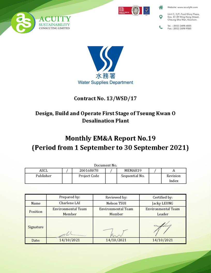 A3. This is the 19th Monthly EM&A Report, prepared by ASCL, for the Project summarizing the monitoring results and audit findings of the EM&A programme at and around Tseung Kwan O Area 137 (TKO 137) during the reporting period from 1 September 2021 to 30 September 2021.