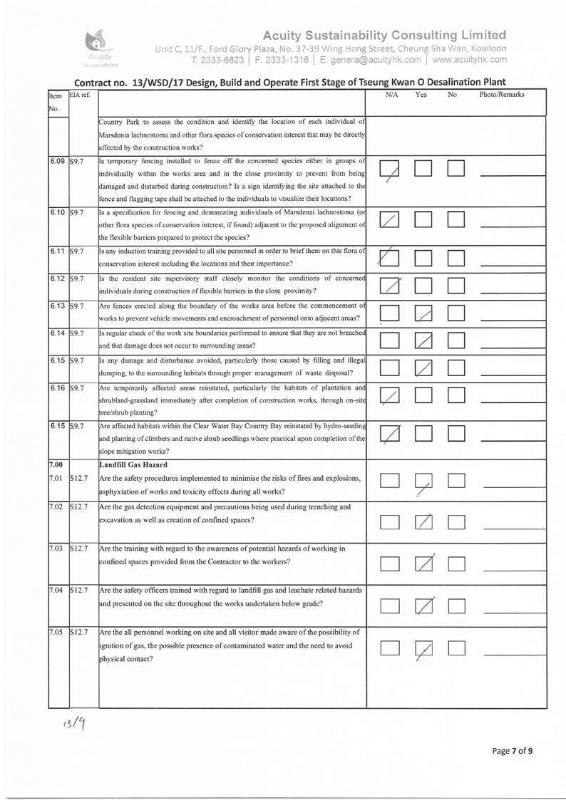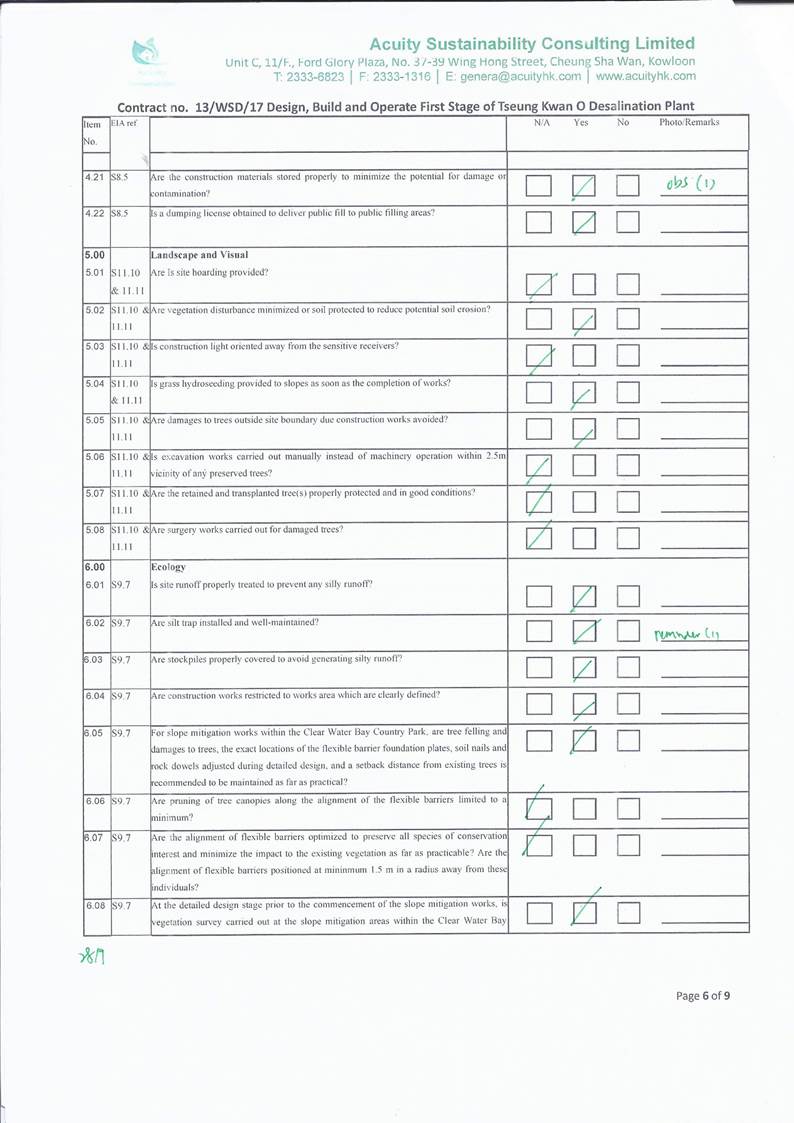A2. In accordance with the Environmental Monitoring and Audit (EM&A) Manual for the Project, EM&A works for marine water quality, noise, waste management and ecology should be carried out by Environmental Team (ET), Acuity Sustainability Consulting Limited (ASCL), during the construction phase of the Project.