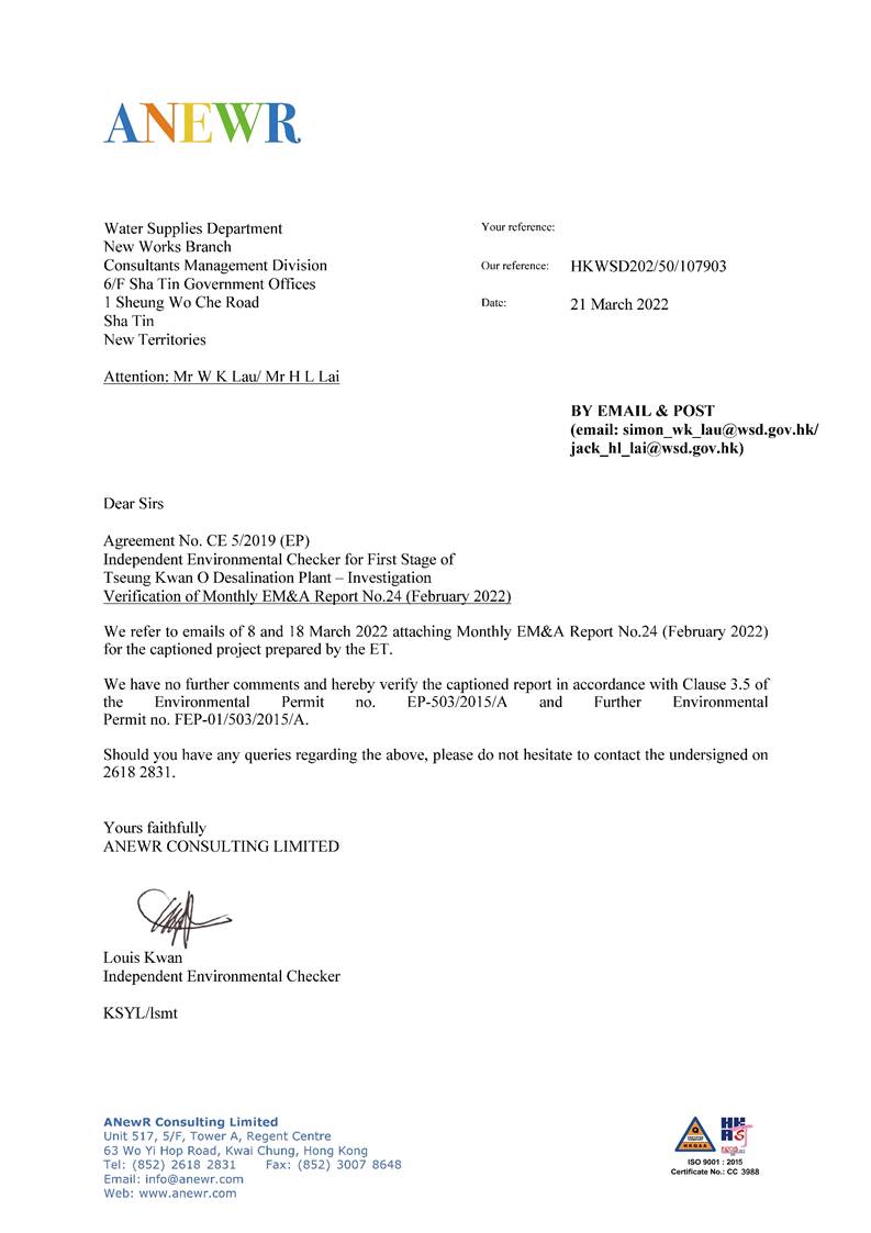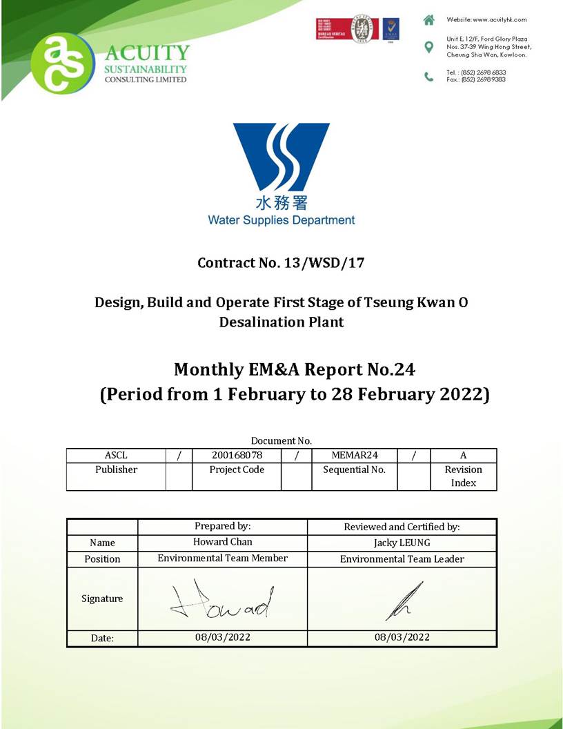 A3. This is the 24th Monthly EM&A Report, prepared by ASCL, for the Contract summarizing the monitoring results and audit findings of the EM&A programme at and around Tseung Kwan O Area 137 (TKO 137) during the reporting period from 1 February 2022 to 28 February 2022.