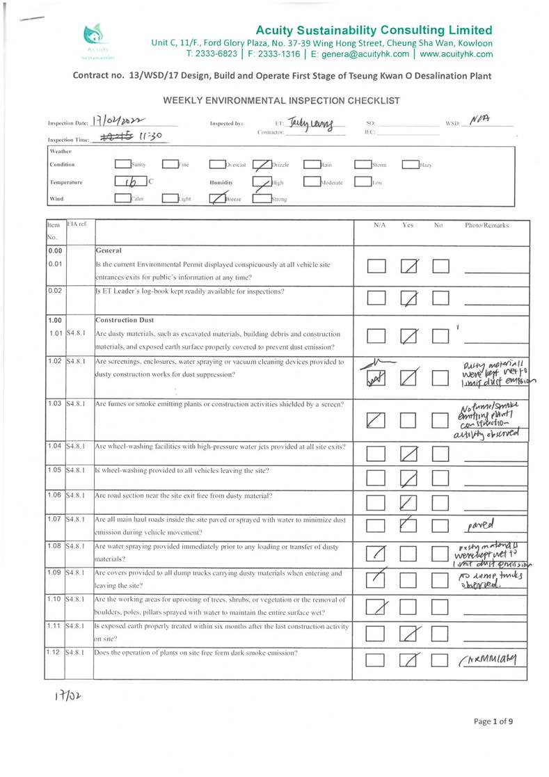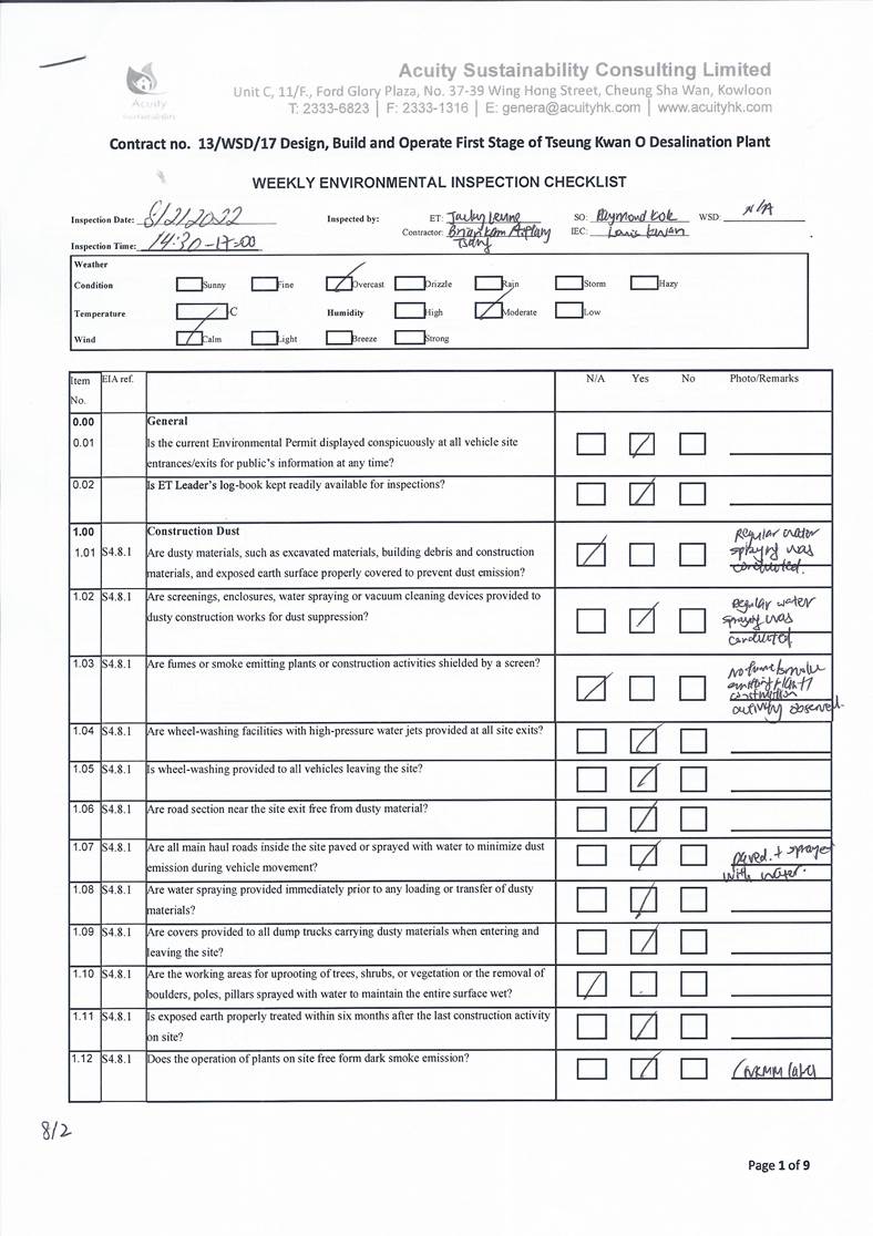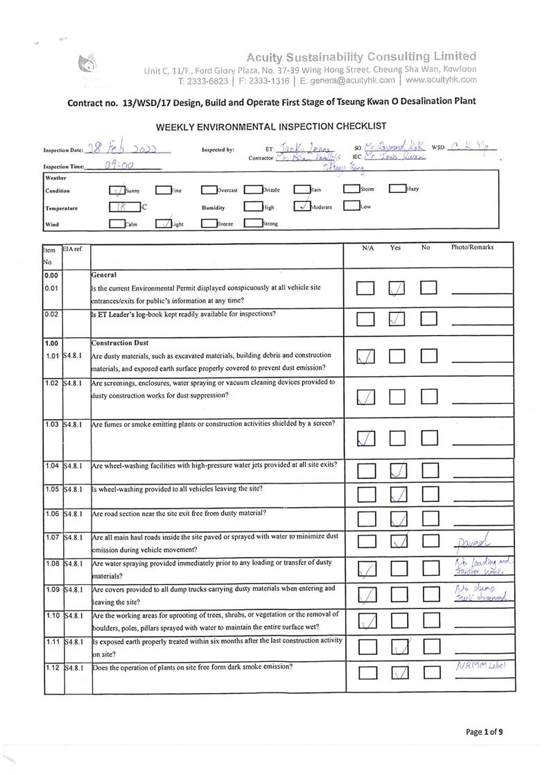 A15. Joint site inspections of the construction work by ET and IEC were carried out on 8, 17, 23 and 28 February 2022 to audit the mitigation measures implementation status. Observations were recorded in the site inspection checklists and provided to the contractors together with the appropriate follow-up actions where necessary.