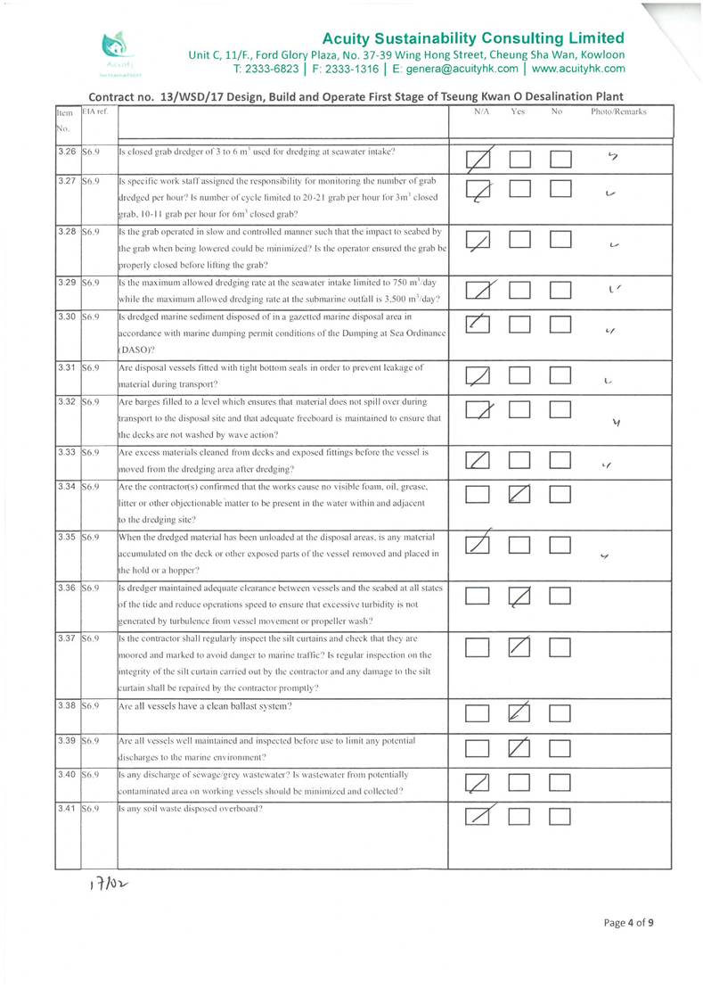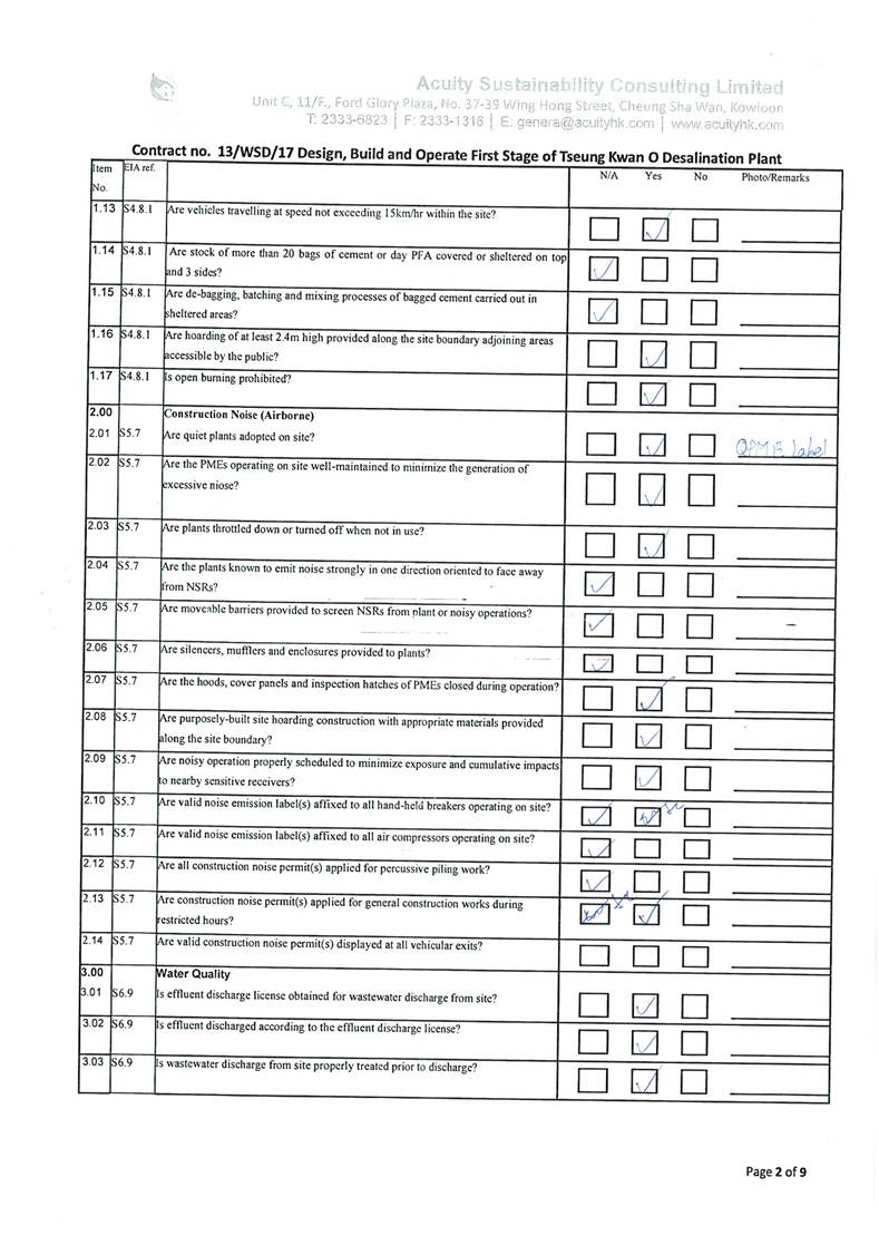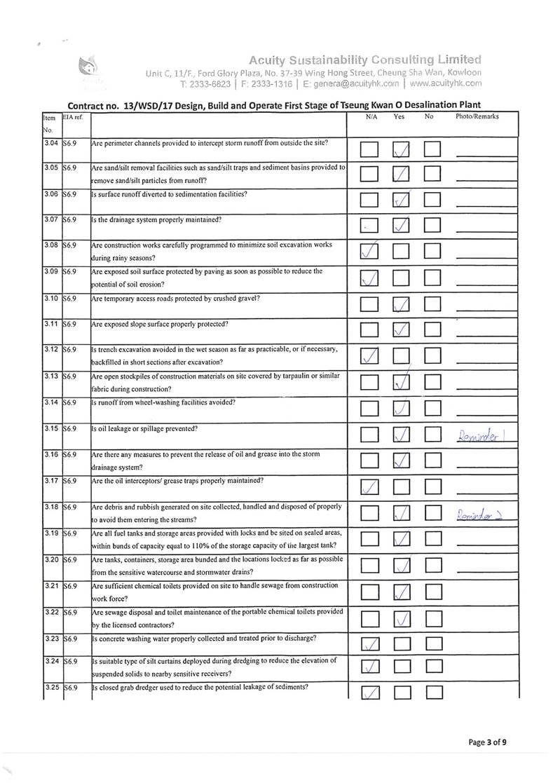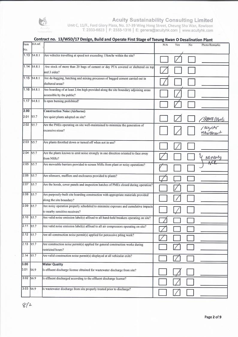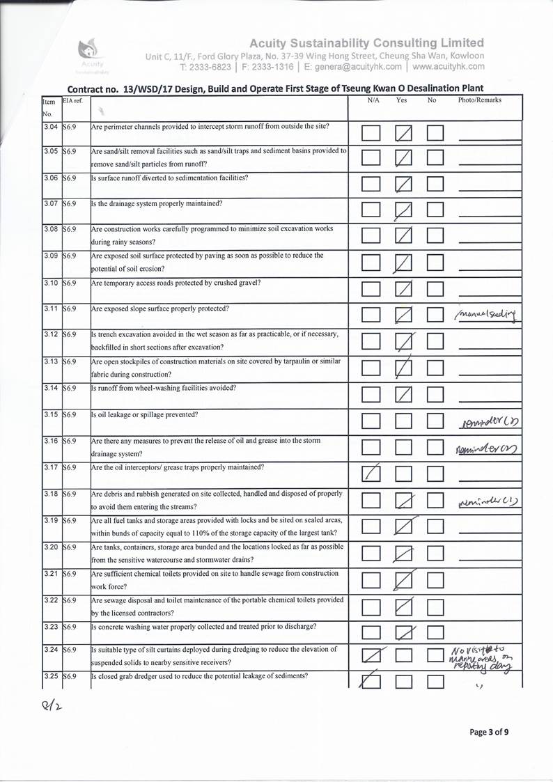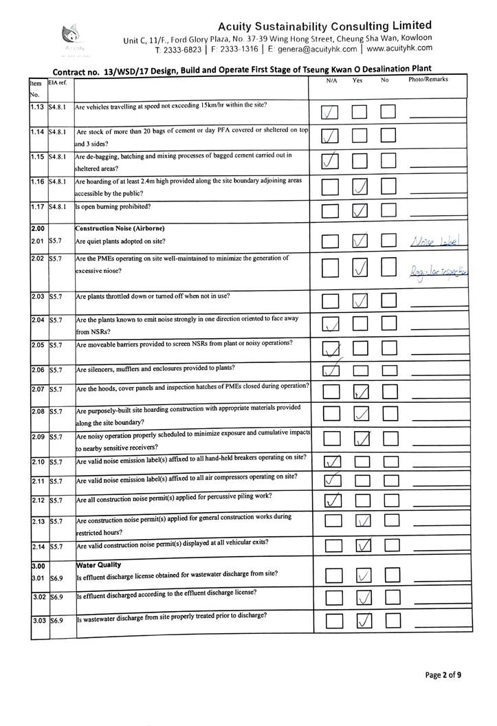 A2. In accordance with the Environmental Monitoring and Audit (EM&A) Manual for the Contract, EM&A works for marine water quality, noise, waste management and ecology should be carried out by Environmental Team (ET), Acuity Sustainability Consulting Limited (ASCL), during the construction phase of the Contract.