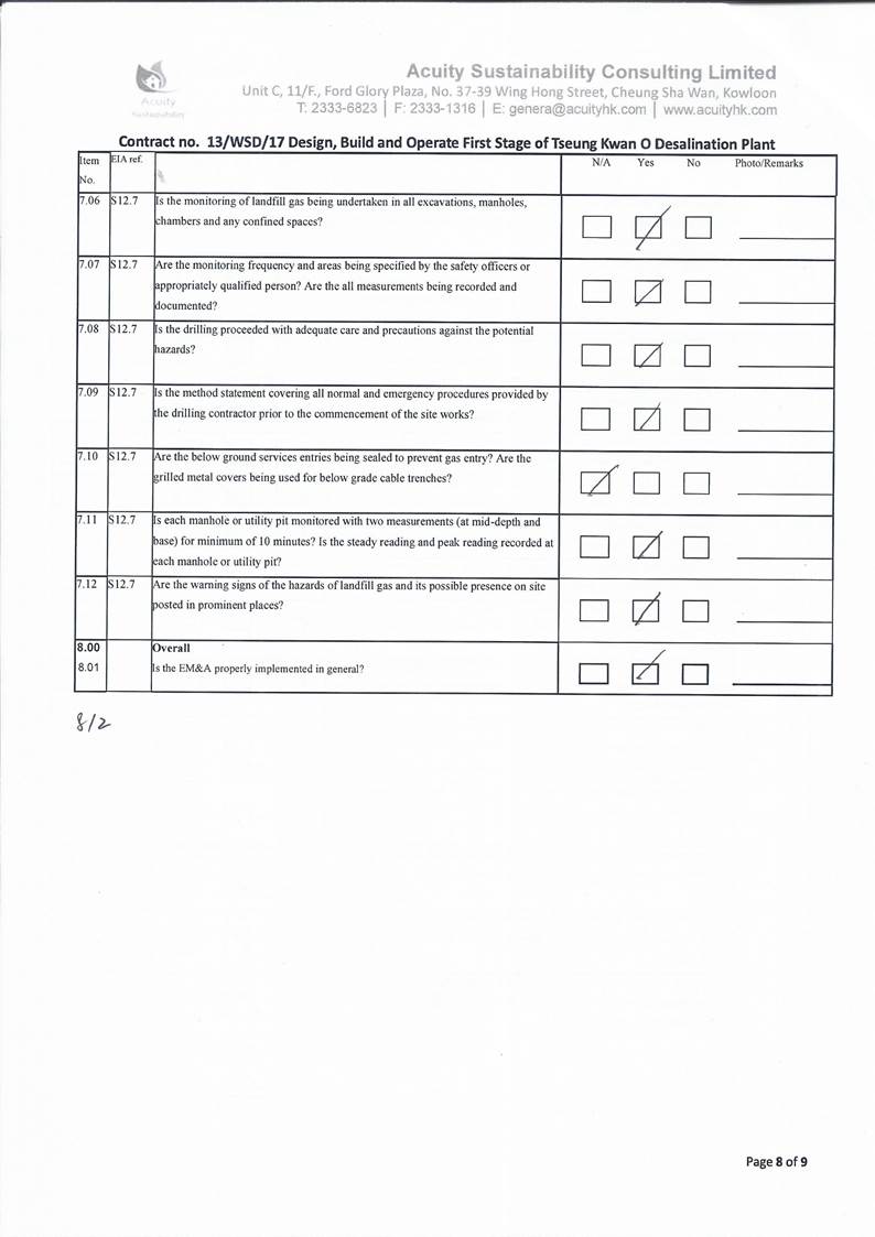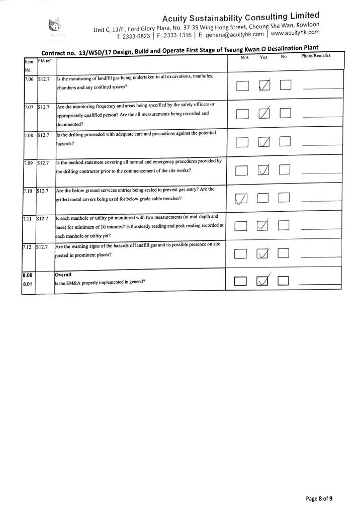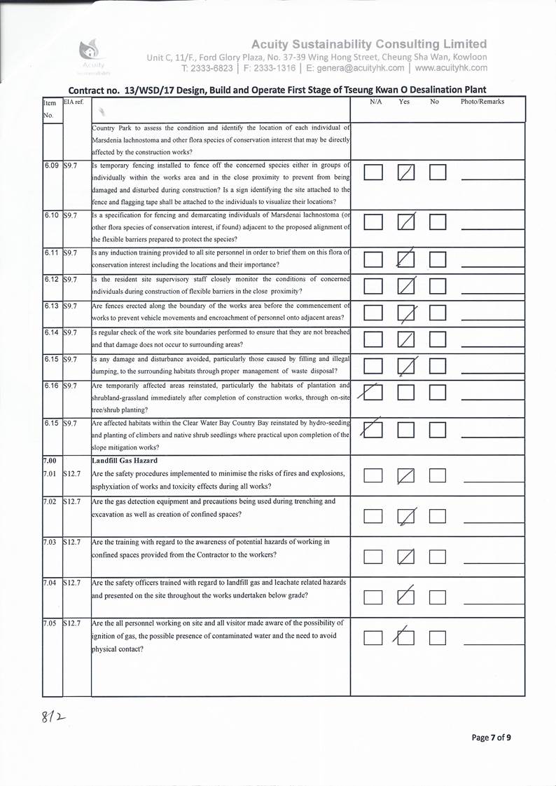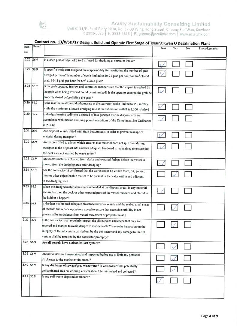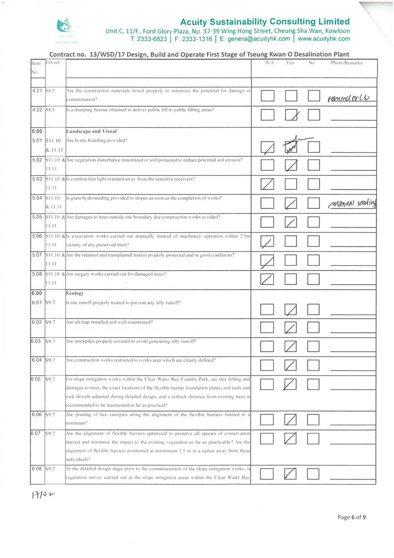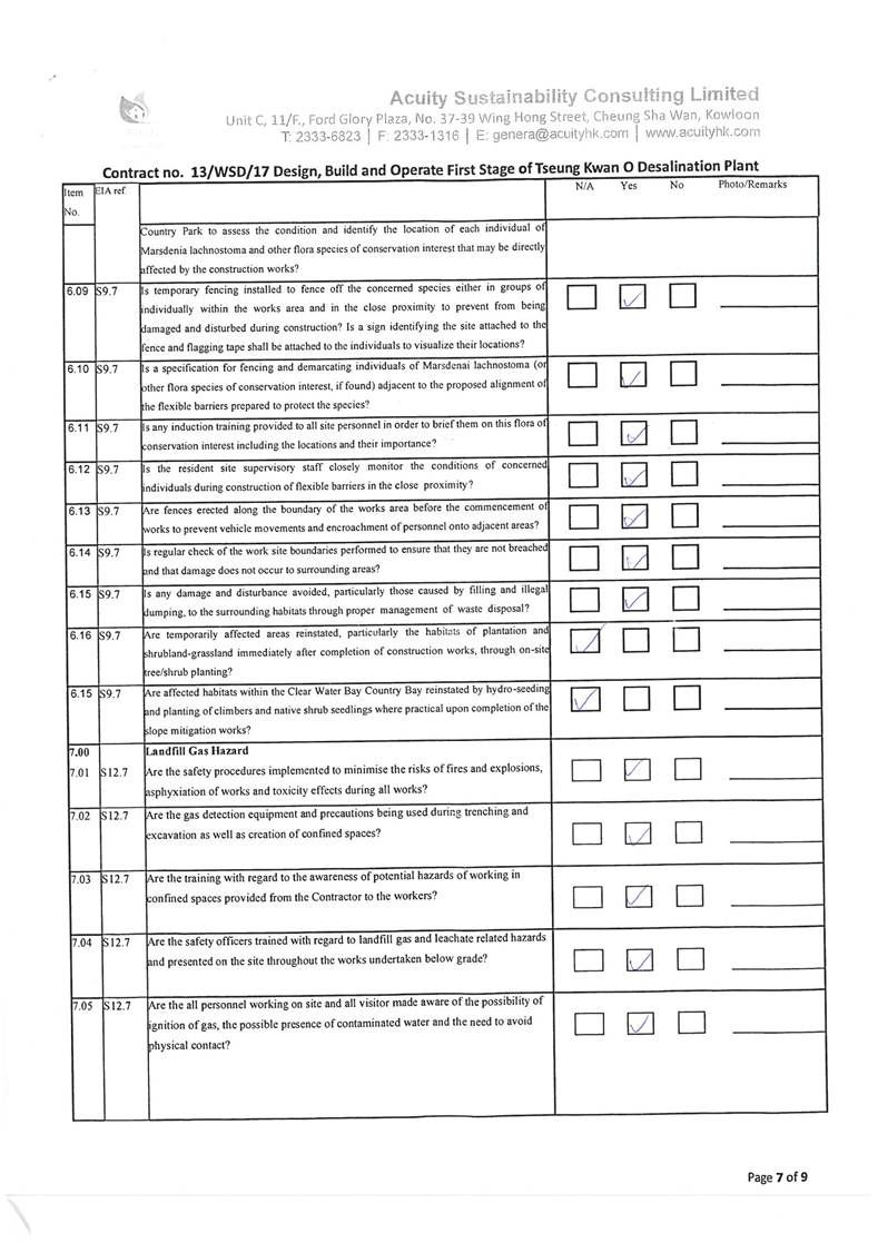 A2. In accordance with the Environmental Monitoring and Audit (EM&A) Manual for the Contract, EM&A works for marine water quality, noise, waste management and ecology should be carried out by Environmental Team (ET), Acuity Sustainability Consulting Limited (ASCL), during the construction phase of the Contract.
