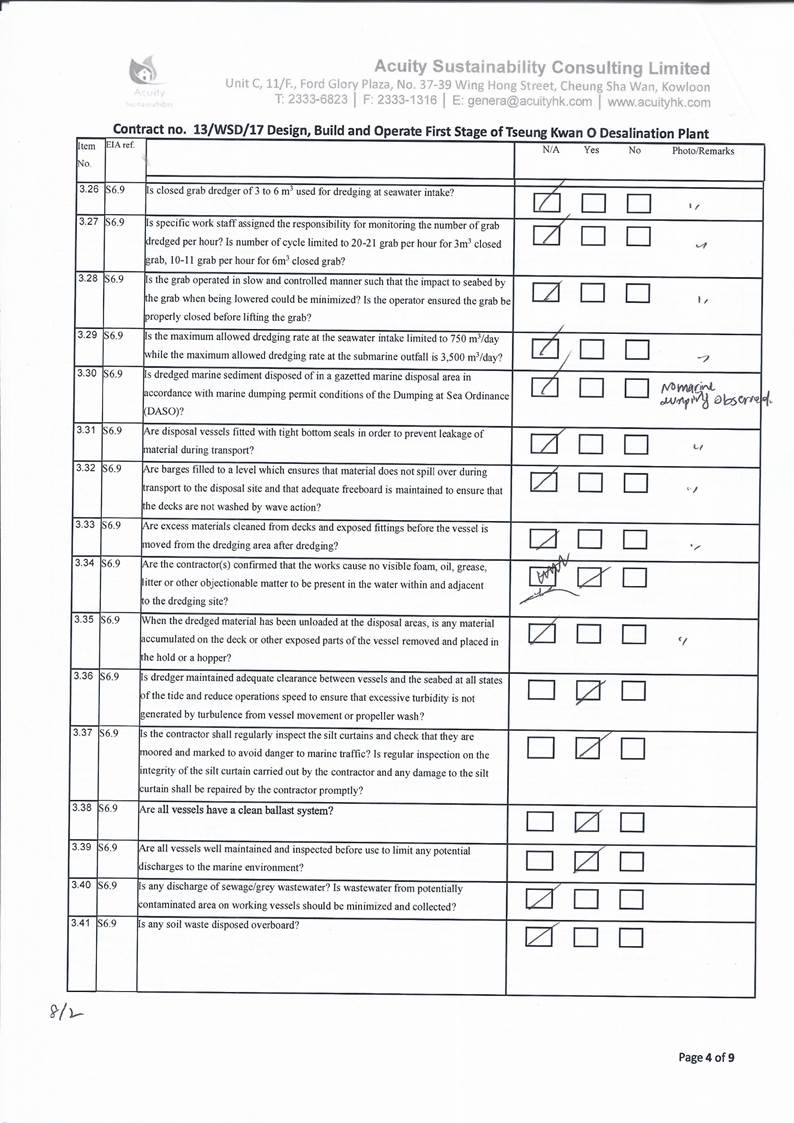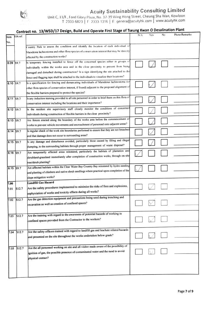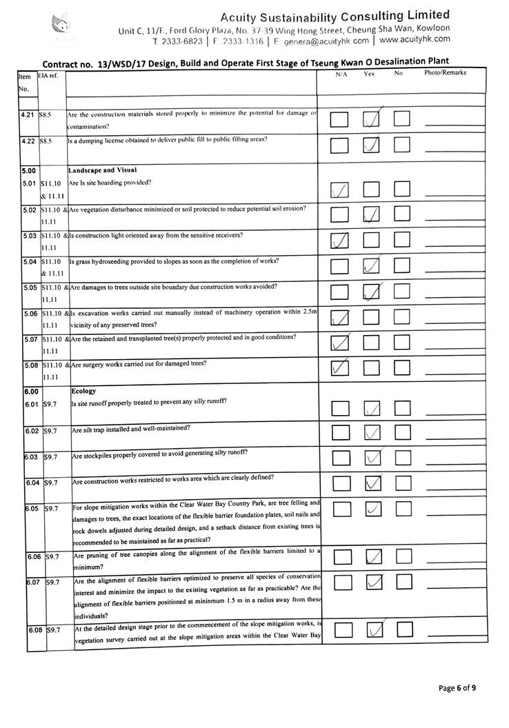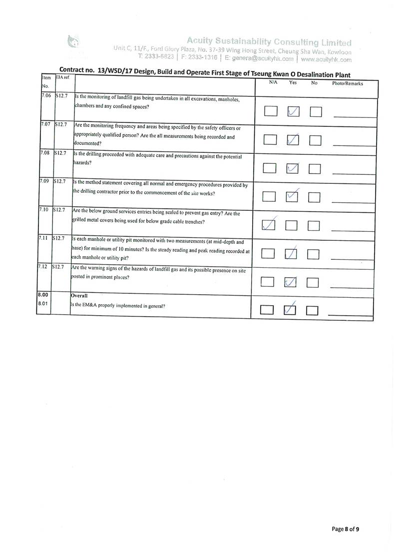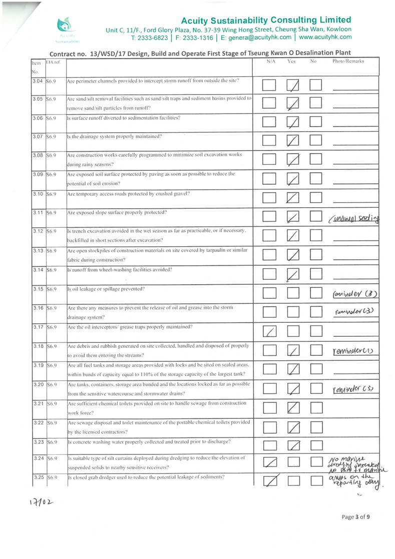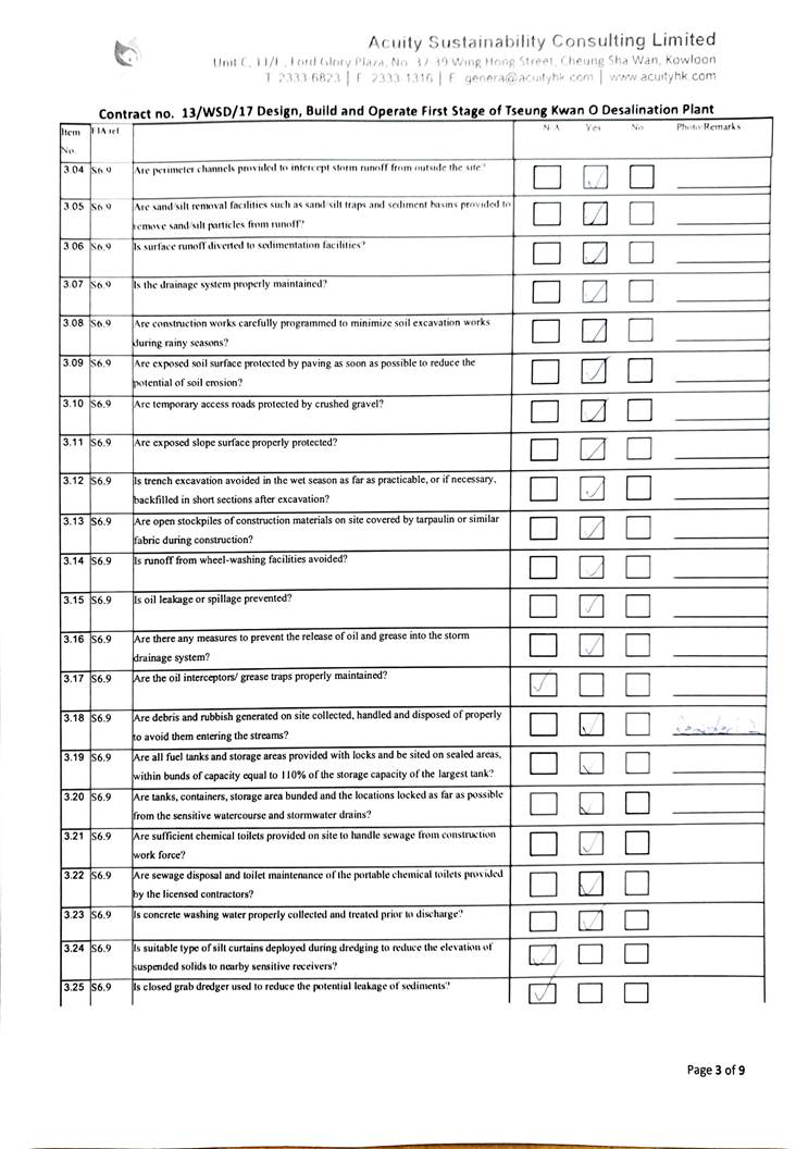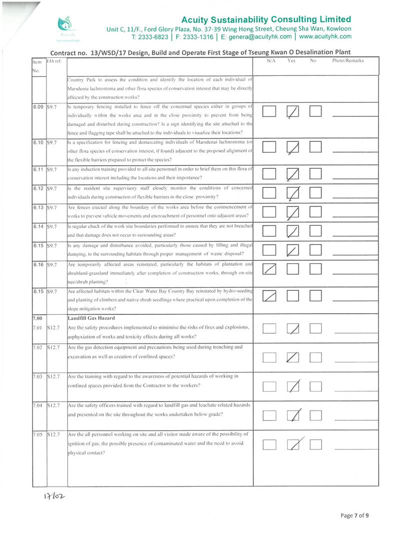 A2. In accordance with the Environmental Monitoring and Audit (EM&A) Manual for the Contract, EM&A works for marine water quality, noise, waste management and ecology should be carried out by Environmental Team (ET), Acuity Sustainability Consulting Limited (ASCL), during the construction phase of the Contract.