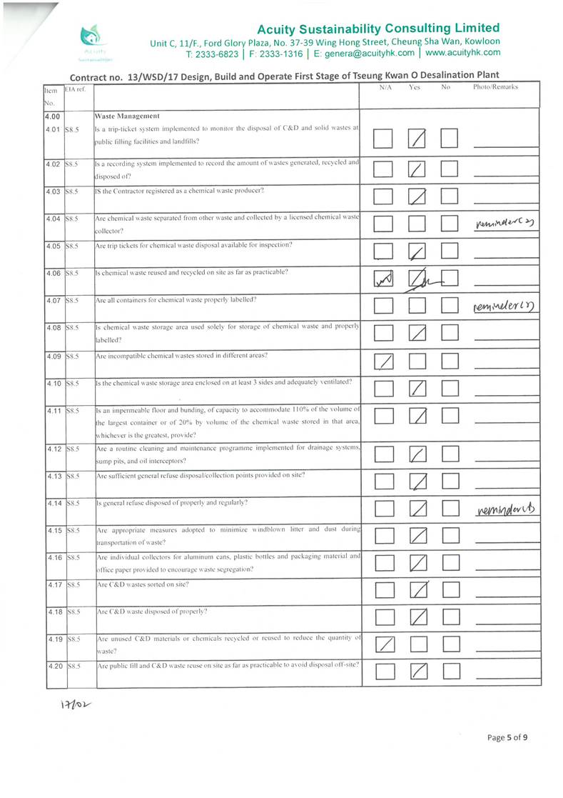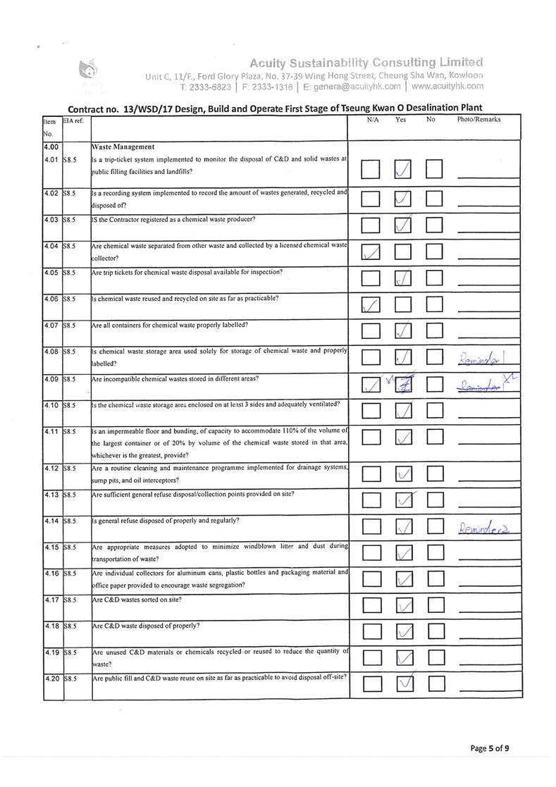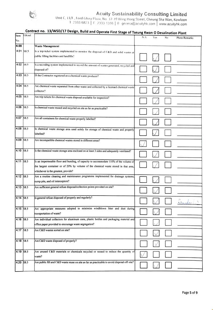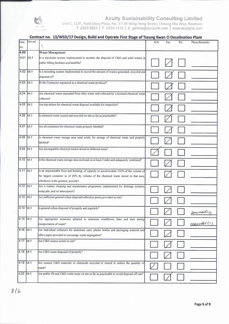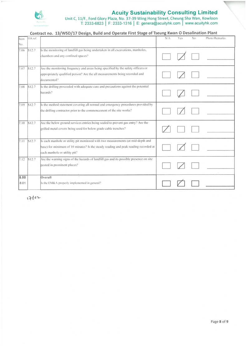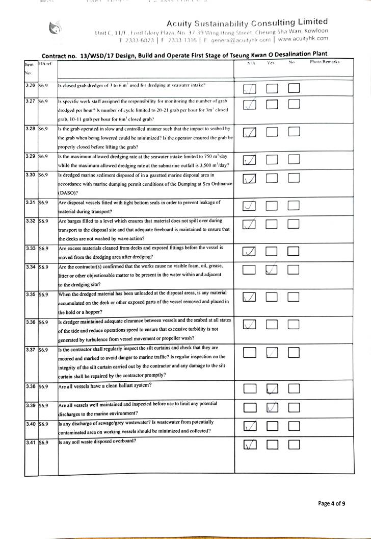 A2. In accordance with the Environmental Monitoring and Audit (EM&A) Manual for the Contract, EM&A works for marine water quality, noise, waste management and ecology should be carried out by Environmental Team (ET), Acuity Sustainability Consulting Limited (ASCL), during the construction phase of the Contract.