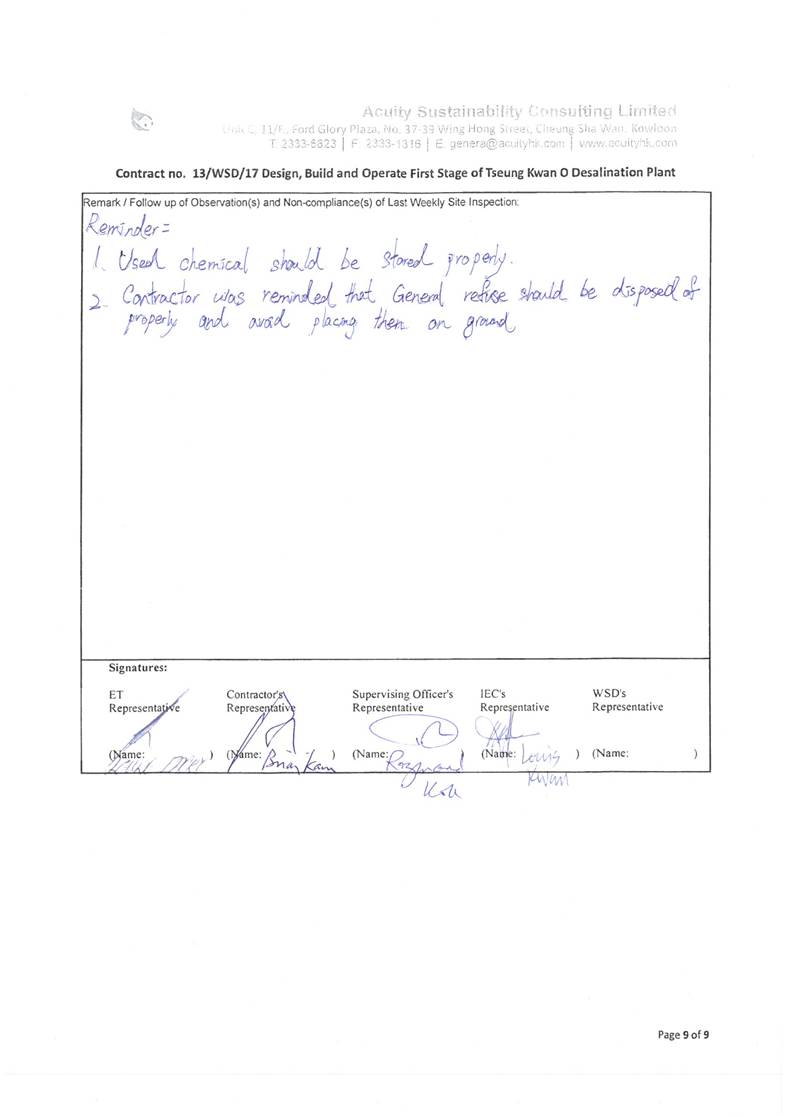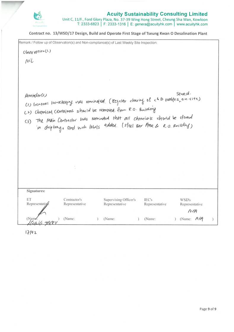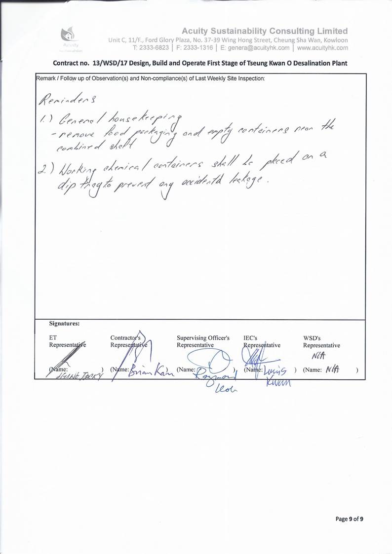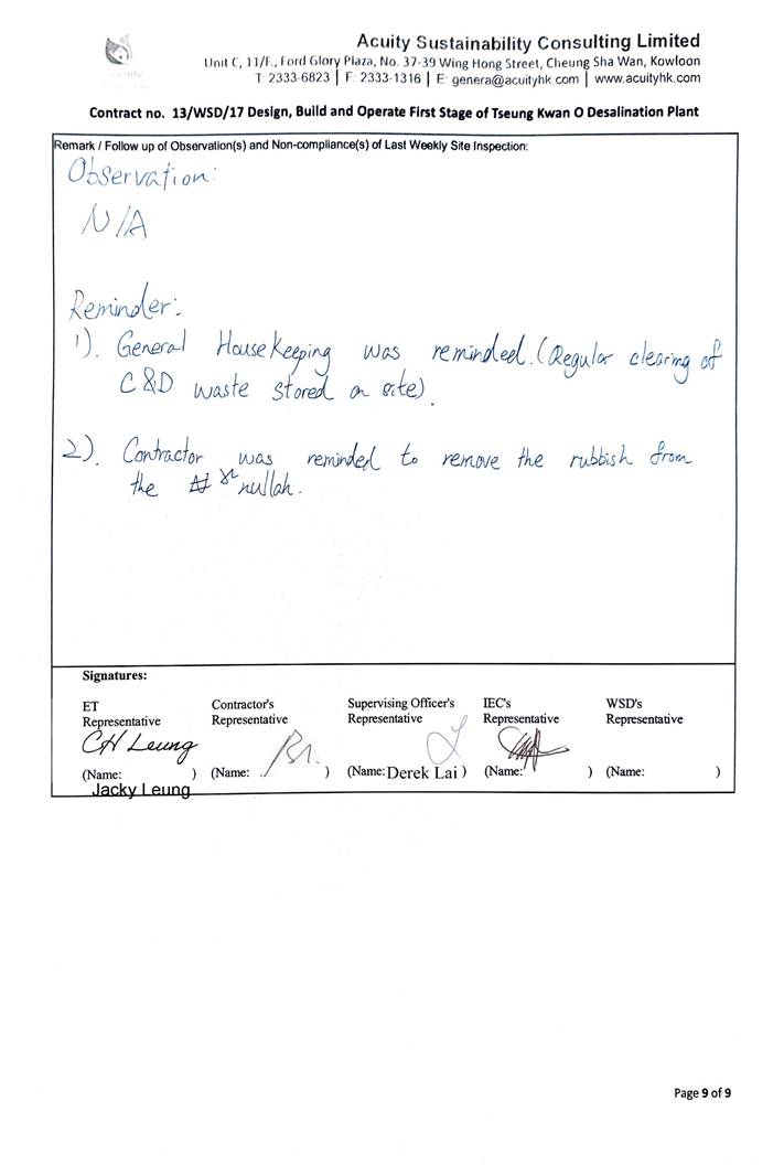 A9. The EM&A works for water quality were conducted during the reporting period in accordance with the EM&A Manual.