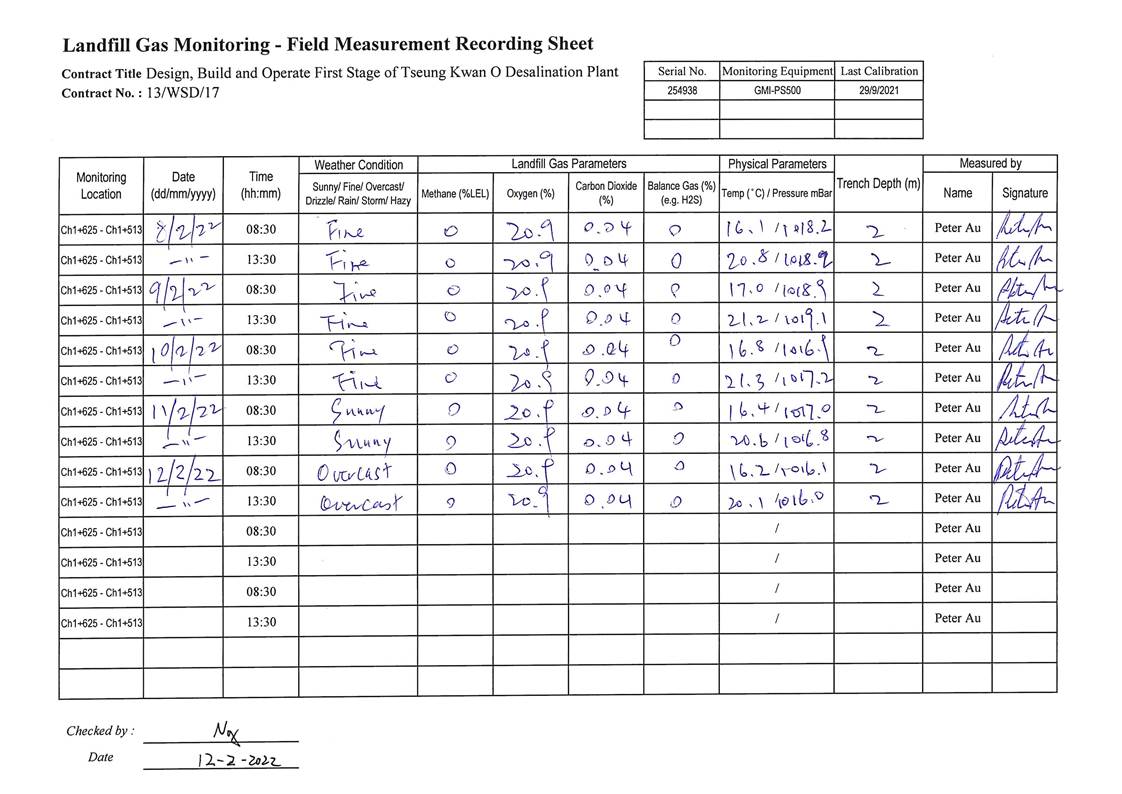 A14. In this reporting period, 18 times of landfill gas monitoring were recorded at Wan Po Road (Ch1+625 - Ch1+513). No exceedance of action and limit levels for methane, oxygen and carbon dioxide was observed. Monitoring was conducted during excavations at 1m depth or more within the consultation zone and whenever workers entered the excavation on the day.