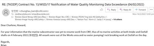 A12. Investigation on the reason of exceedance has been carried out, where the exceedances of SS on 4, 8, 10, 12, 15, 17, 19, 22. 24 and 26 February 2022 were concluded to be unrelated to the Contract as detailed in the Incident Reports on Action Level or Limit Level Non- compliance along with supporting materials in Appendix O.