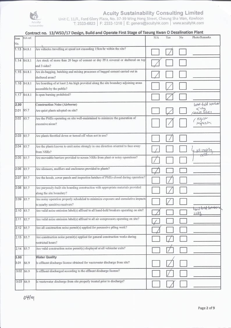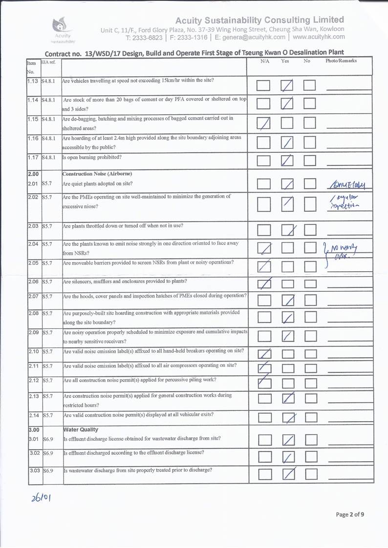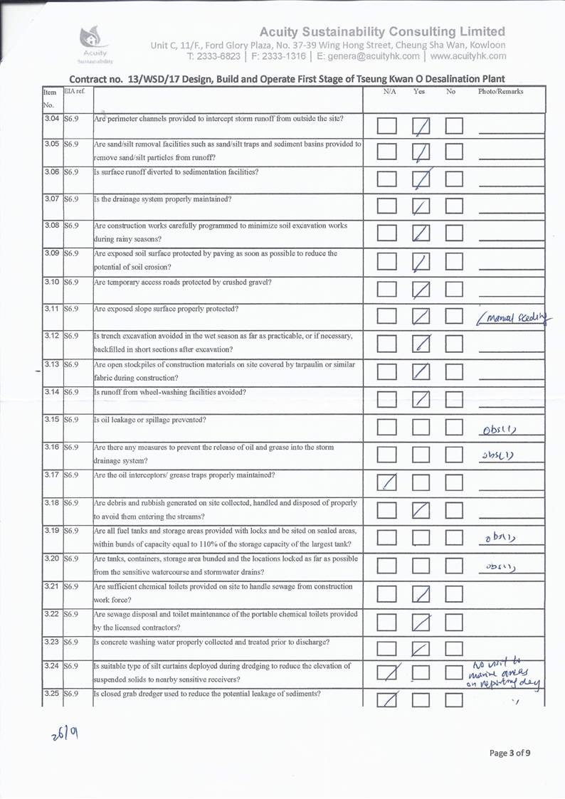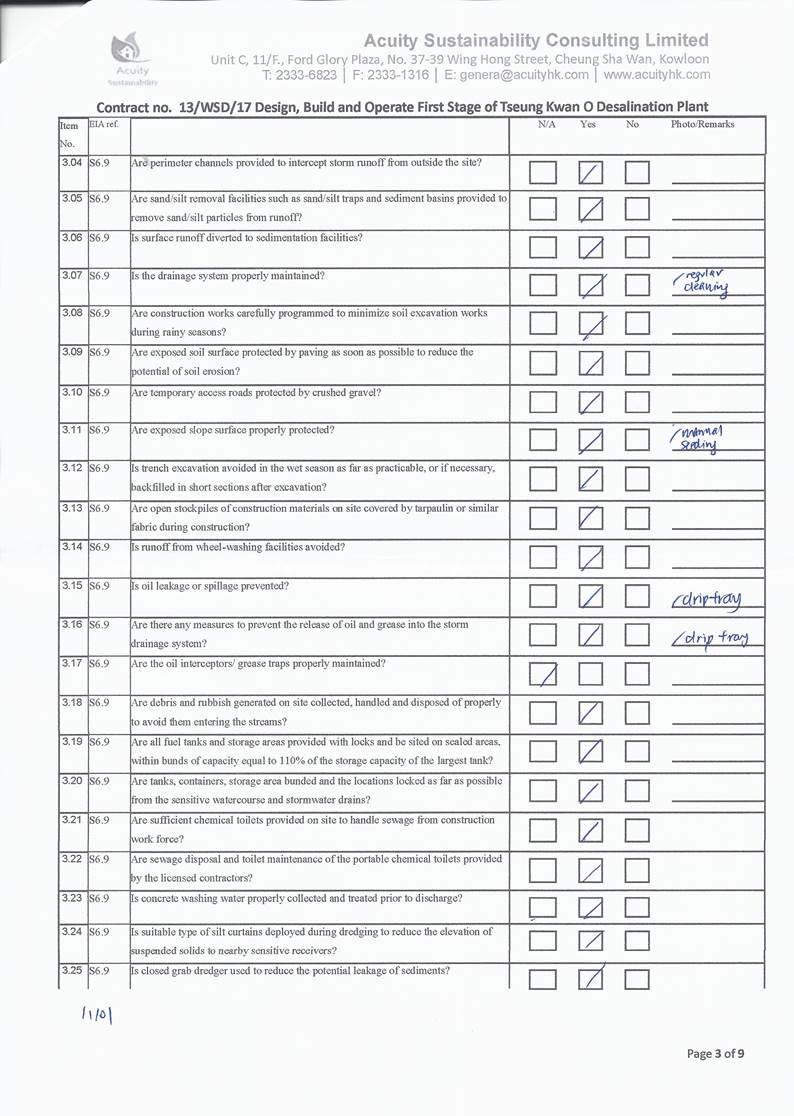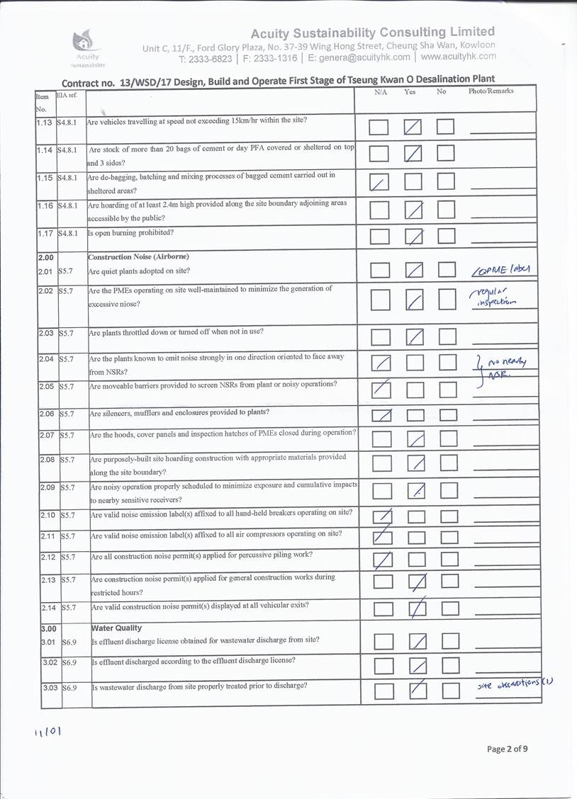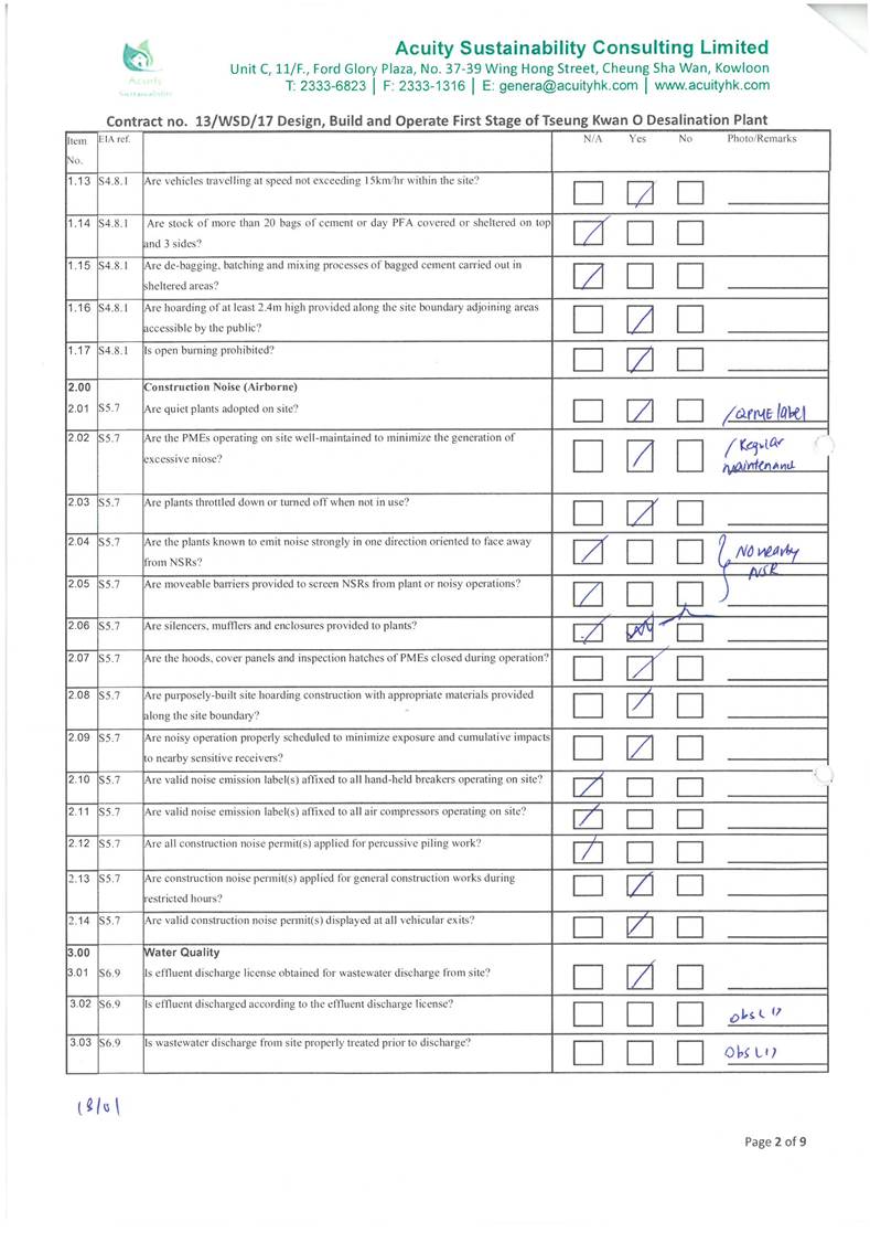 A2. In accordance with the Environmental Monitoring and Audit (EM&A) Manual for the Contract, EM&A works for marine water quality, noise, waste management and ecology should be carried out by Environmental Team (ET), Acuity Sustainability Consulting Limited (ASCL), during the construction phase of the Contract.