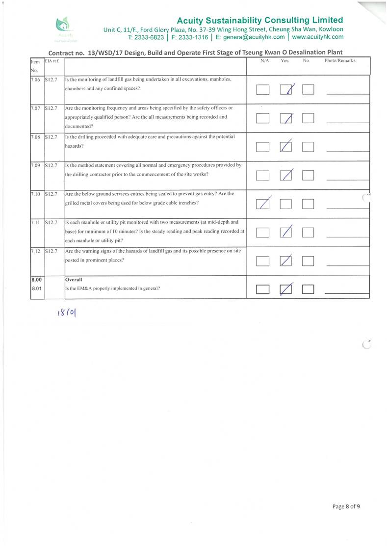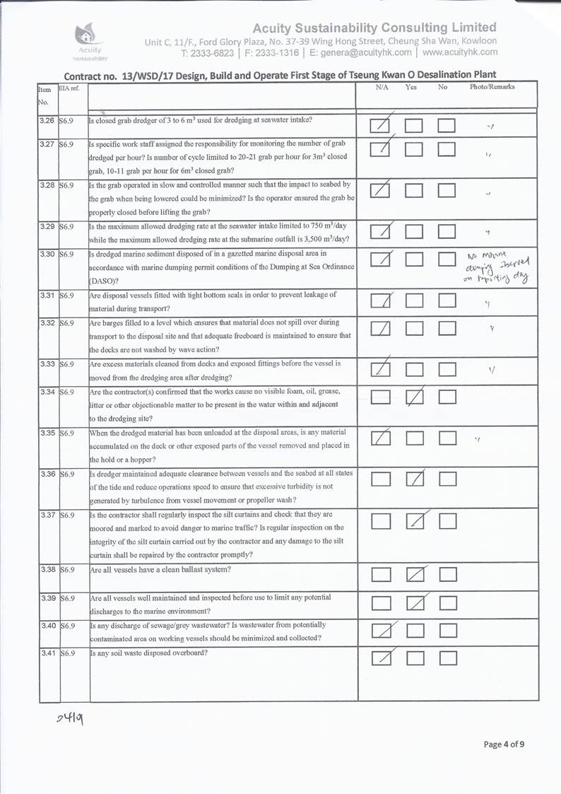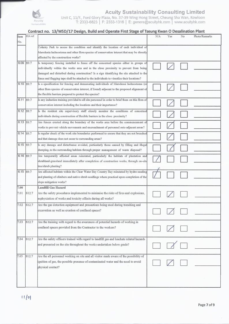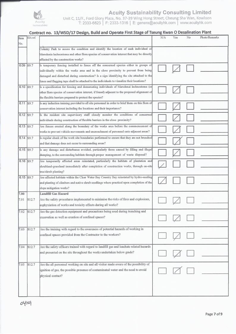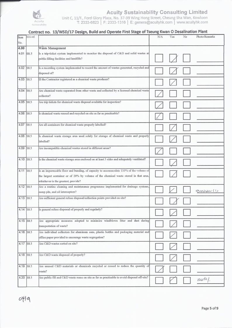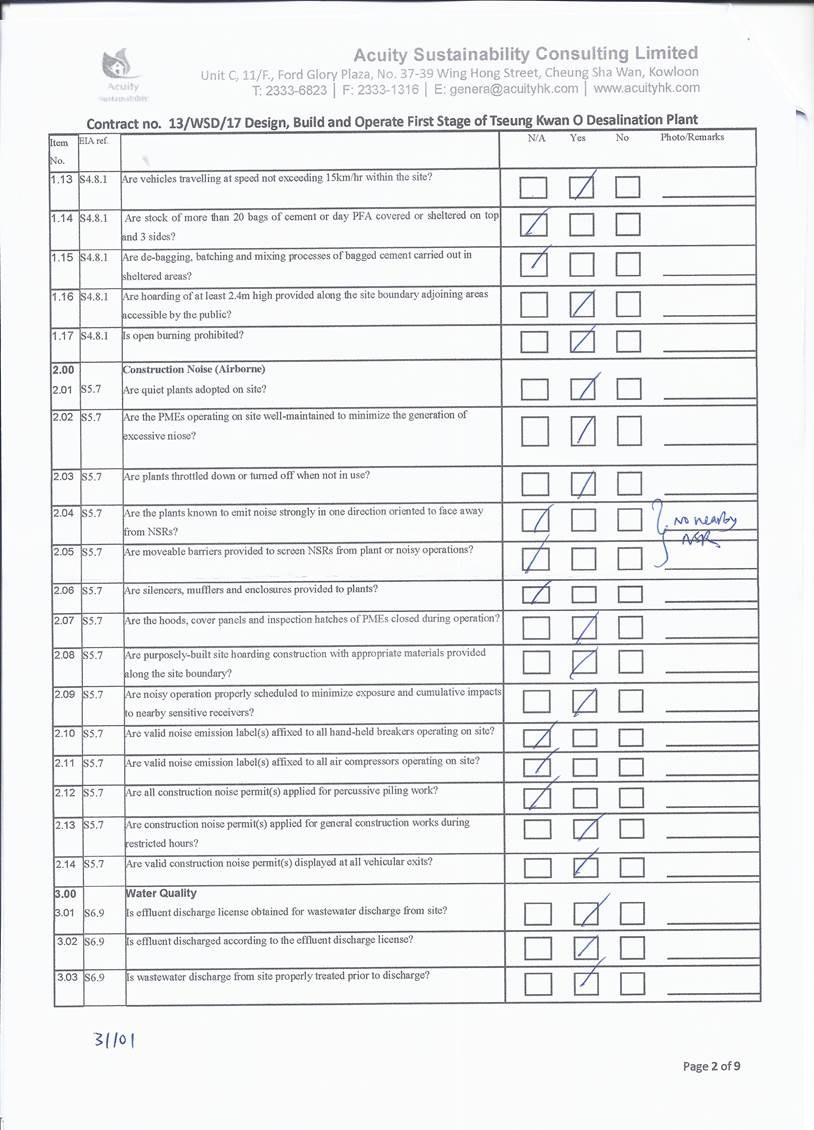 A2. In accordance with the Environmental Monitoring and Audit (EM&A) Manual for the Contract, EM&A works for marine water quality, noise, waste management and ecology should be carried out by Environmental Team (ET), Acuity Sustainability Consulting Limited (ASCL), during the construction phase of the Contract.