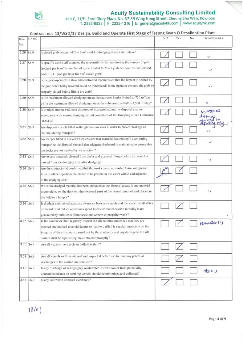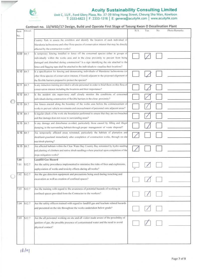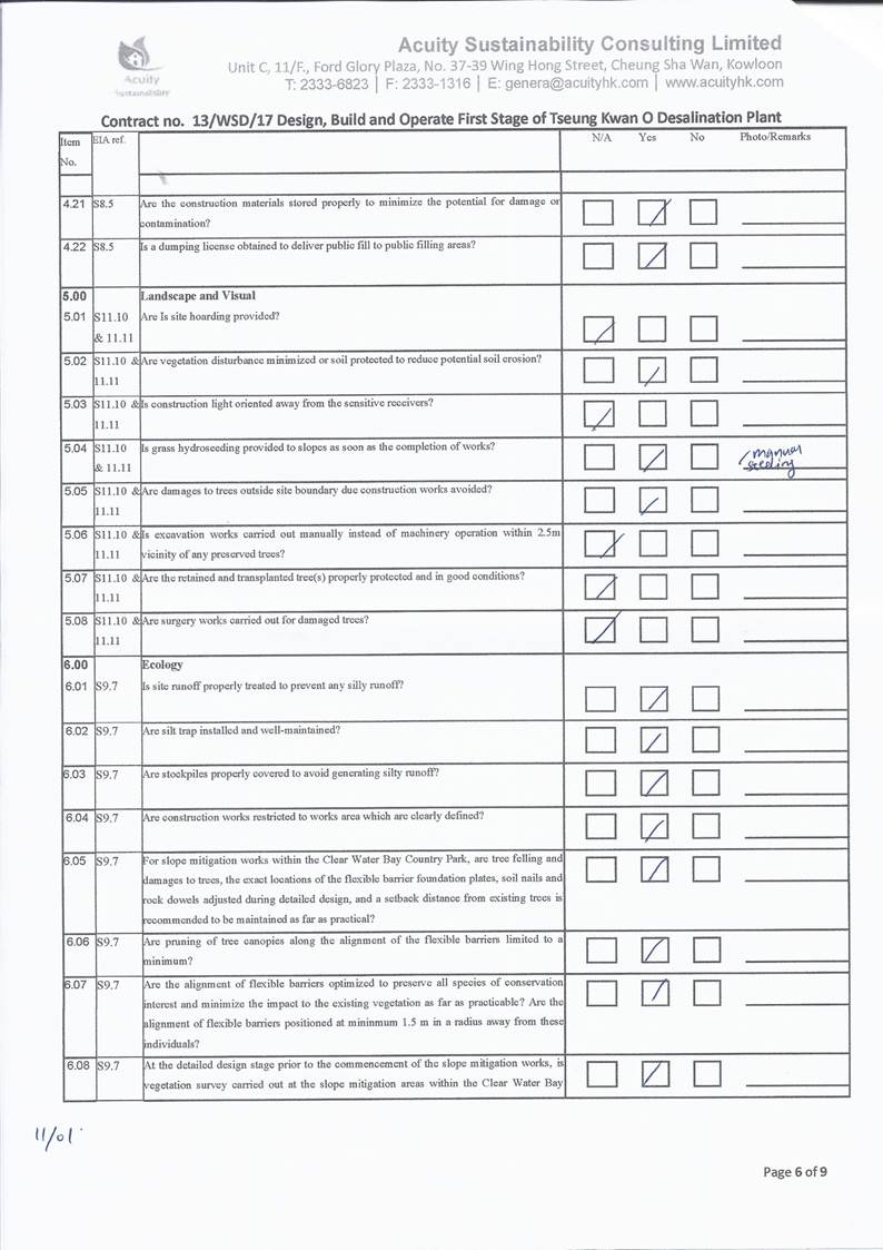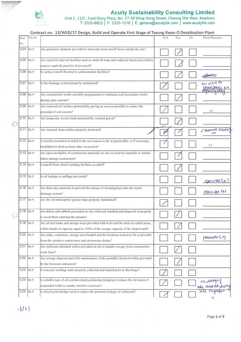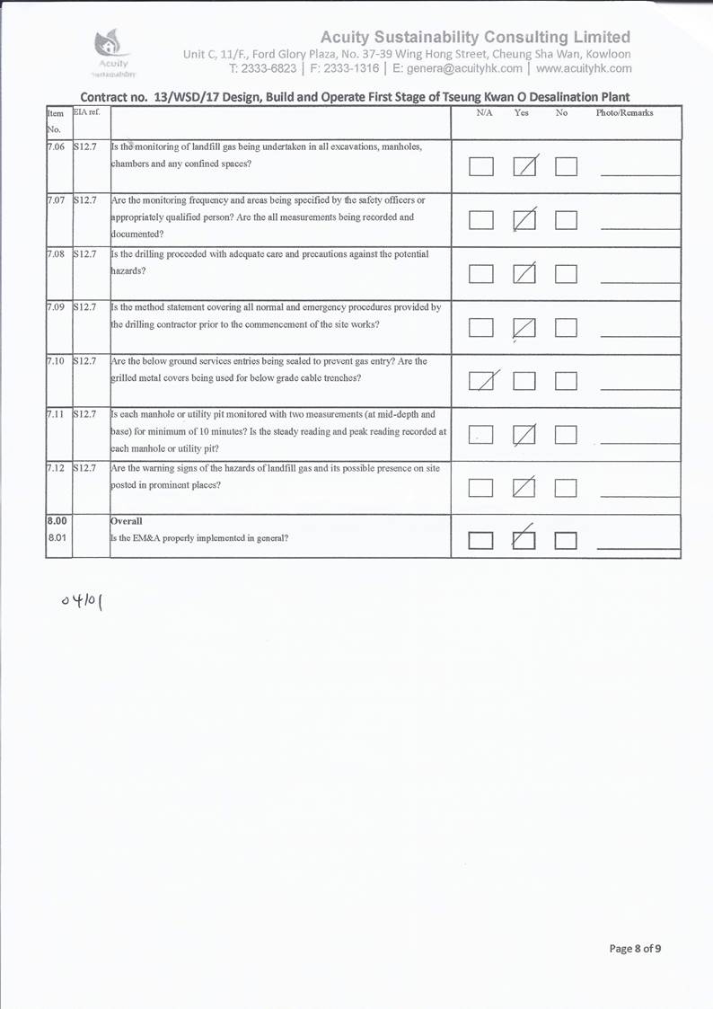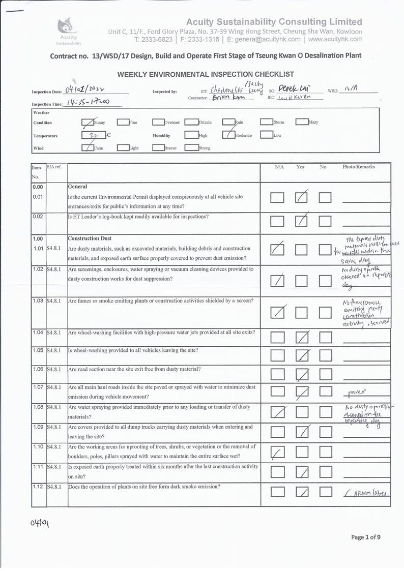 A2. In accordance with the Environmental Monitoring and Audit (EM&A) Manual for the Contract, EM&A works for marine water quality, noise, waste management and ecology should be carried out by Environmental Team (ET), Acuity Sustainability Consulting Limited (ASCL), during the construction phase of the Contract.