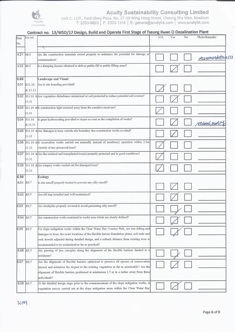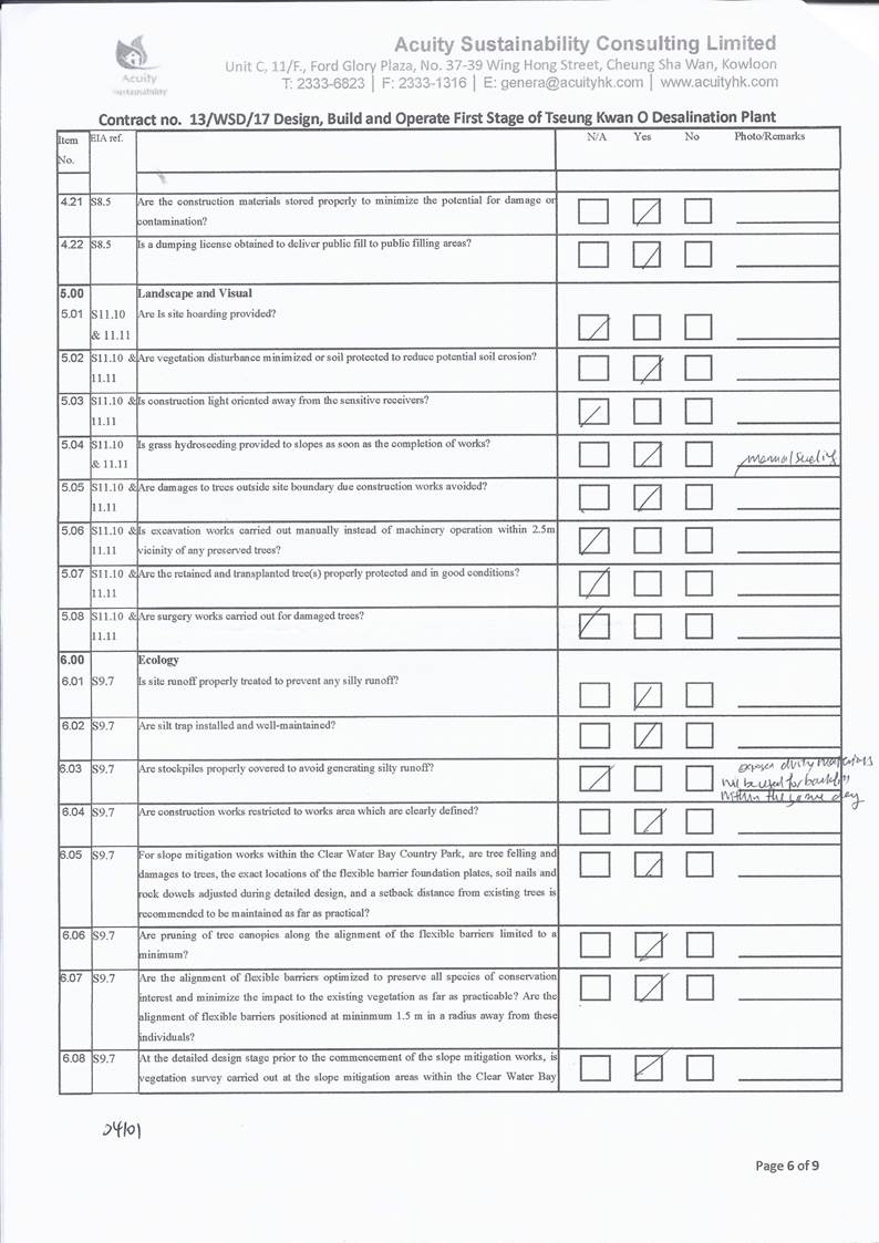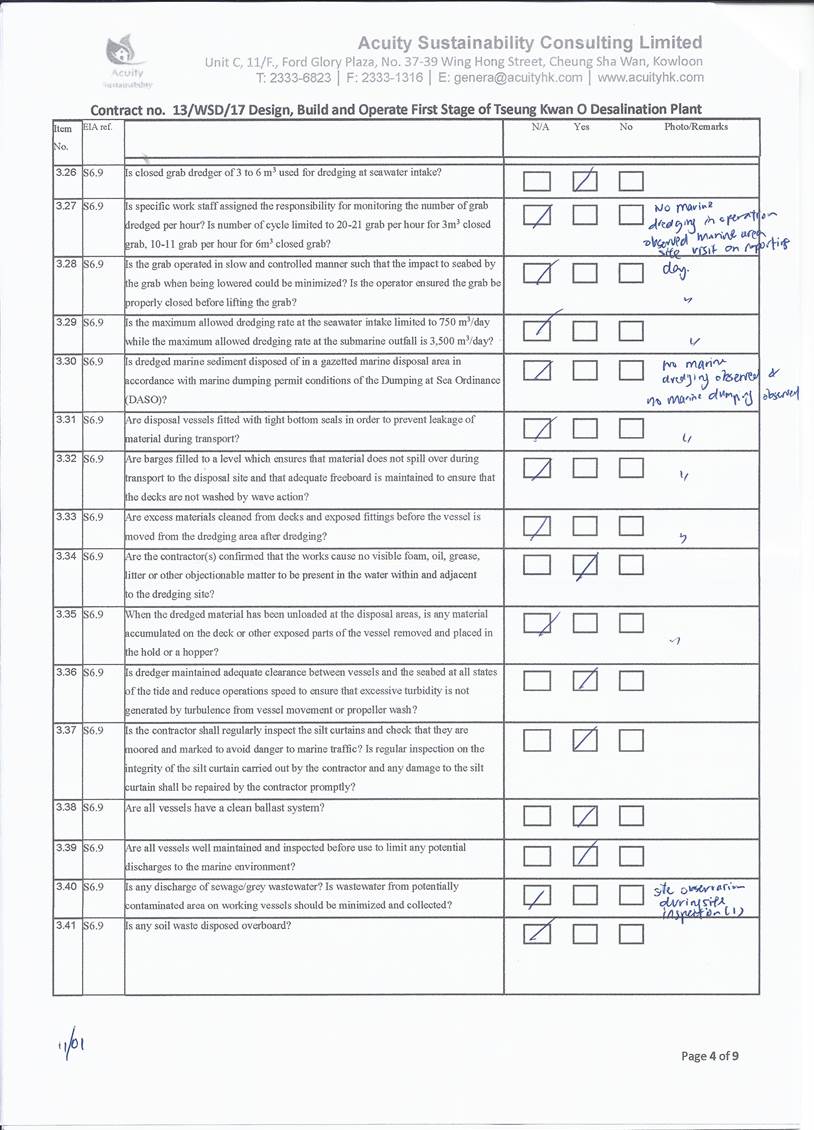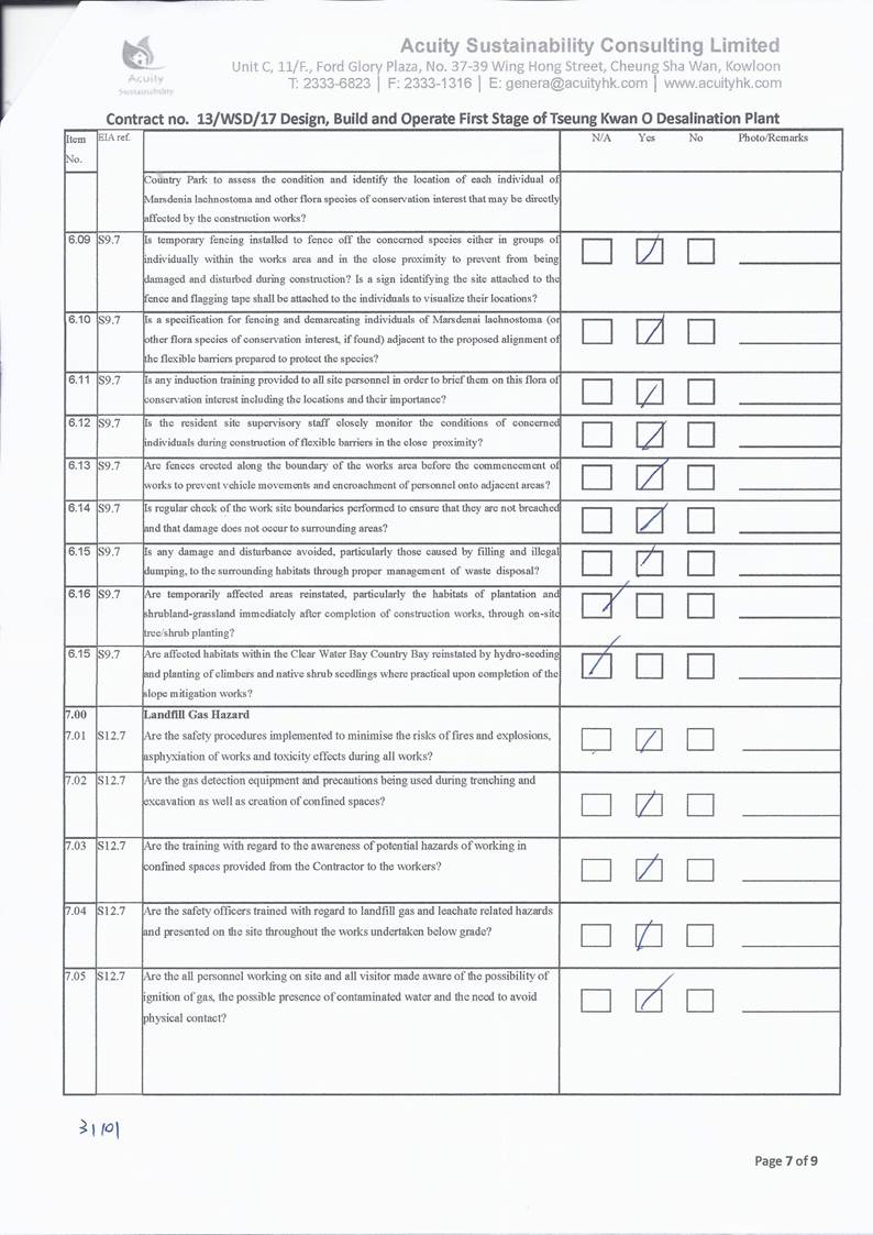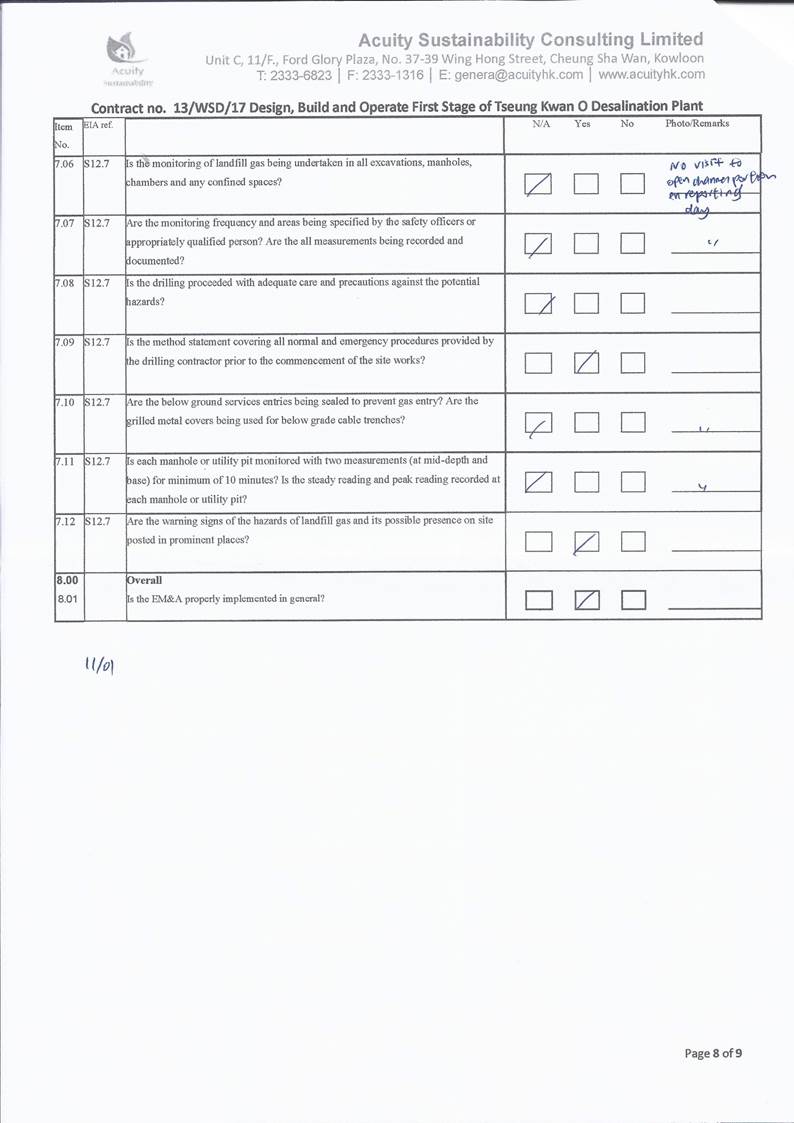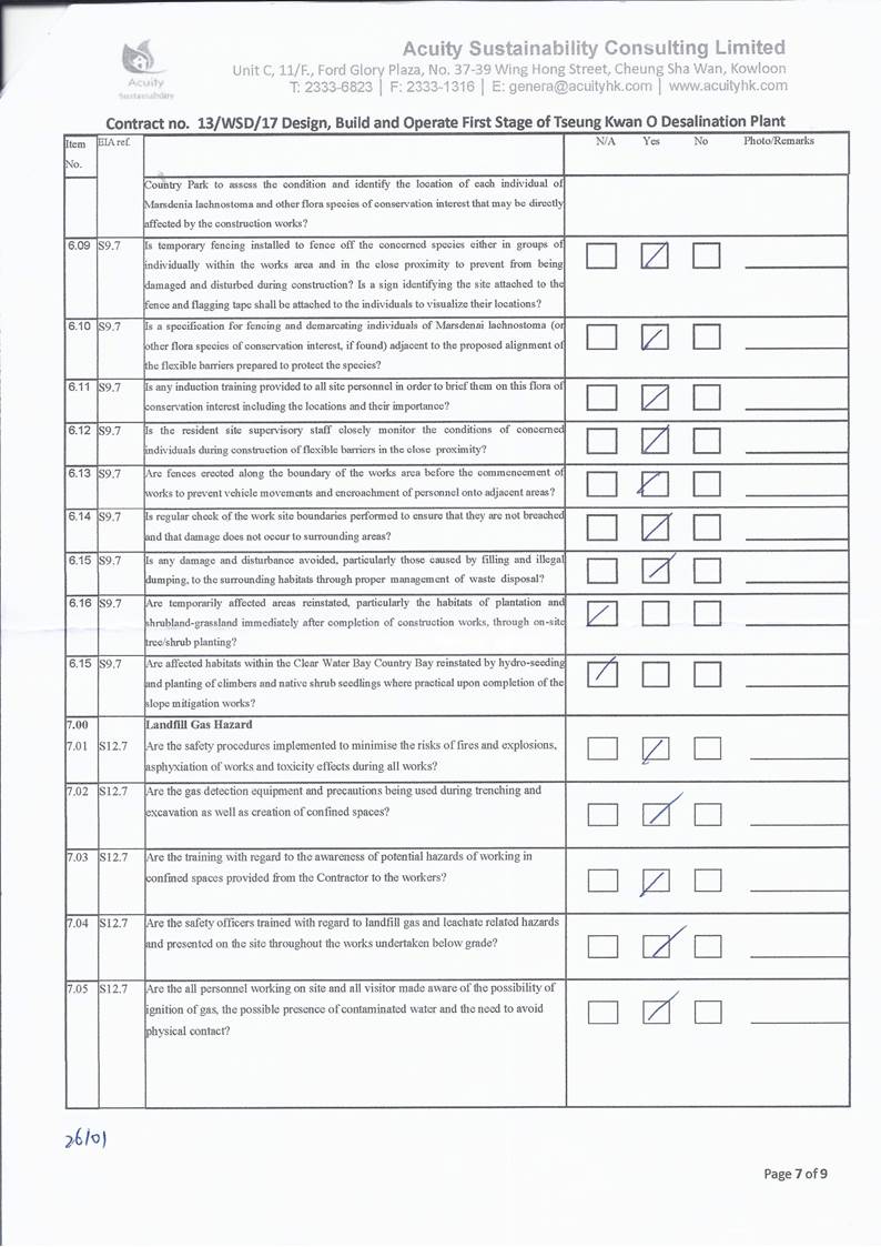 A2. In accordance with the Environmental Monitoring and Audit (EM&A) Manual for the Contract, EM&A works for marine water quality, noise, waste management and ecology should be carried out by Environmental Team (ET), Acuity Sustainability Consulting Limited (ASCL), during the construction phase of the Contract.