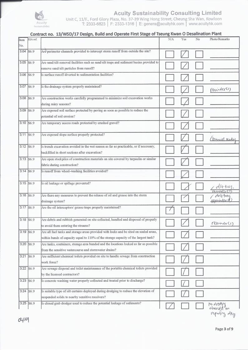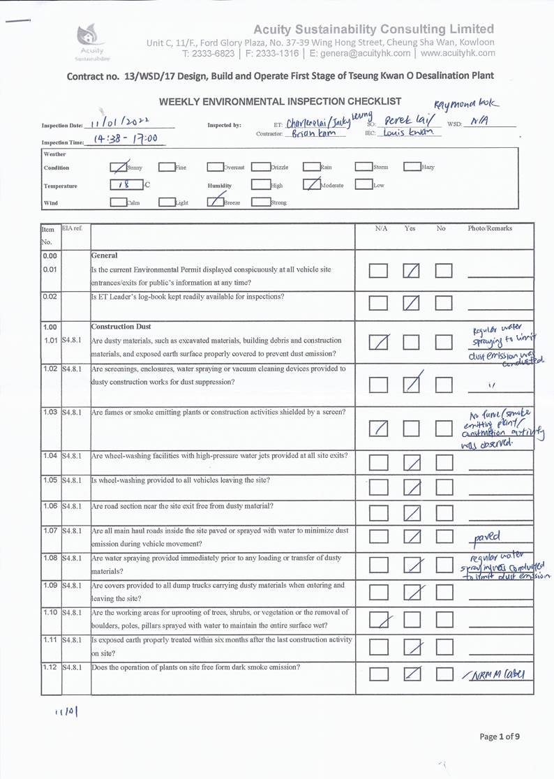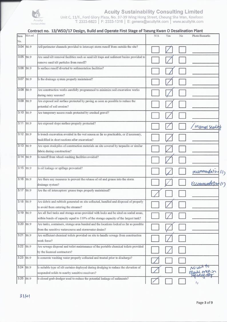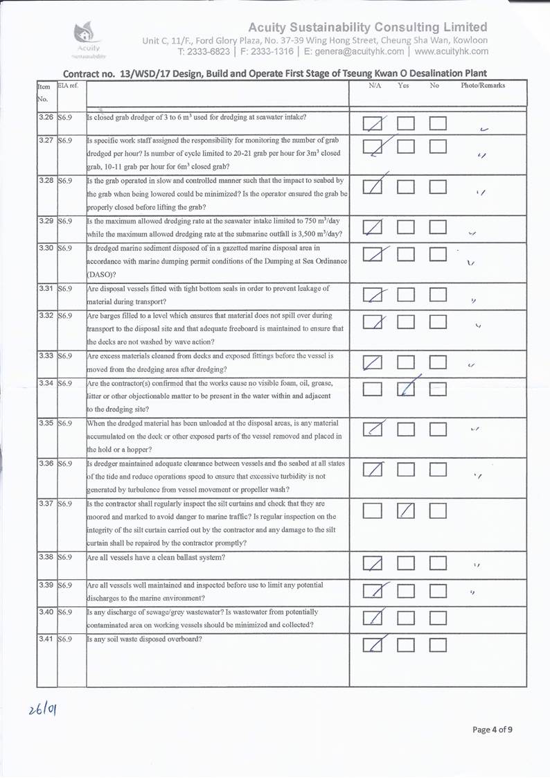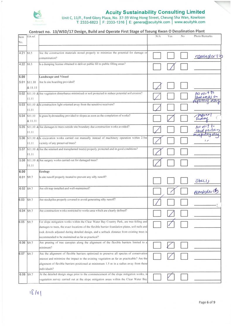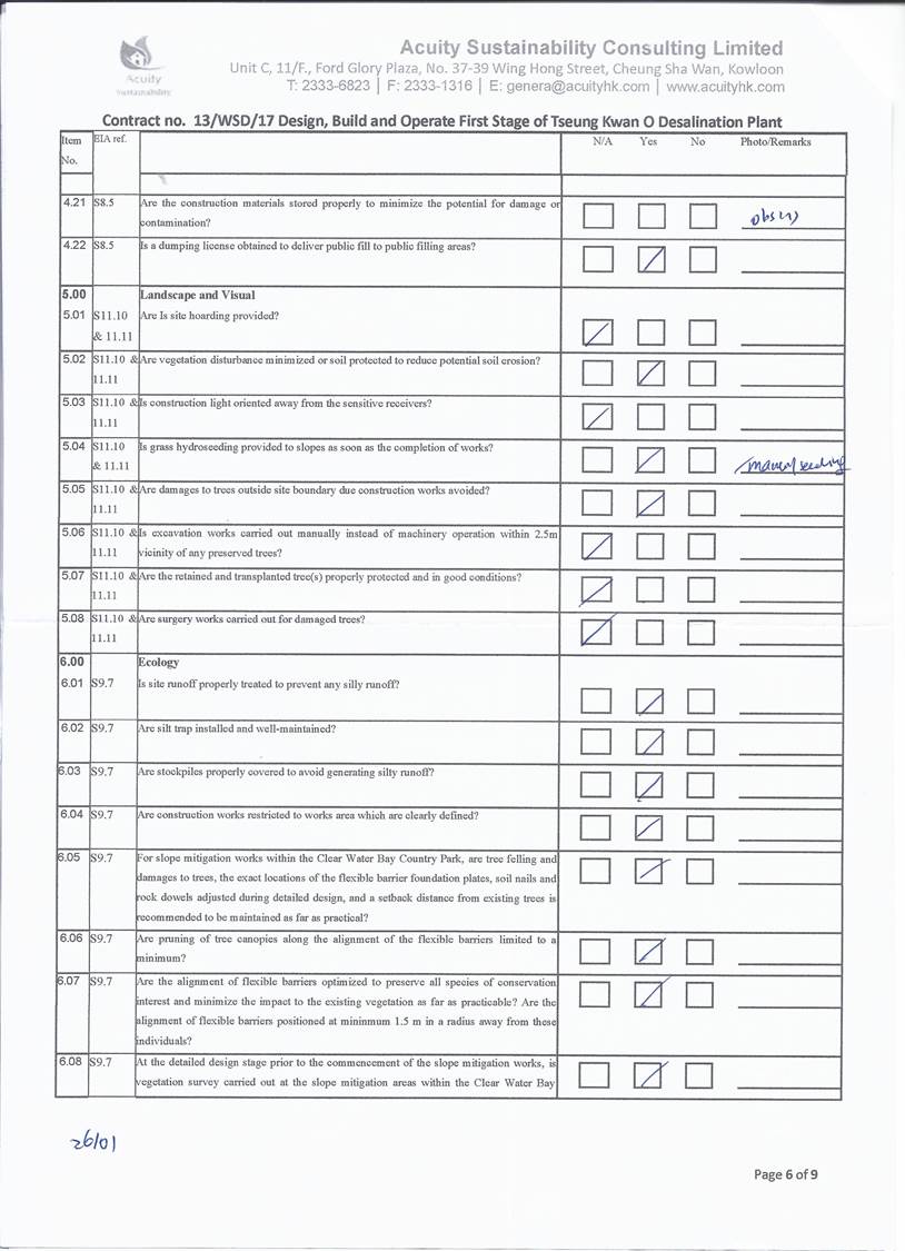 A2. In accordance with the Environmental Monitoring and Audit (EM&A) Manual for the Contract, EM&A works for marine water quality, noise, waste management and ecology should be carried out by Environmental Team (ET), Acuity Sustainability Consulting Limited (ASCL), during the construction phase of the Contract.