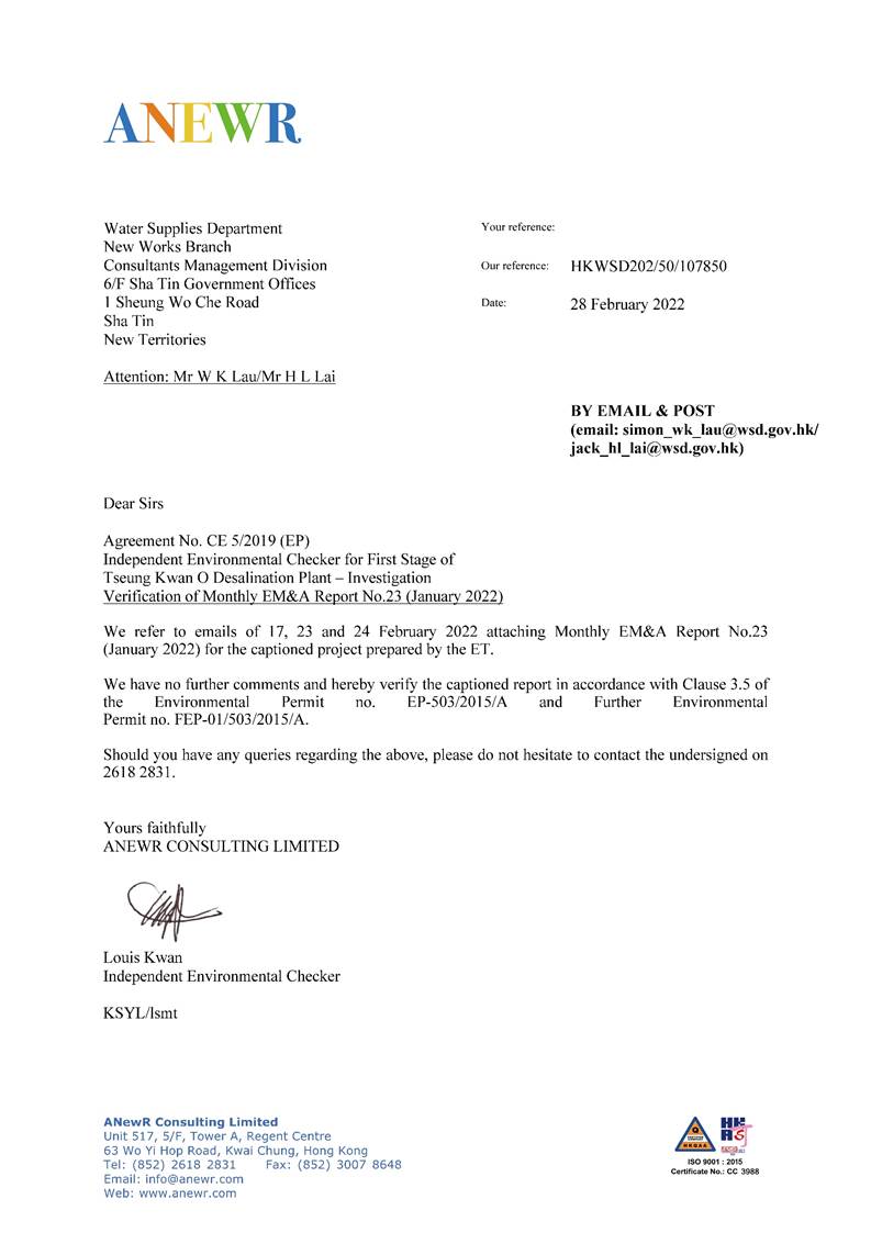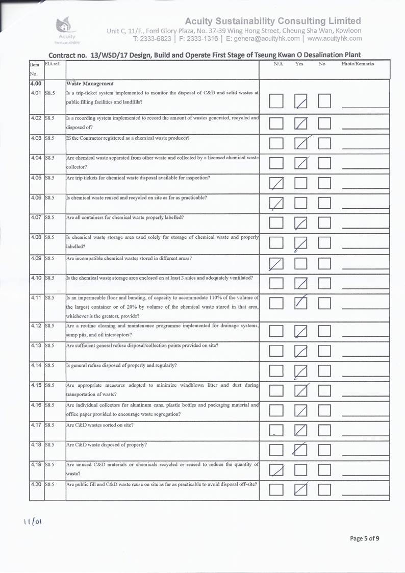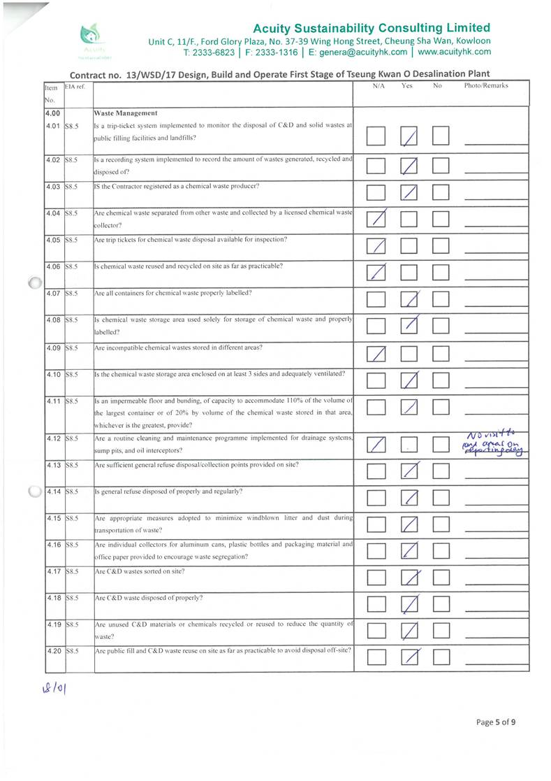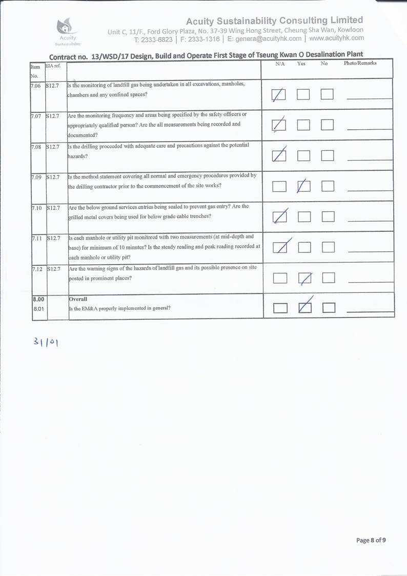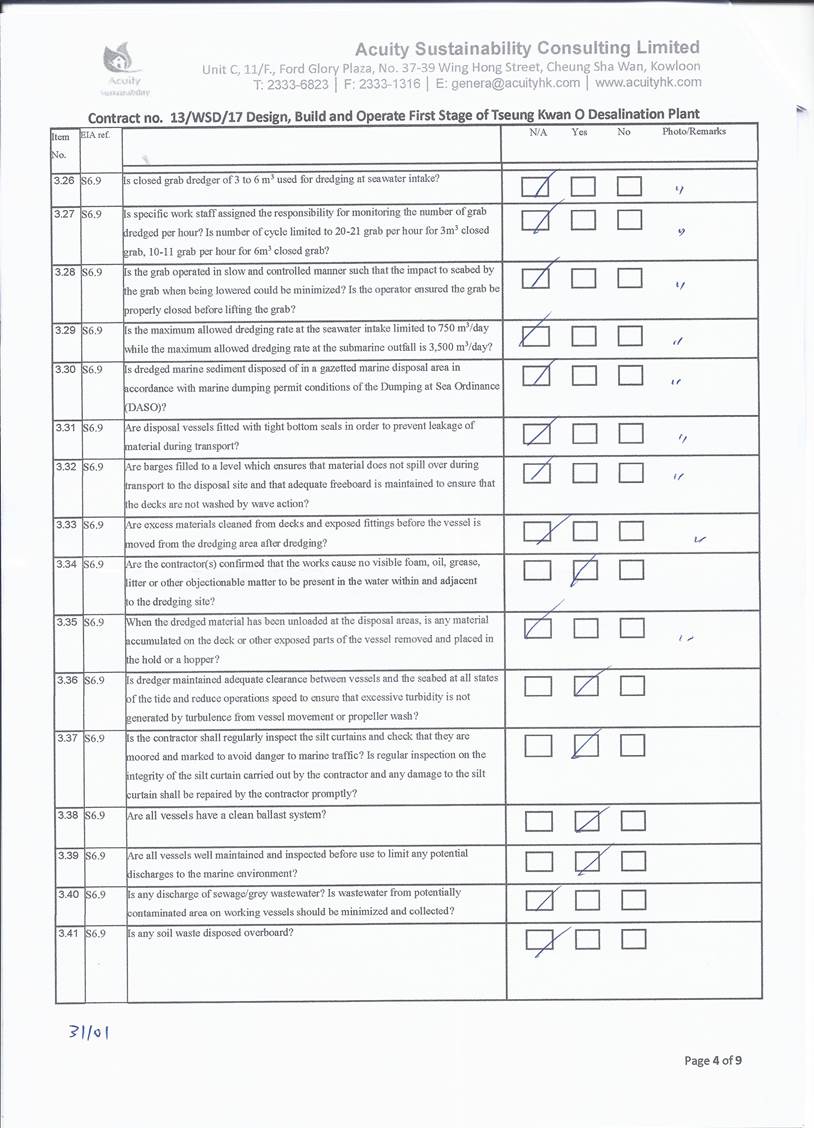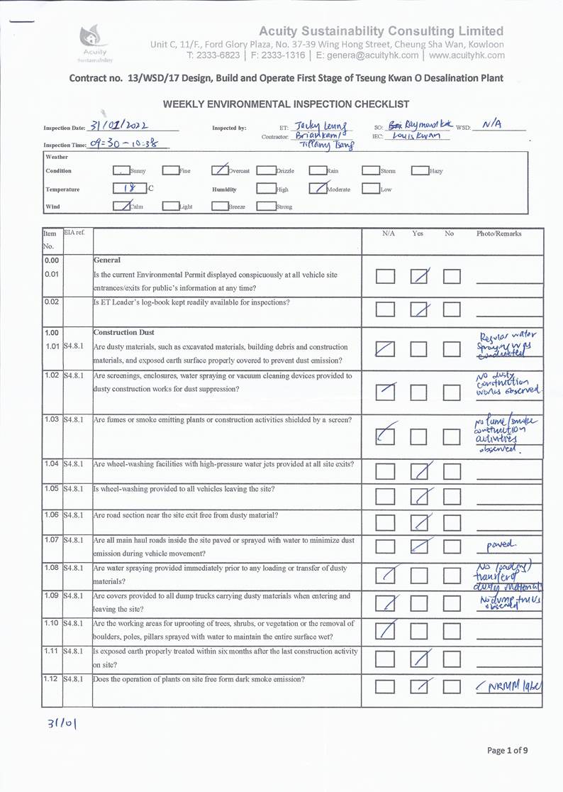 A2. In accordance with the Environmental Monitoring and Audit (EM&A) Manual for the Contract, EM&A works for marine water quality, noise, waste management and ecology should be carried out by Environmental Team (ET), Acuity Sustainability Consulting Limited (ASCL), during the construction phase of the Contract.