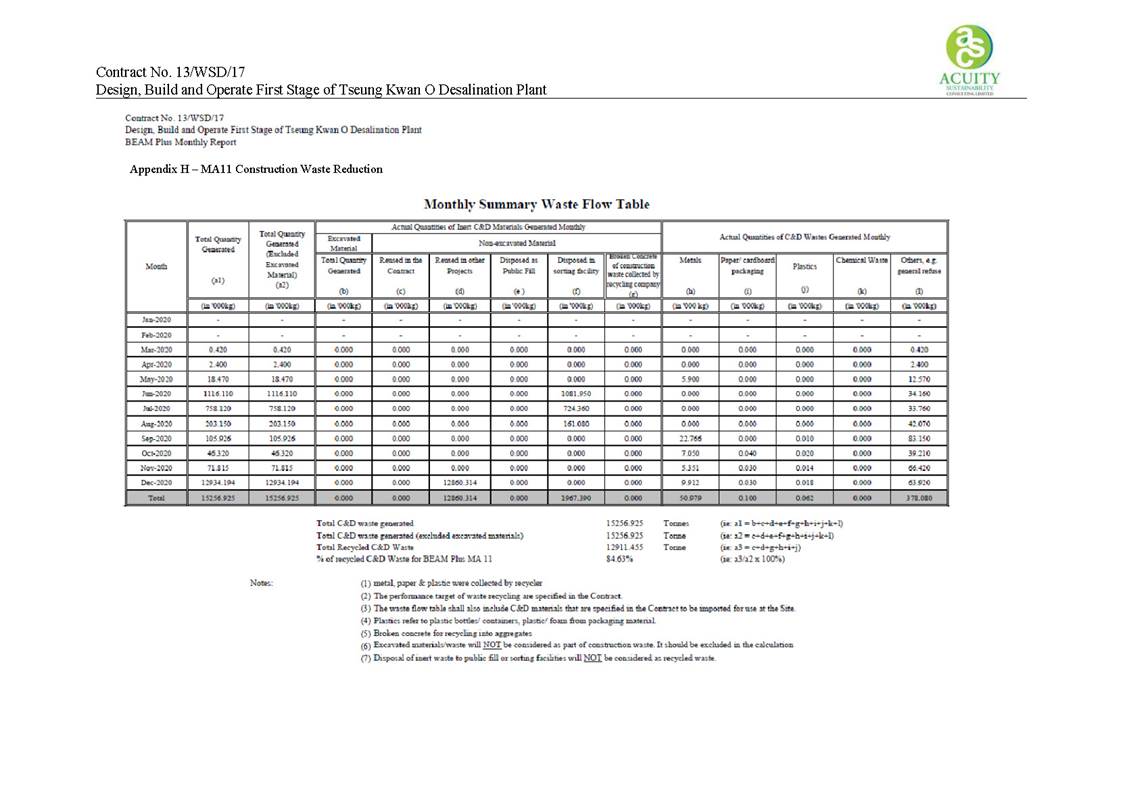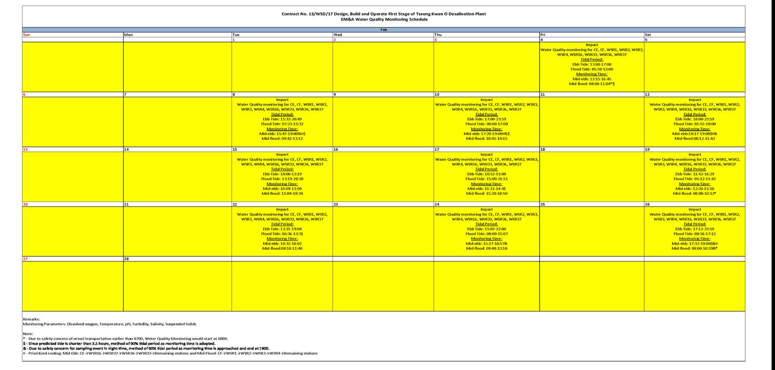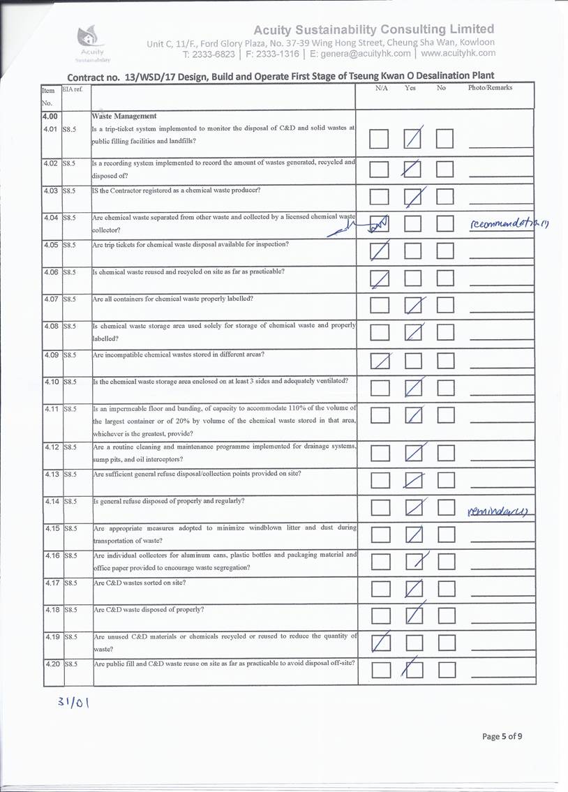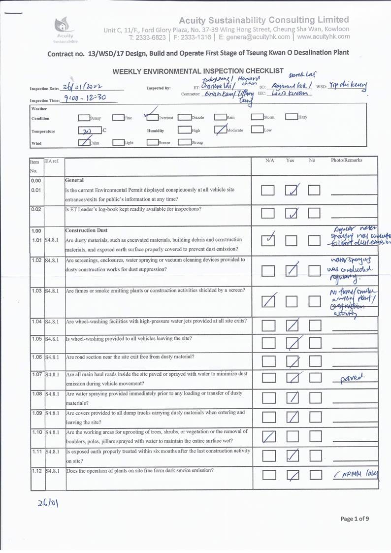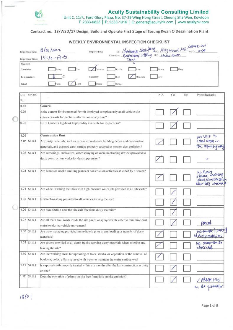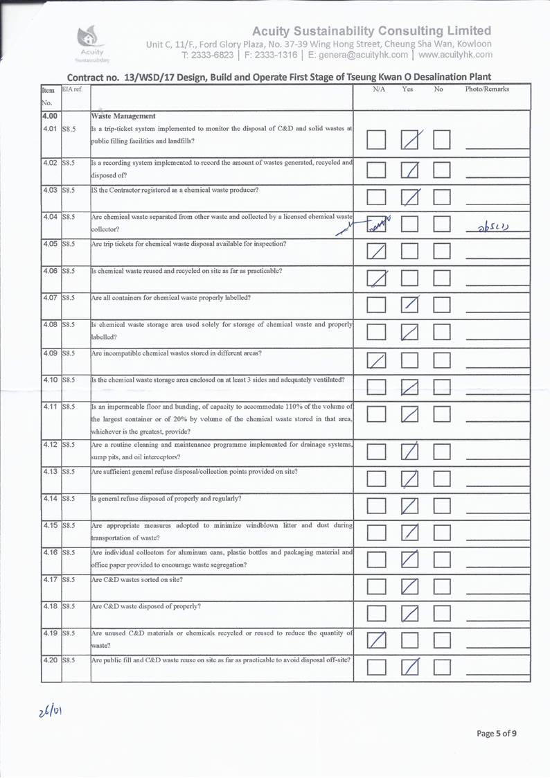A2. In accordance with the Environmental Monitoring and Audit (EM&A) Manual for the Contract, EM&A works for marine water quality, noise, waste management and ecology should be carried out by Environmental Team (ET), Acuity Sustainability Consulting Limited (ASCL), during the construction phase of the Contract.