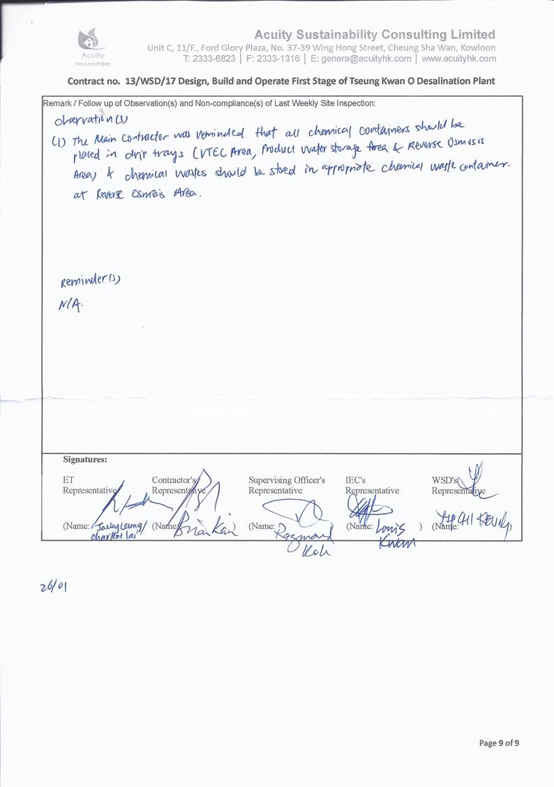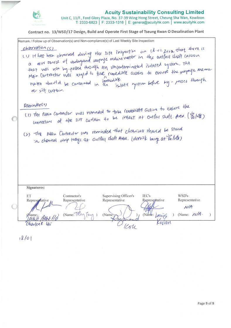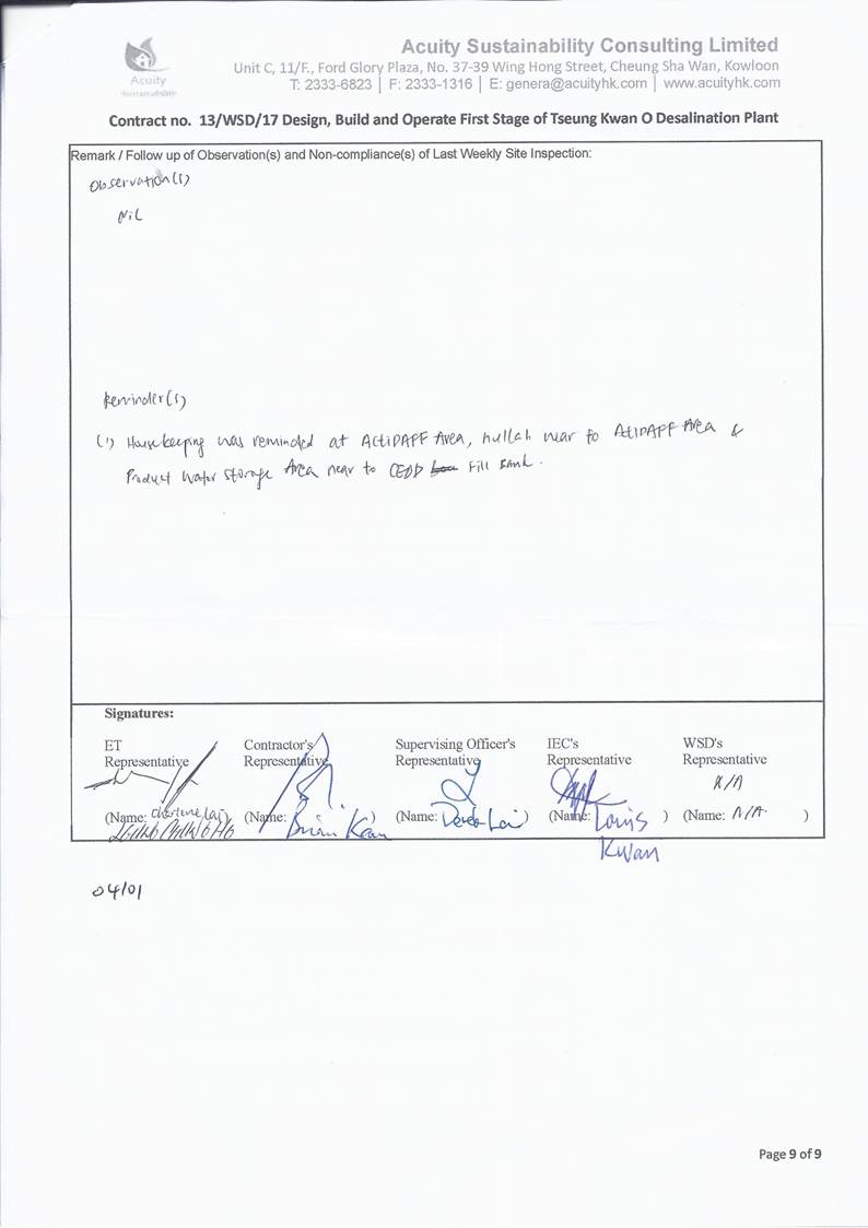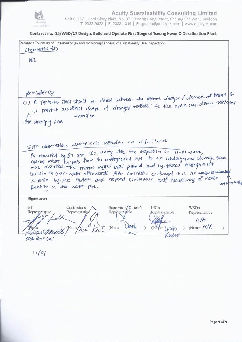 A9. The EM&A works for water quality were conducted during the reporting period in accordance with the EM&A Manual.