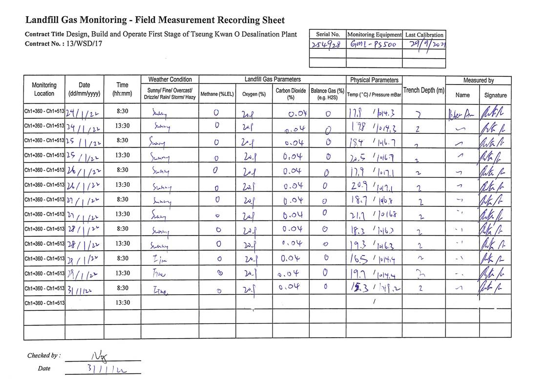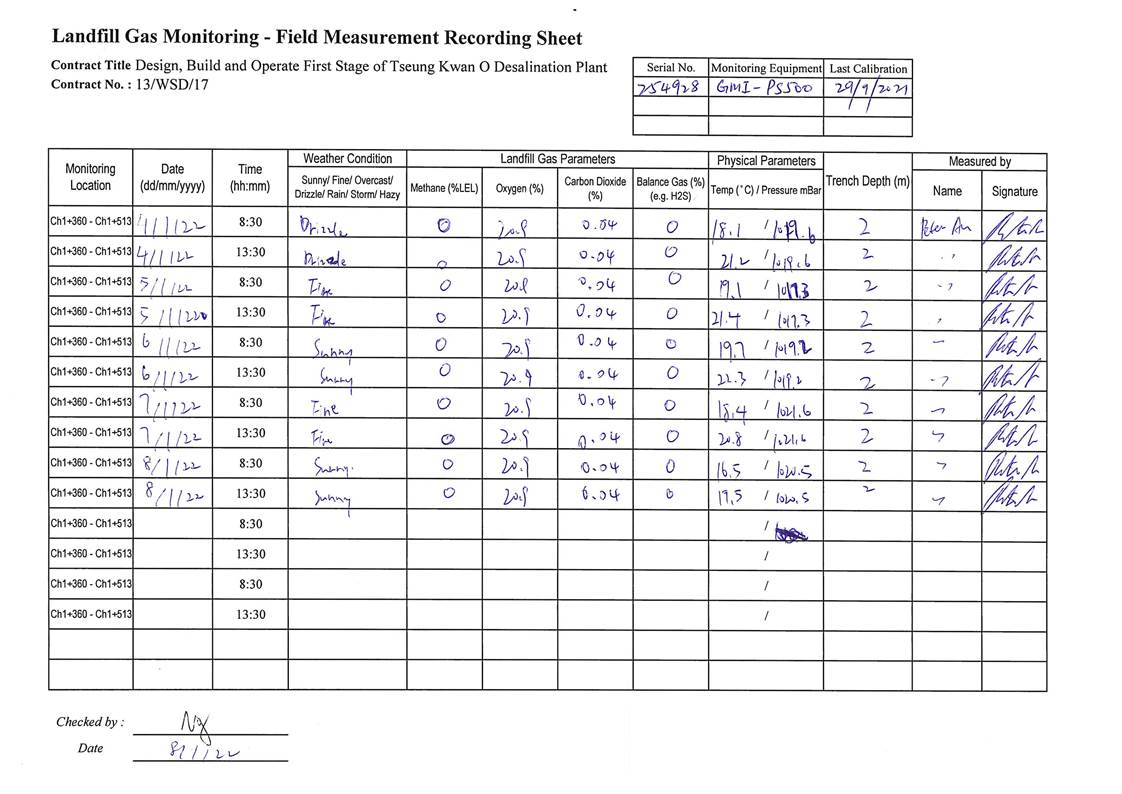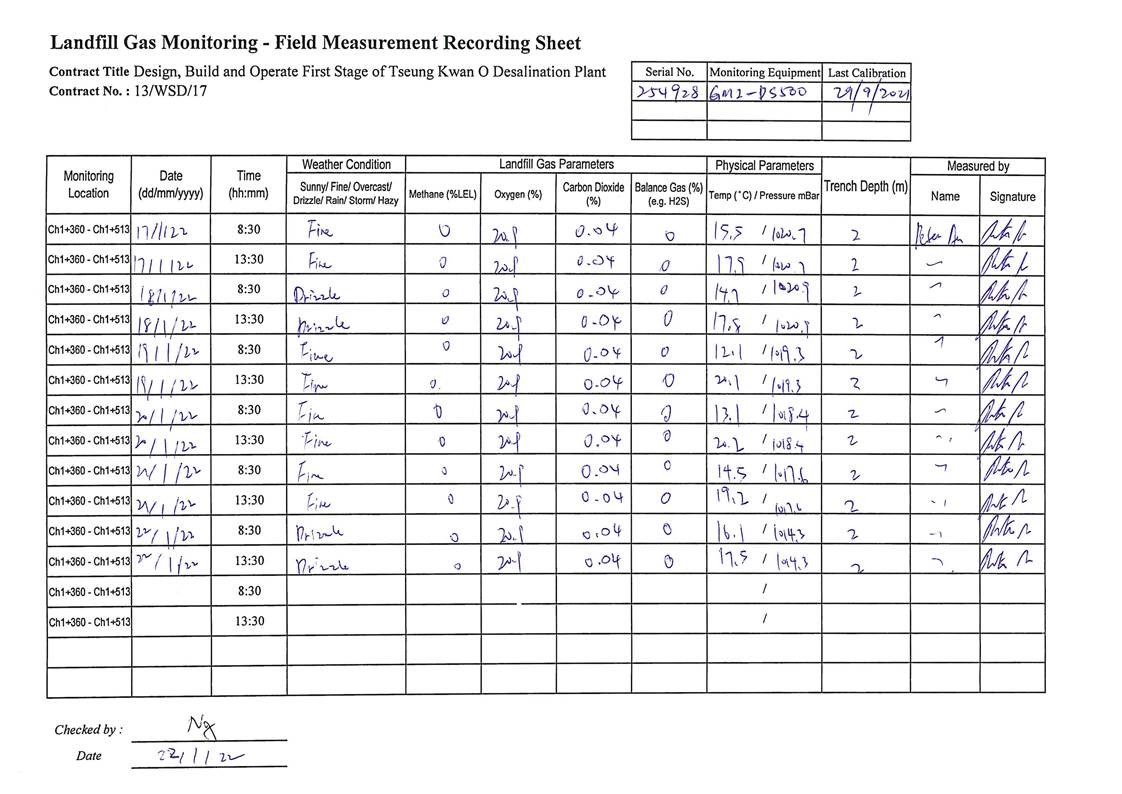 A15.In this reporting period, 47 times of landfill gas monitoring were recorded at Wan Po Road (Ch1+360 - Ch1+513). No exceedance of action and limit levels for methane, oxygen and carbon dioxide was observed. Monitoring was conducted during excavations at 1m depth or more within the consultation zone and whenever workers entered the excavation on the day.