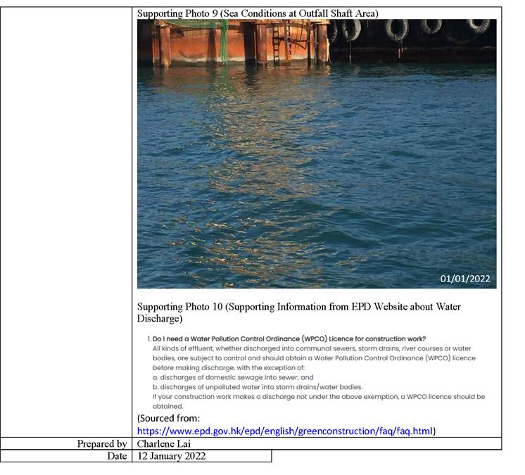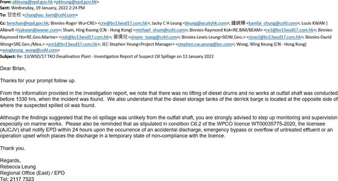 A14.ACJCJ¡¦s Environmental Office received a text message on 14 January 2022 from EPD inspector claiming that susceptible oil spillage at the water surface nearby to Outfall Shaft was observed during their routine drone check on 13 January 2022. The message from EPD was relayed to ET by AJCJV on 15 January 2022. Immediate investigation by AJCJV has been made after the acknowledgement of the incident, whilst implementing emergency clean up measure on any residue oil spillage. After investigation, the oil spillage was unlikely originated from the Outfall Shaft. The incident may therefore be considered as non-project related. Detail of the incident could be referring to Appendix O.