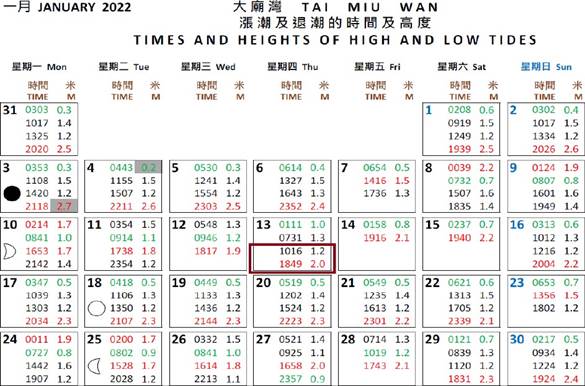 Figure 2: Tidal Information at the Nearest Tai Miu Wan Station from Hong Kong Observatory on 13 January
