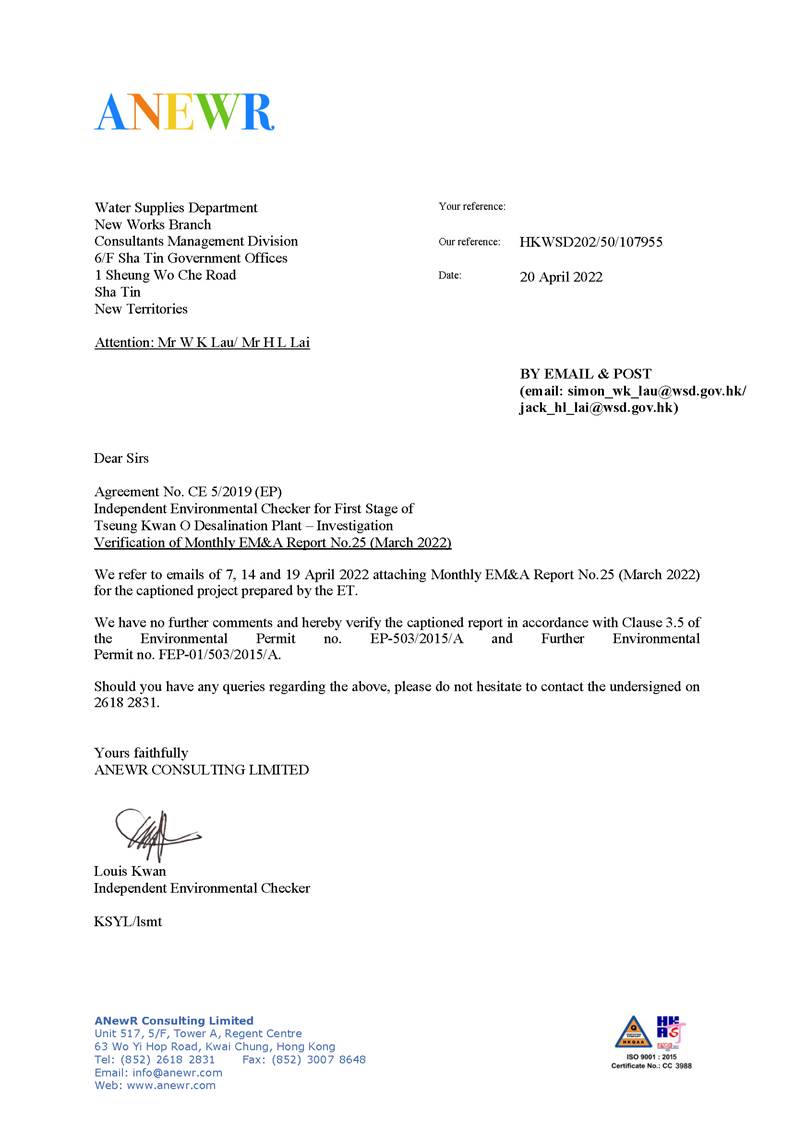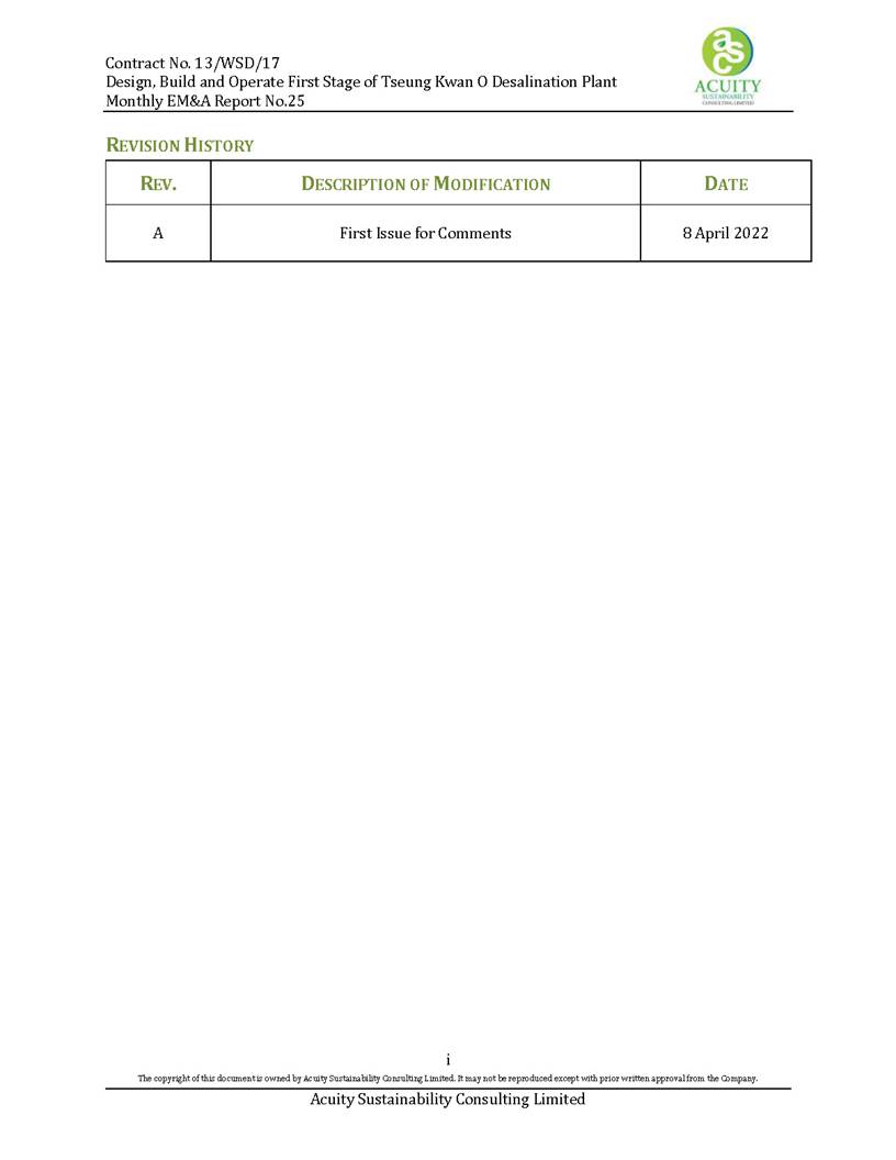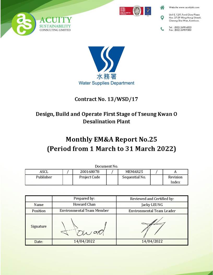 A3. This is the 25th Monthly EM&A Report, prepared by ASCL, for the Contract summarizing the monitoring results and audit findings of the EM&A programme at and around Tseung Kwan O Area 137 (TKO 137) during the reporting period from 1 March 2022 to 31 March 2022.