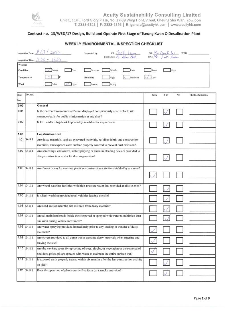 A15. Joint site inspections of the construction work by ET and IEC were carried out on 8, 15, 23 and 30 March 2022 to audit the mitigation measures implementation status. Observations and recommendations were recorded in the site inspection checklists and provided to the contractors together with the appropriate follow-up actions where necessary.
