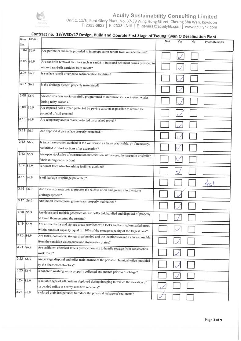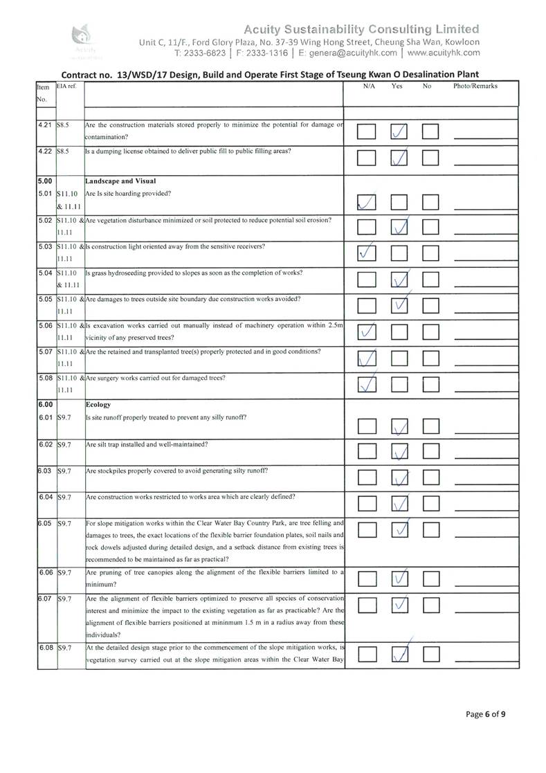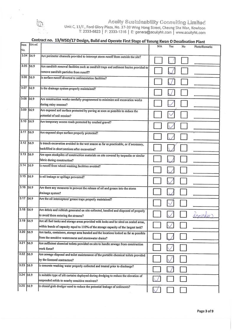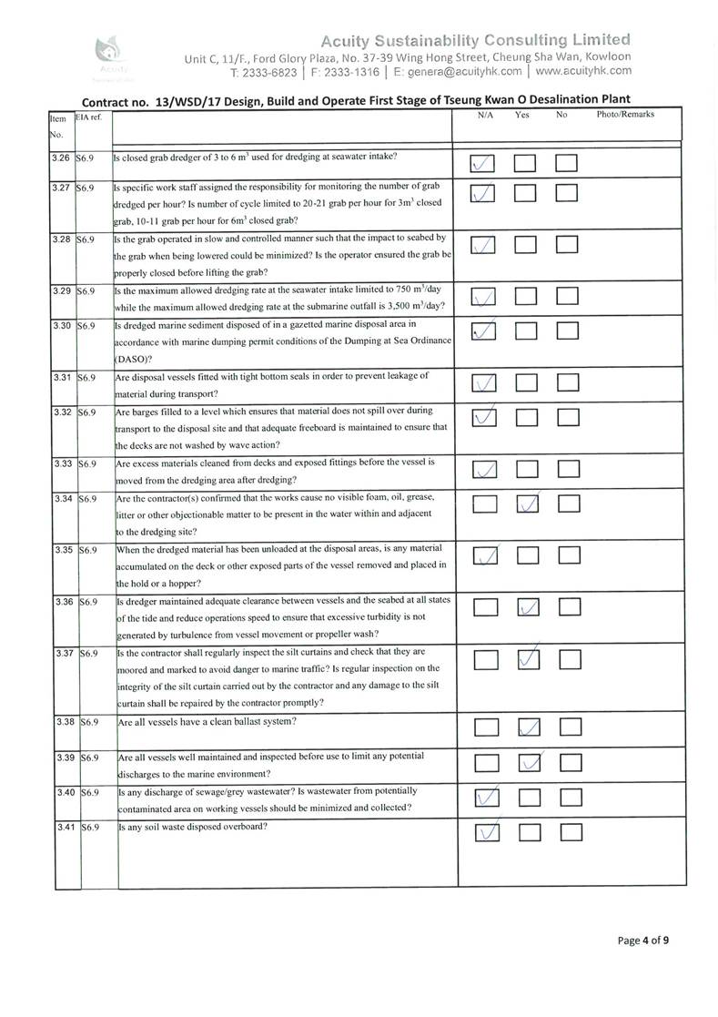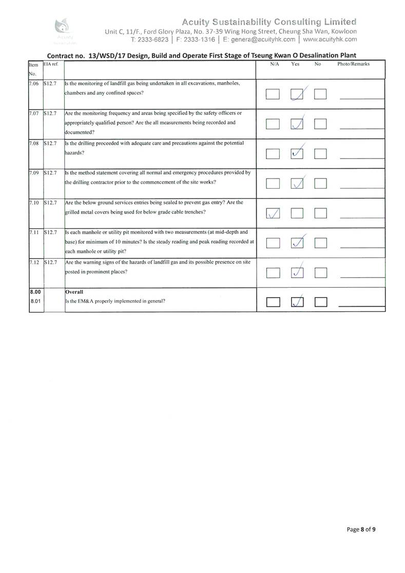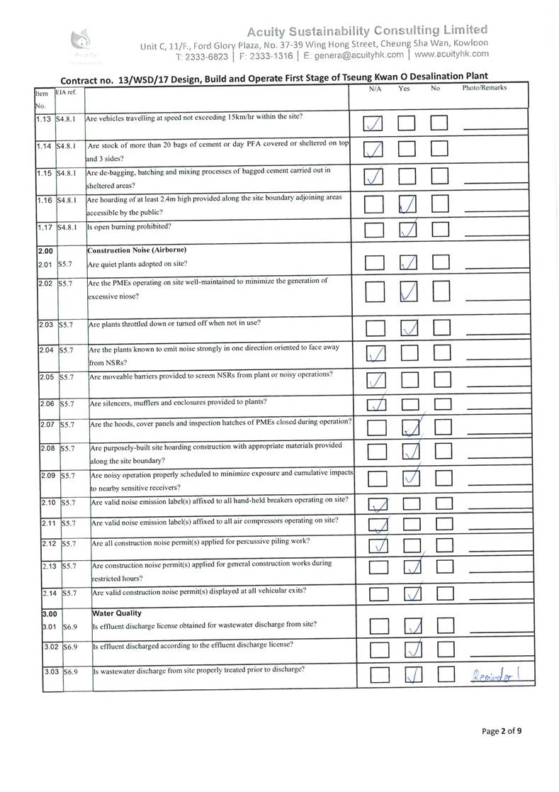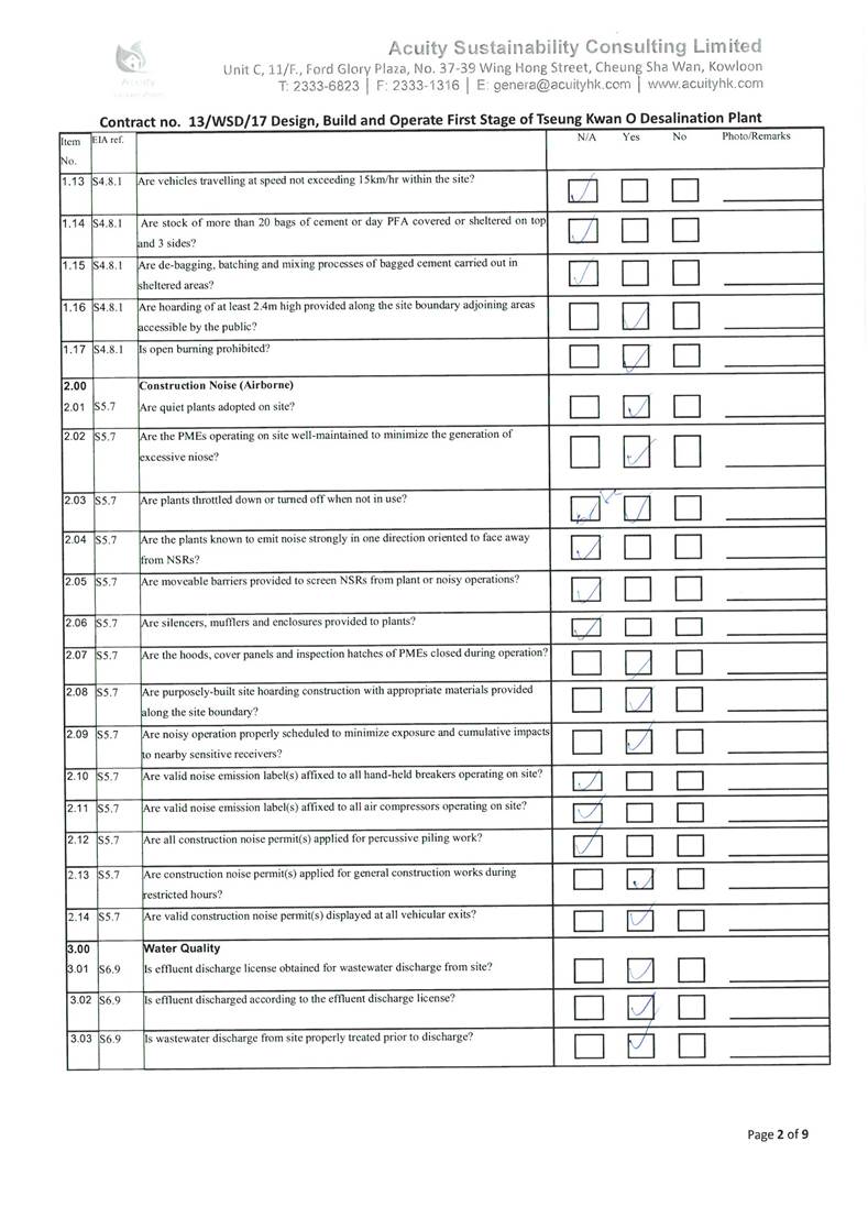 A2. In accordance with the Environmental Monitoring and Audit (EM&A) Manual for the Contract, EM&A works for marine water quality, noise, waste management and ecology should be carried out by Environmental Team (ET), Acuity Sustainability Consulting Limited (ASCL), during the construction phase of the Contract.