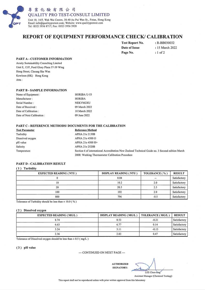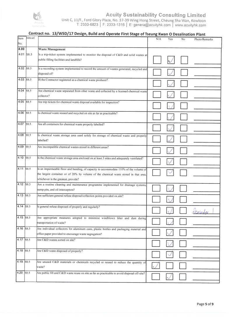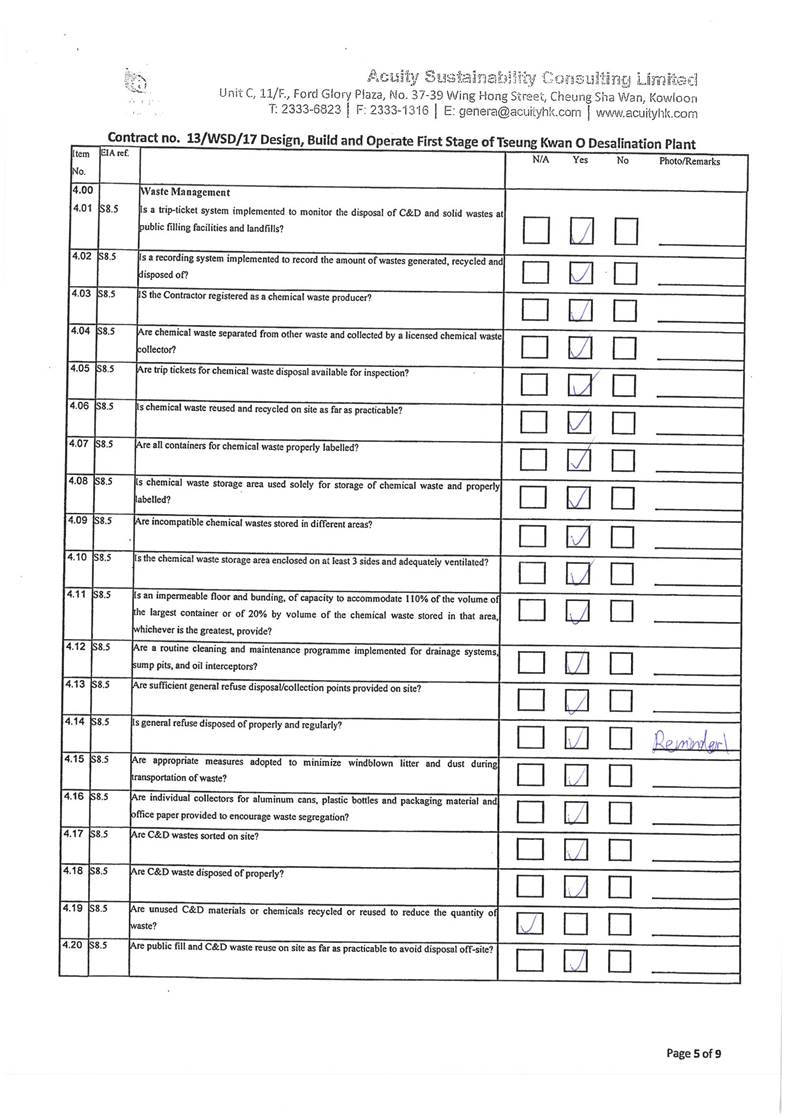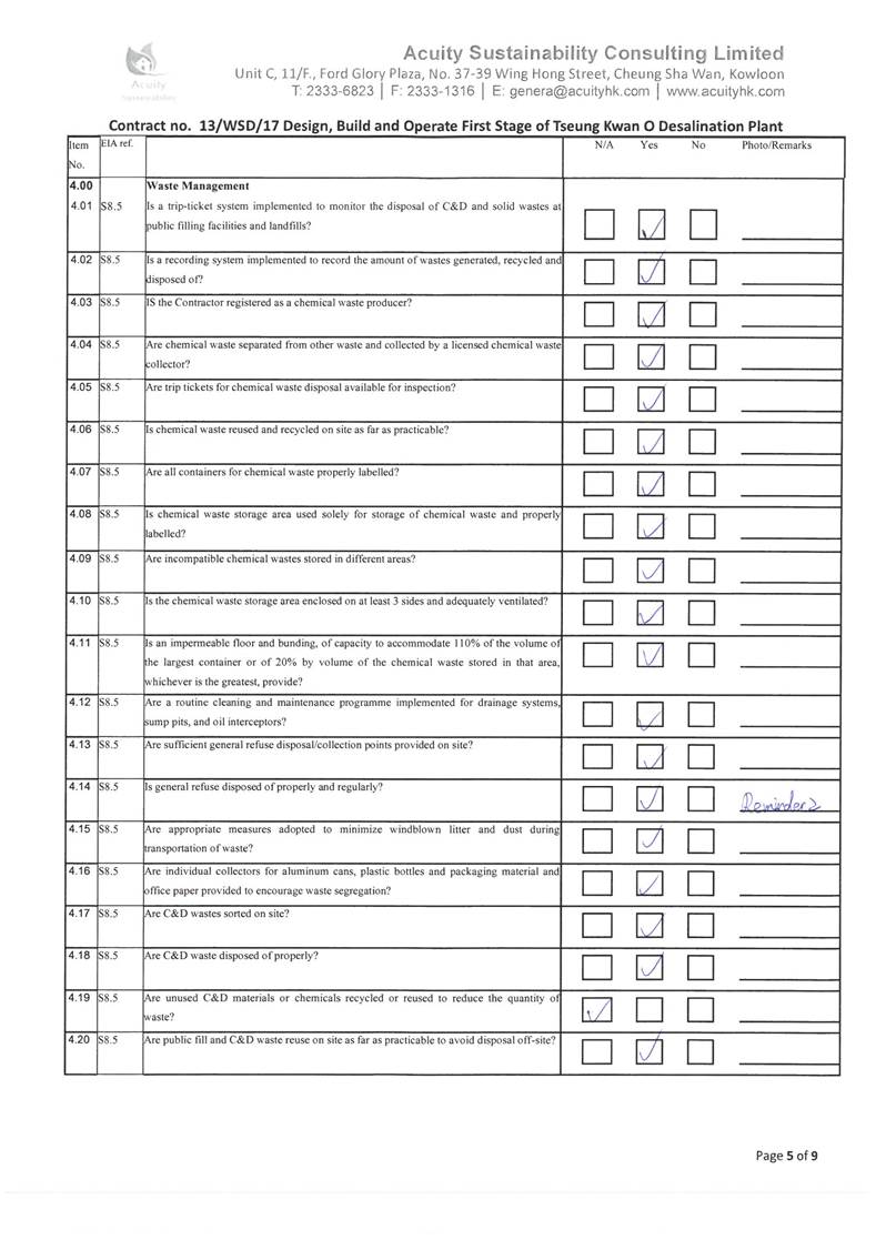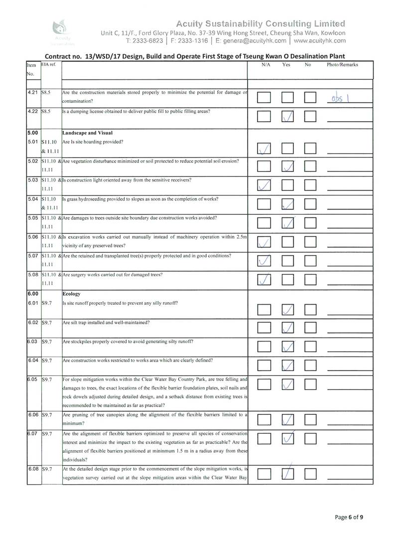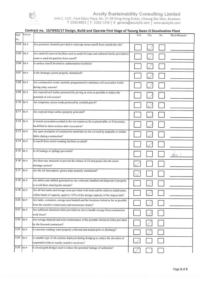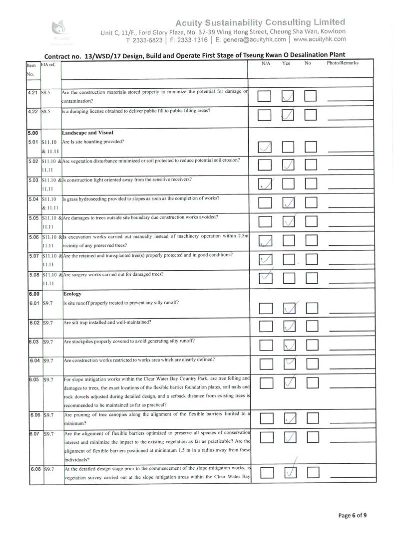 A2. In accordance with the Environmental Monitoring and Audit (EM&A) Manual for the Contract, EM&A works for marine water quality, noise, waste management and ecology should be carried out by Environmental Team (ET), Acuity Sustainability Consulting Limited (ASCL), during the construction phase of the Contract.