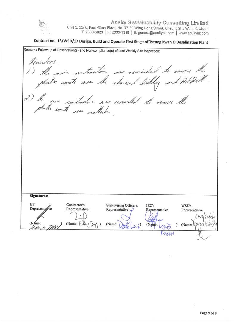 A9. The EM&A works for water quality were conducted during the reporting period in accordance with the EM&A Manual.