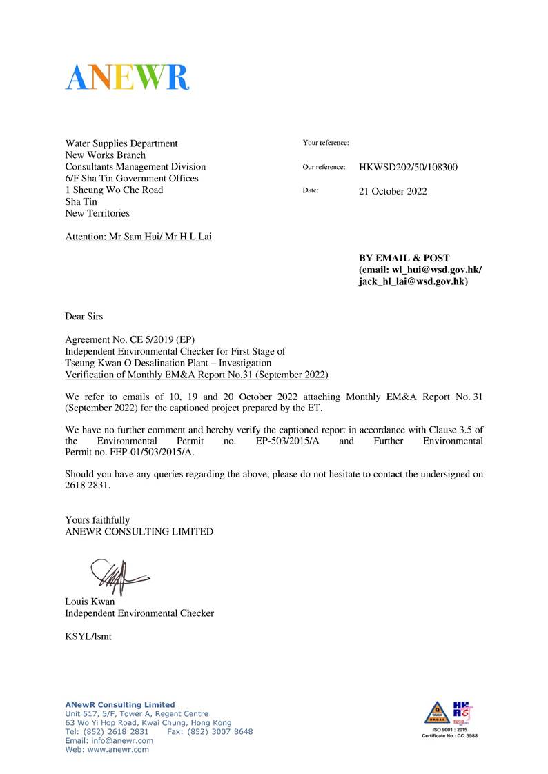 A3. This is the 31st Monthly EM&A Report, prepared by ASCL, for the Contract summarizing the monitoring results and audit findings of the EM&A programme at and around Tseung Kwan O Area 137 (TKO 137) during the reporting period from 1 September 2022 to 30 September 2022.