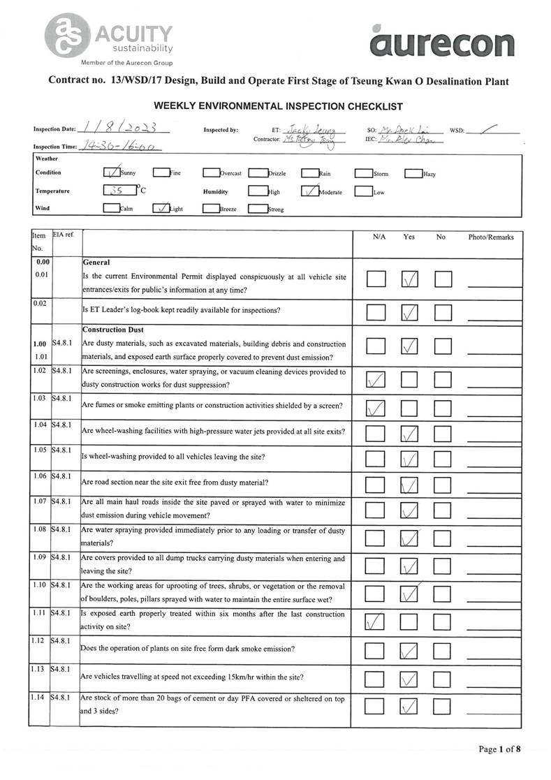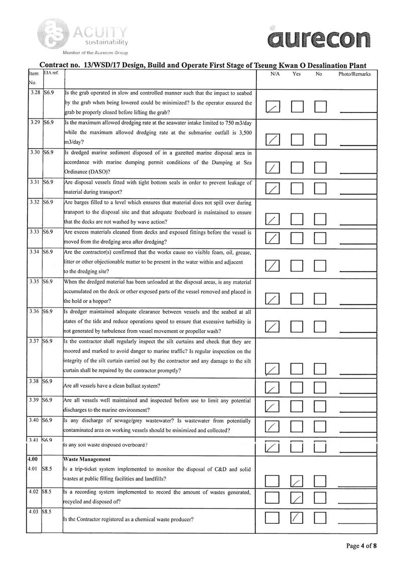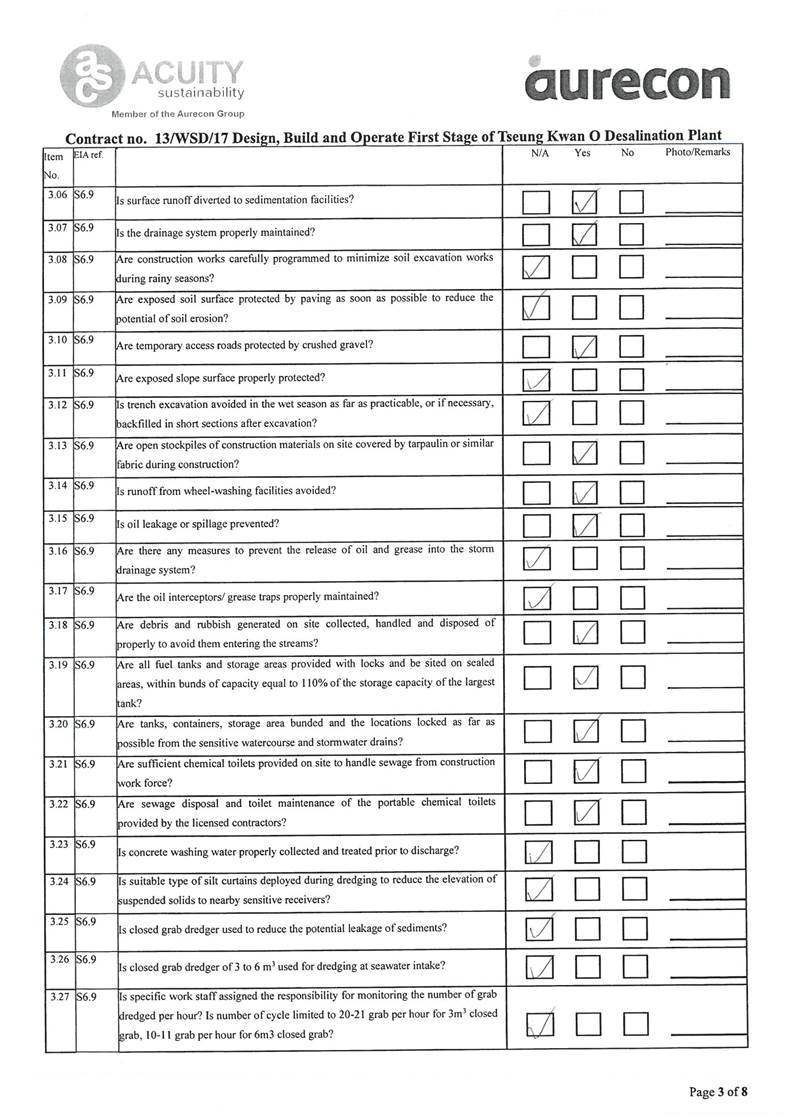 A2. In accordance with the Environmental Monitoring and Audit (EM&A) Manual for the Contract, EM&A works for marine water quality, noise, waste management and ecology should be carried out by Environmental Team (ET), Acuity Sustainability Consulting Limited (ASCL), during the construction phase of the Contract.